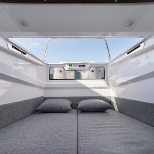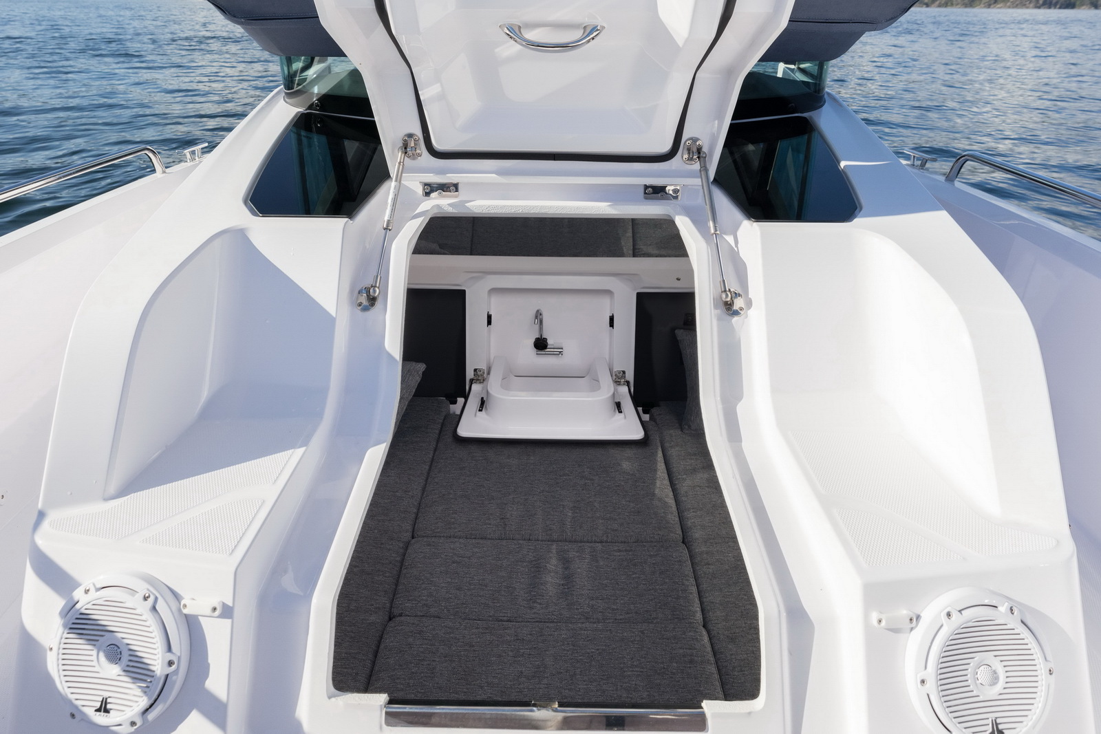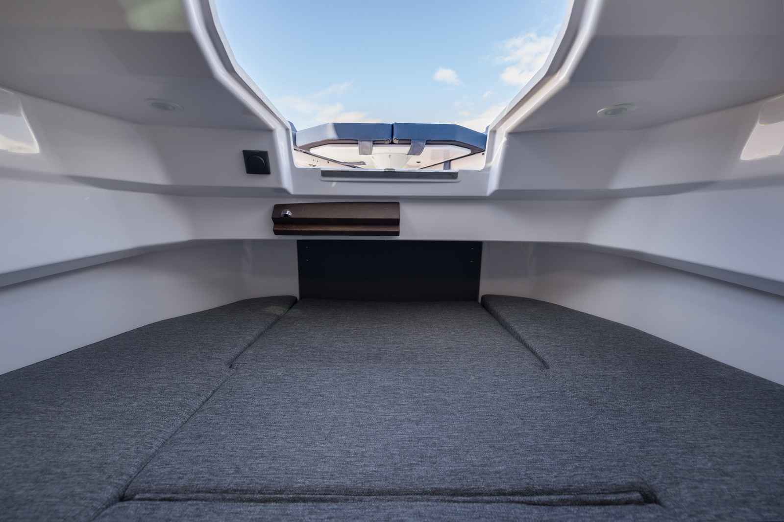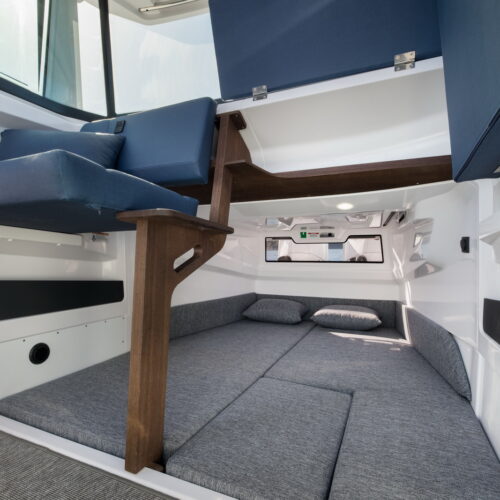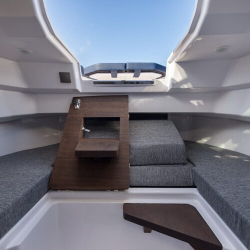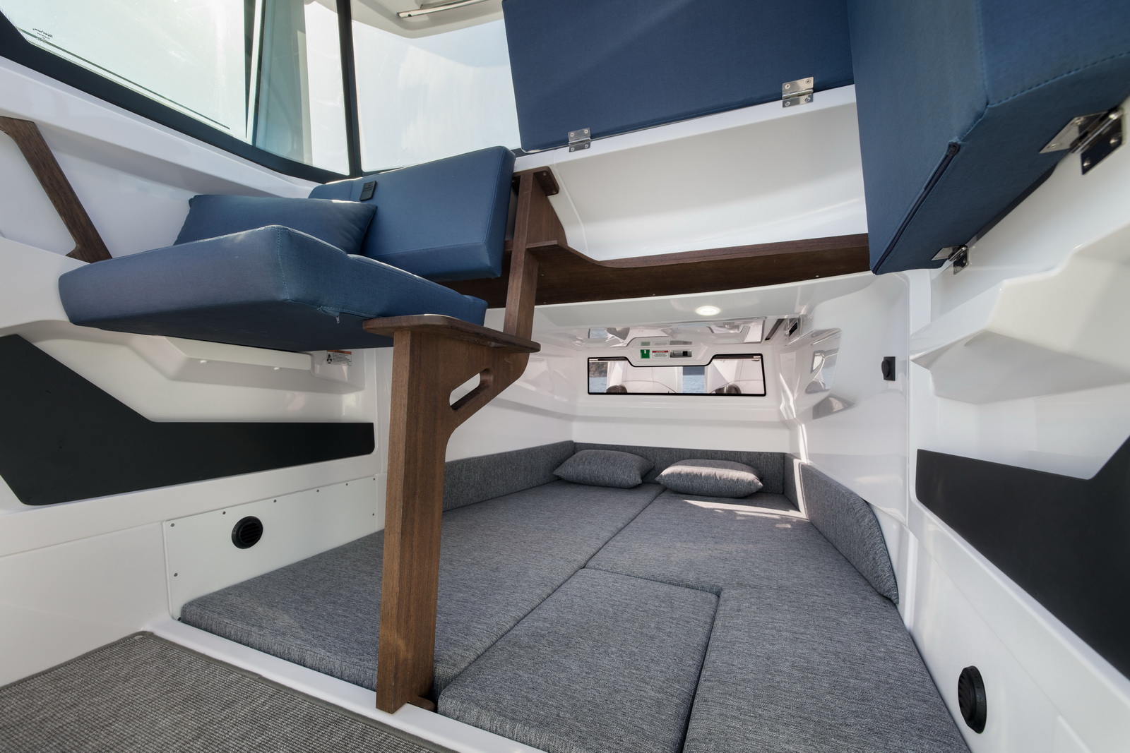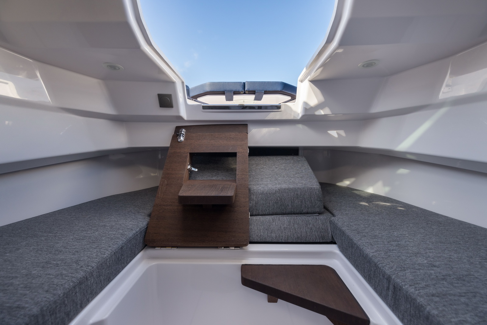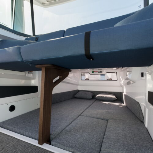 It features a spacious, bright and comfortable cabin with wide sliding doors and a large sliding canvas roof. This highly adaptable model has ample space for fishing and other activities on the aft deck and a large social area on the foredeck that can be quickly and easily converted into a sun bed or a seating and dining area.