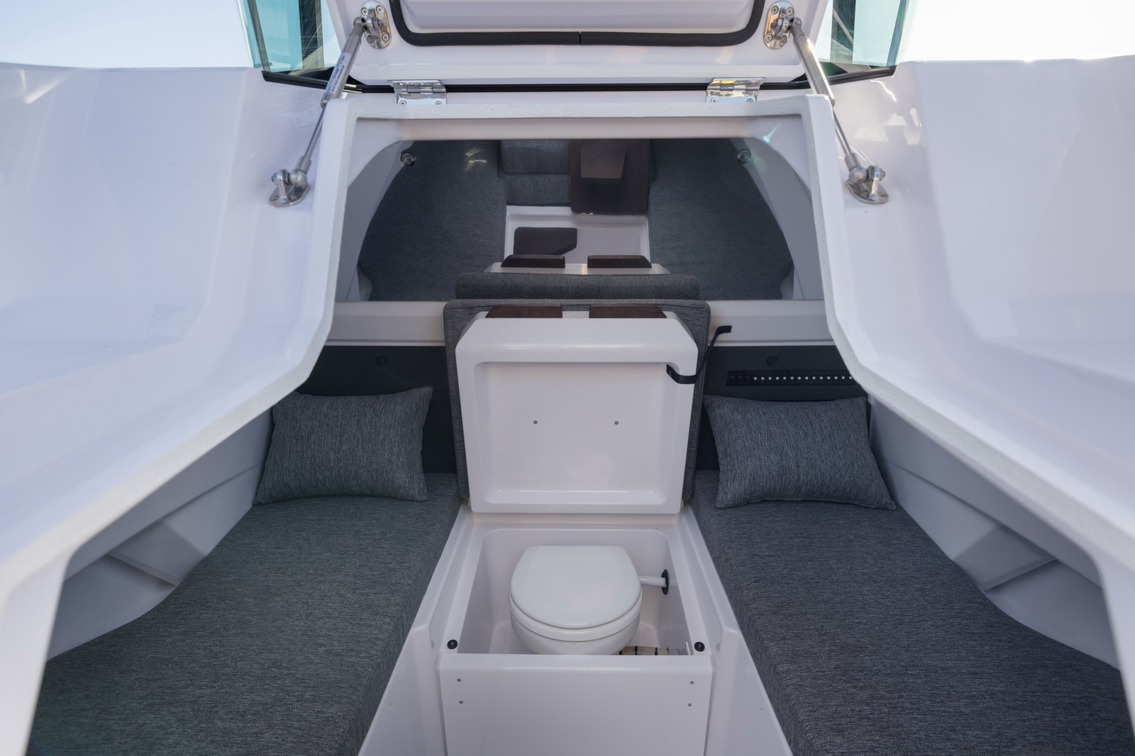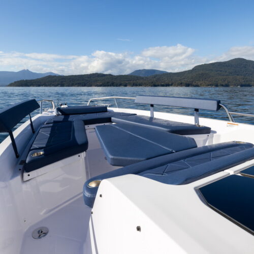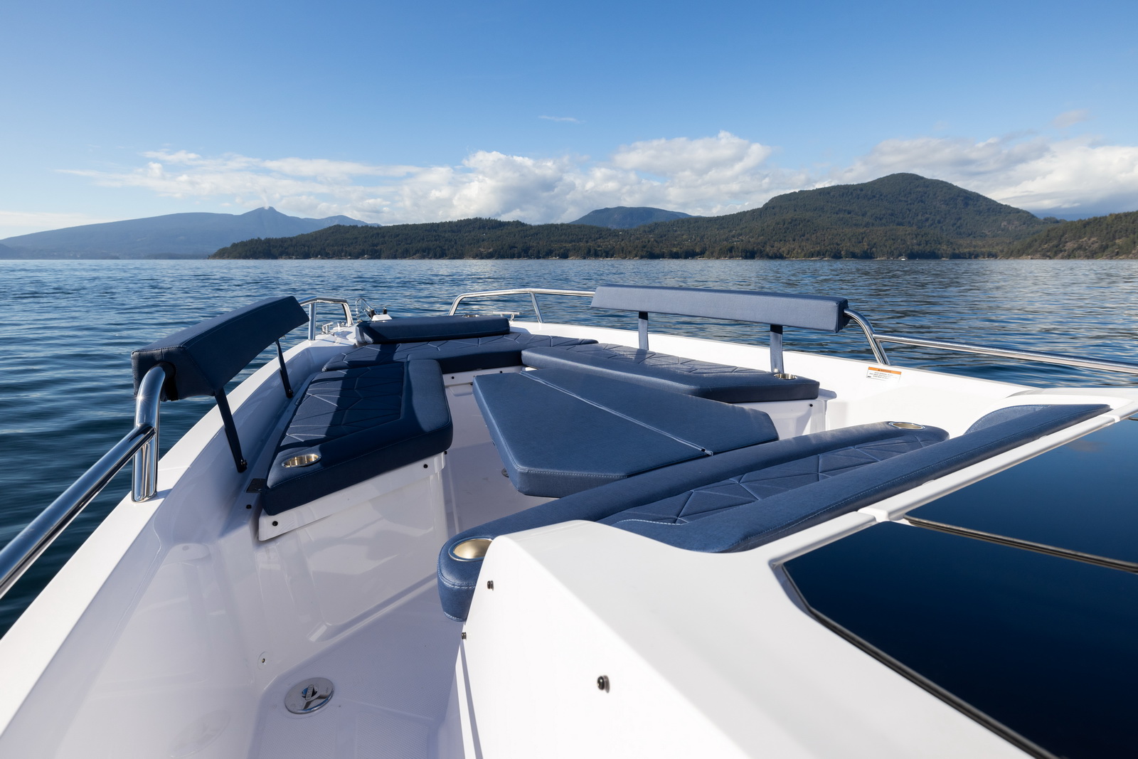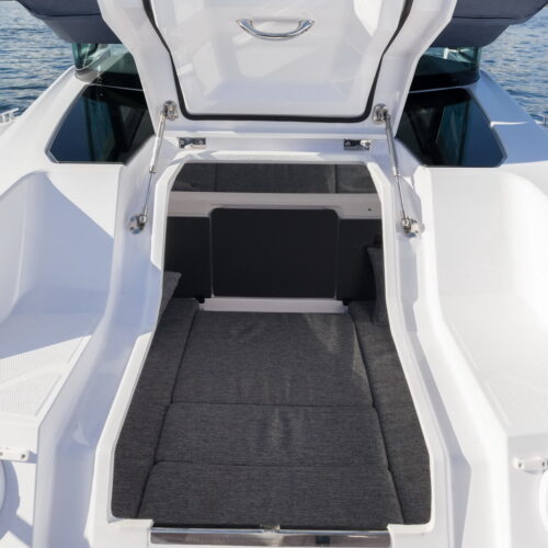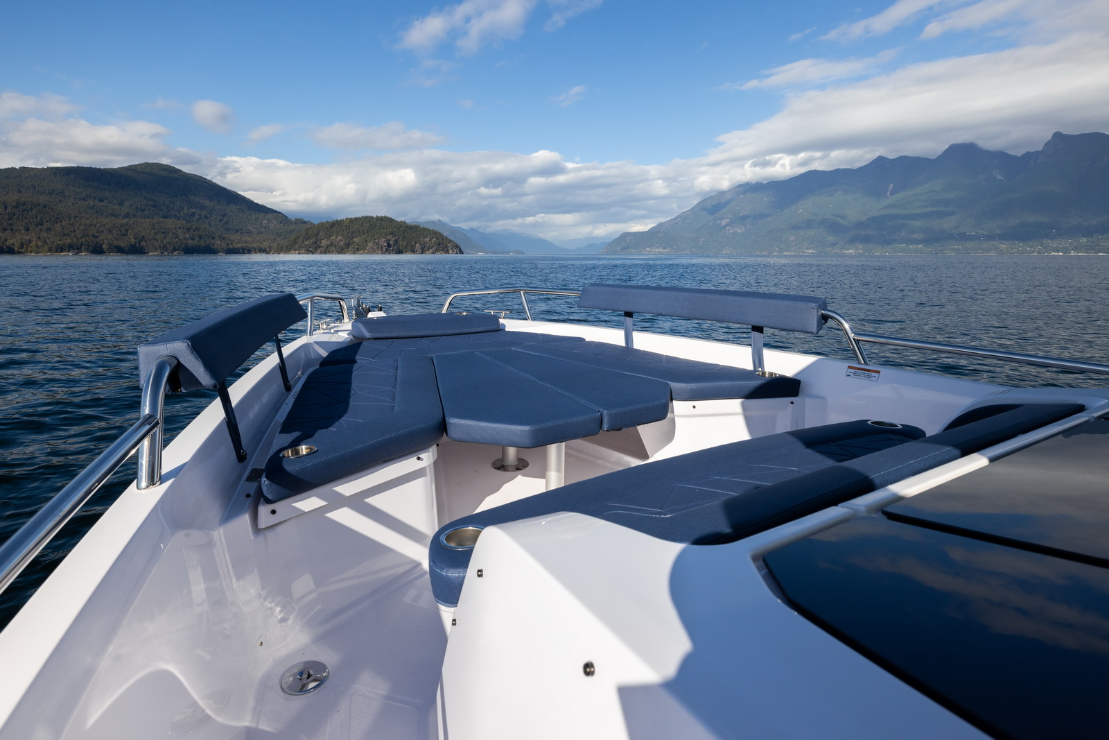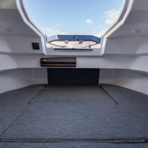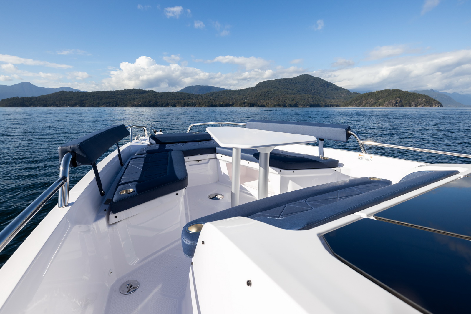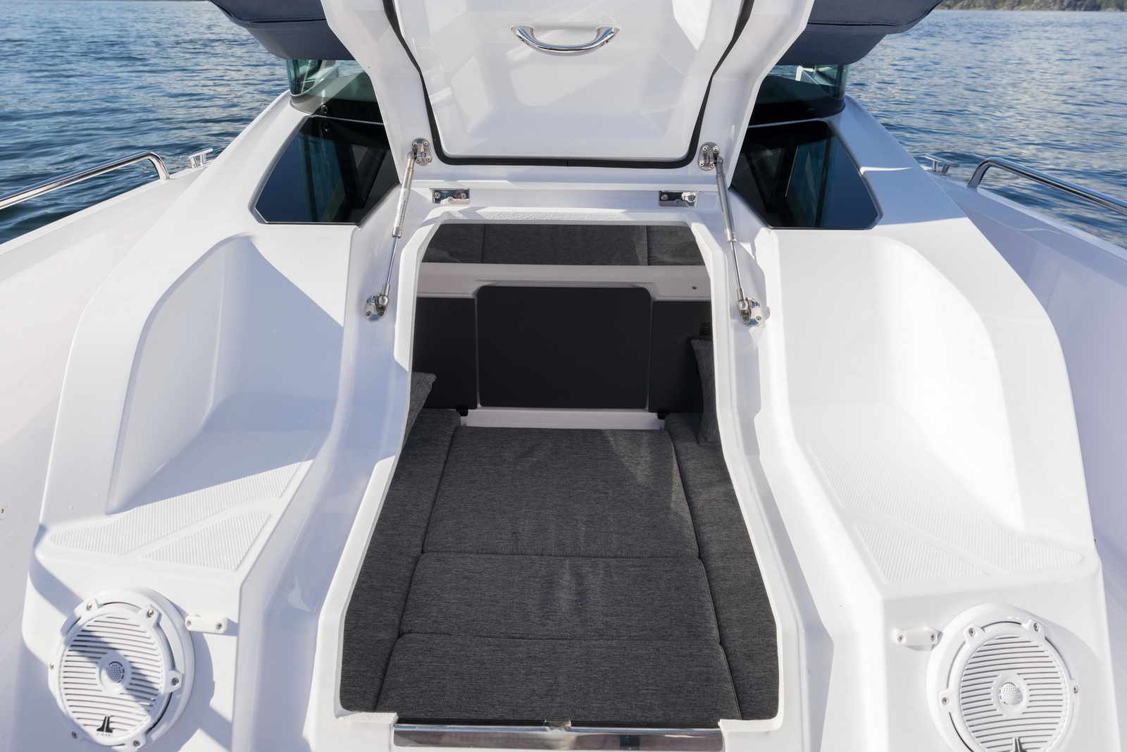 It features a spacious, bright and comfortable cabin with wide sliding doors and a large sliding canvas roof. This highly adaptable model has ample space for fishing and other activities on the aft deck and a large social area on the foredeck that can be quickly and easily converted into a sun bed or a seating and dining area.