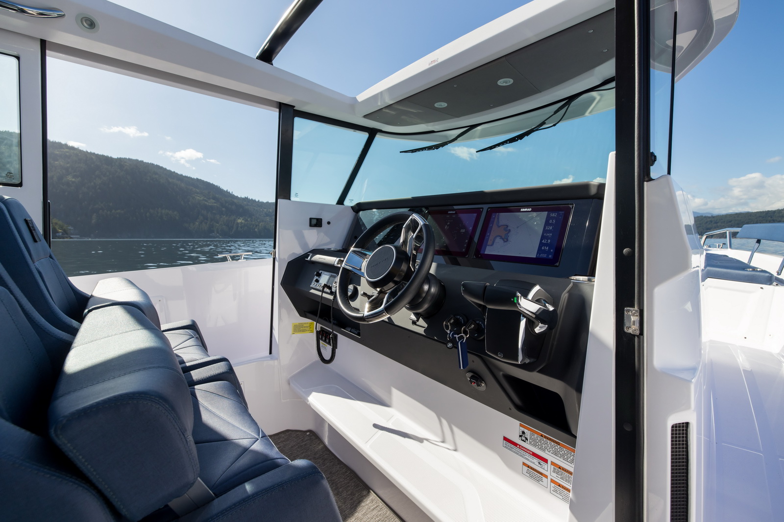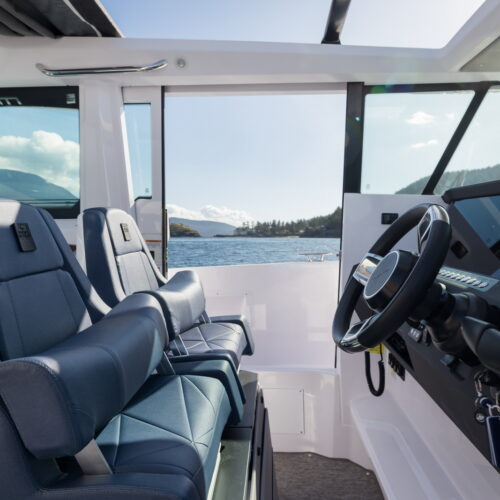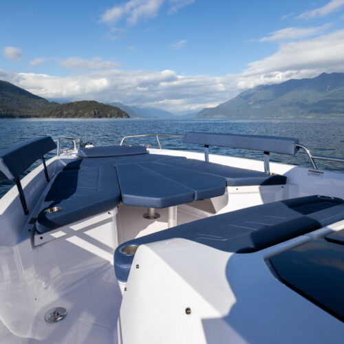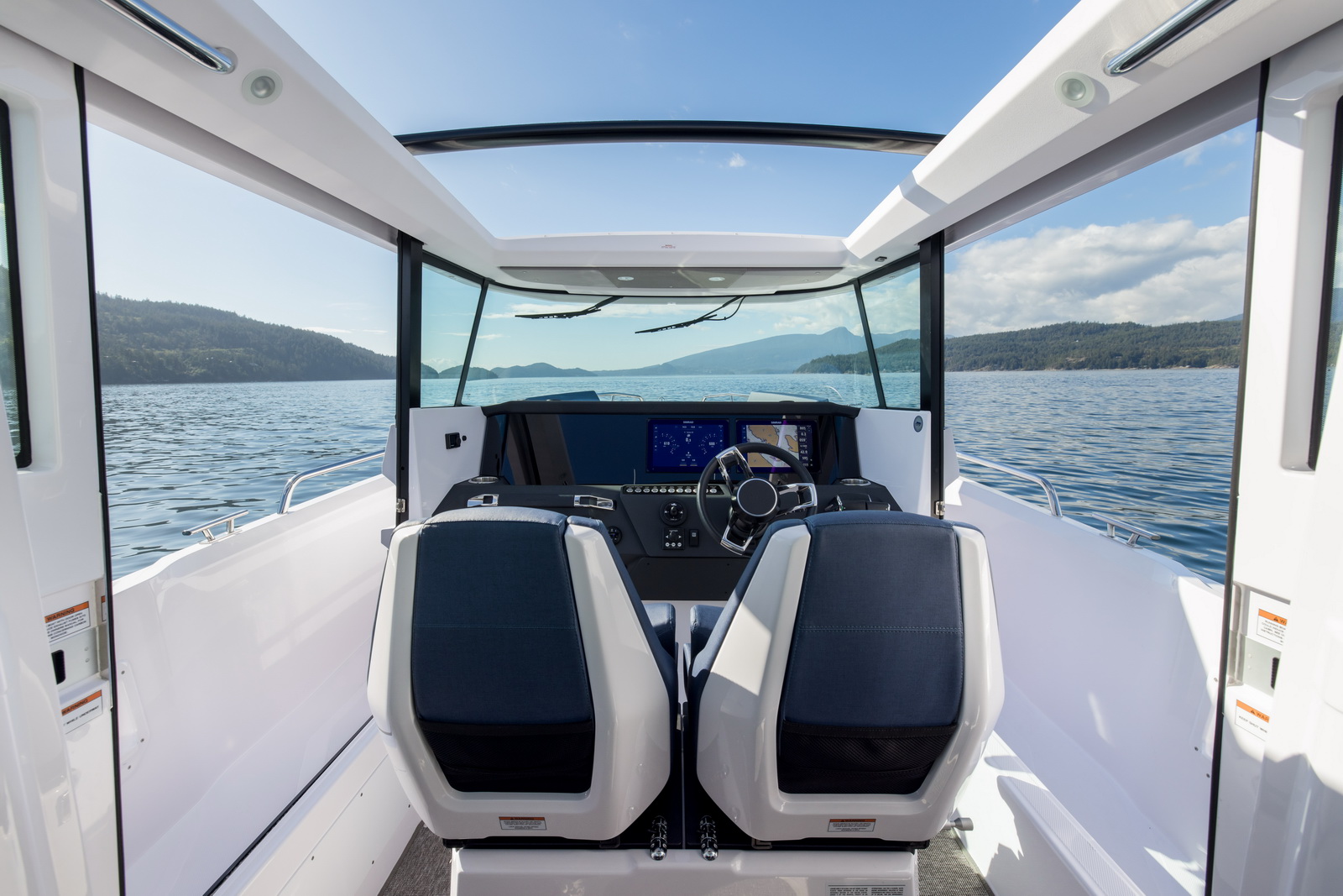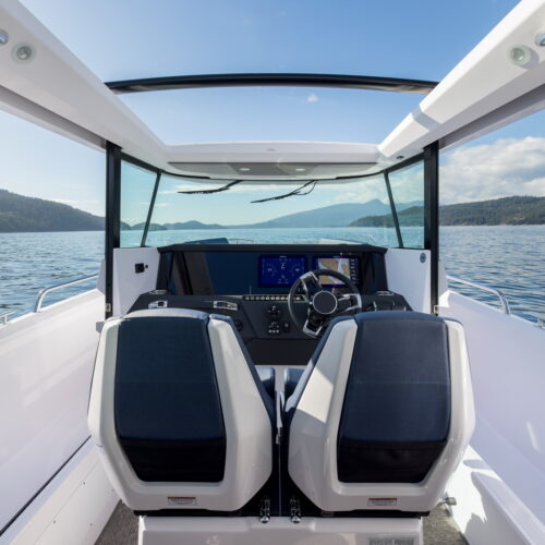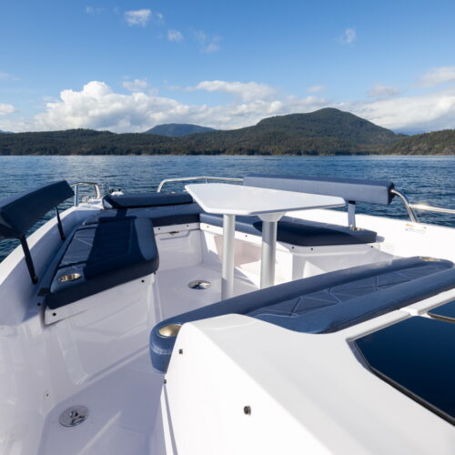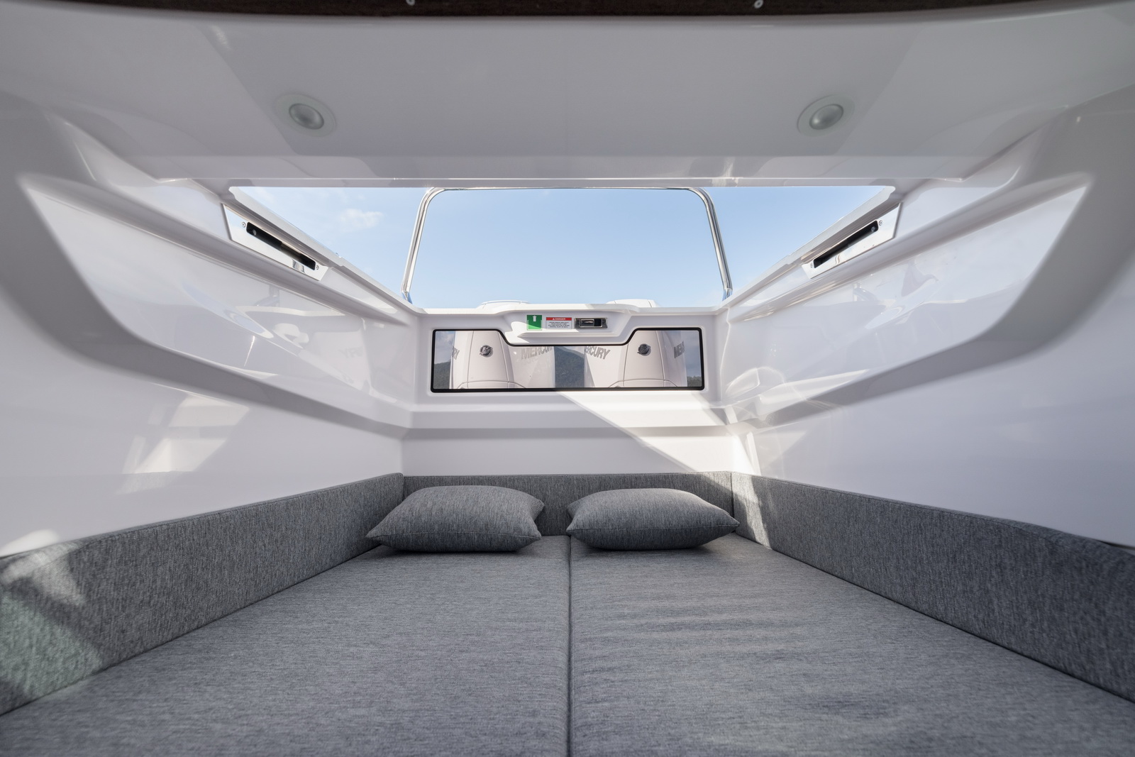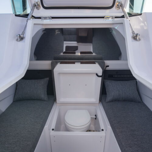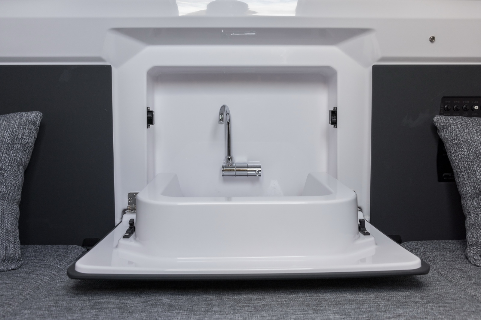 It features a spacious, bright and comfortable cabin with wide sliding doors and a large sliding canvas roof. This highly adaptable model has ample space for fishing and other activities on the aft deck and a large social area on the foredeck that can be quickly and easily converted into a sun bed or a seating and dining area.