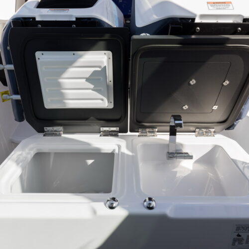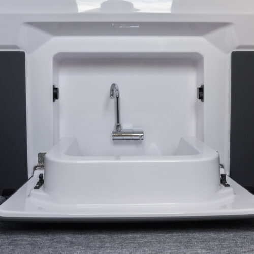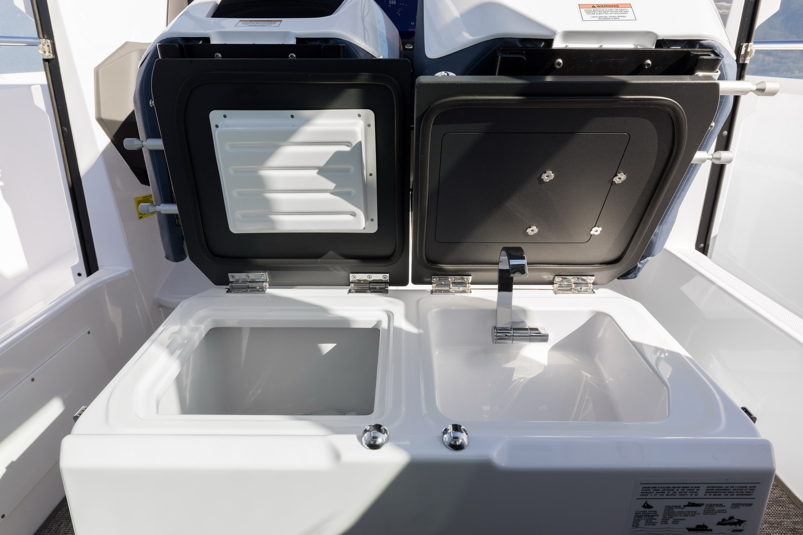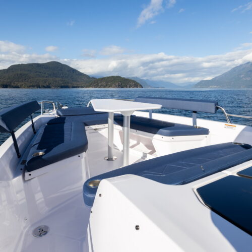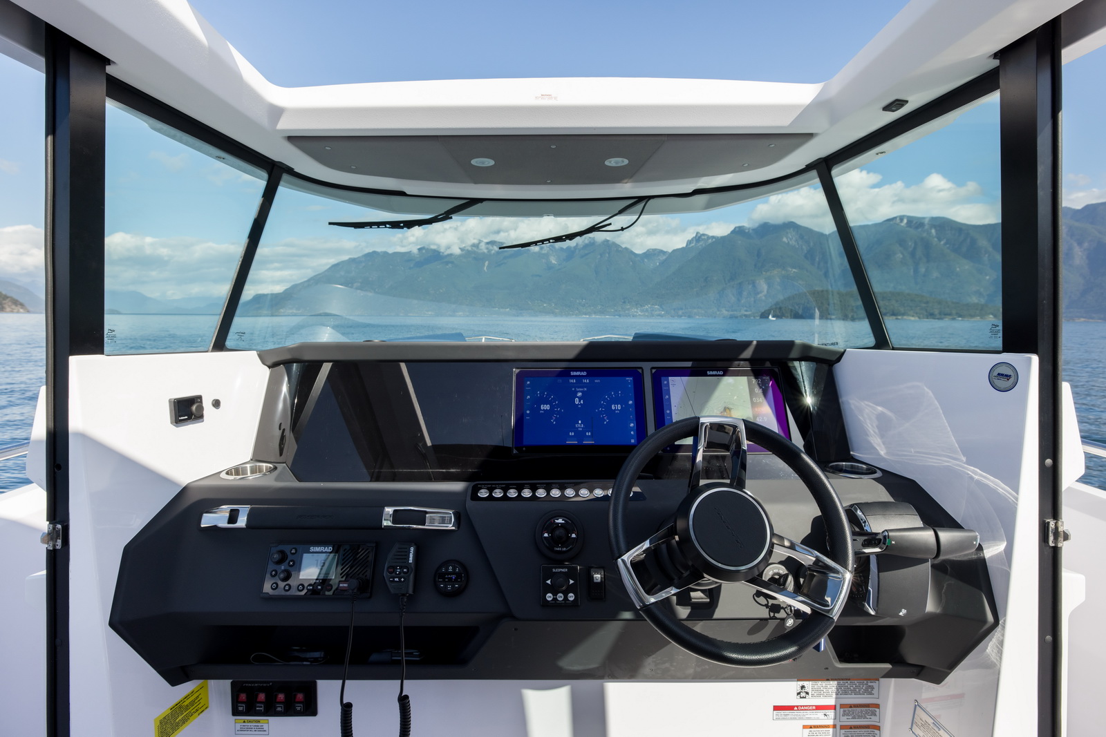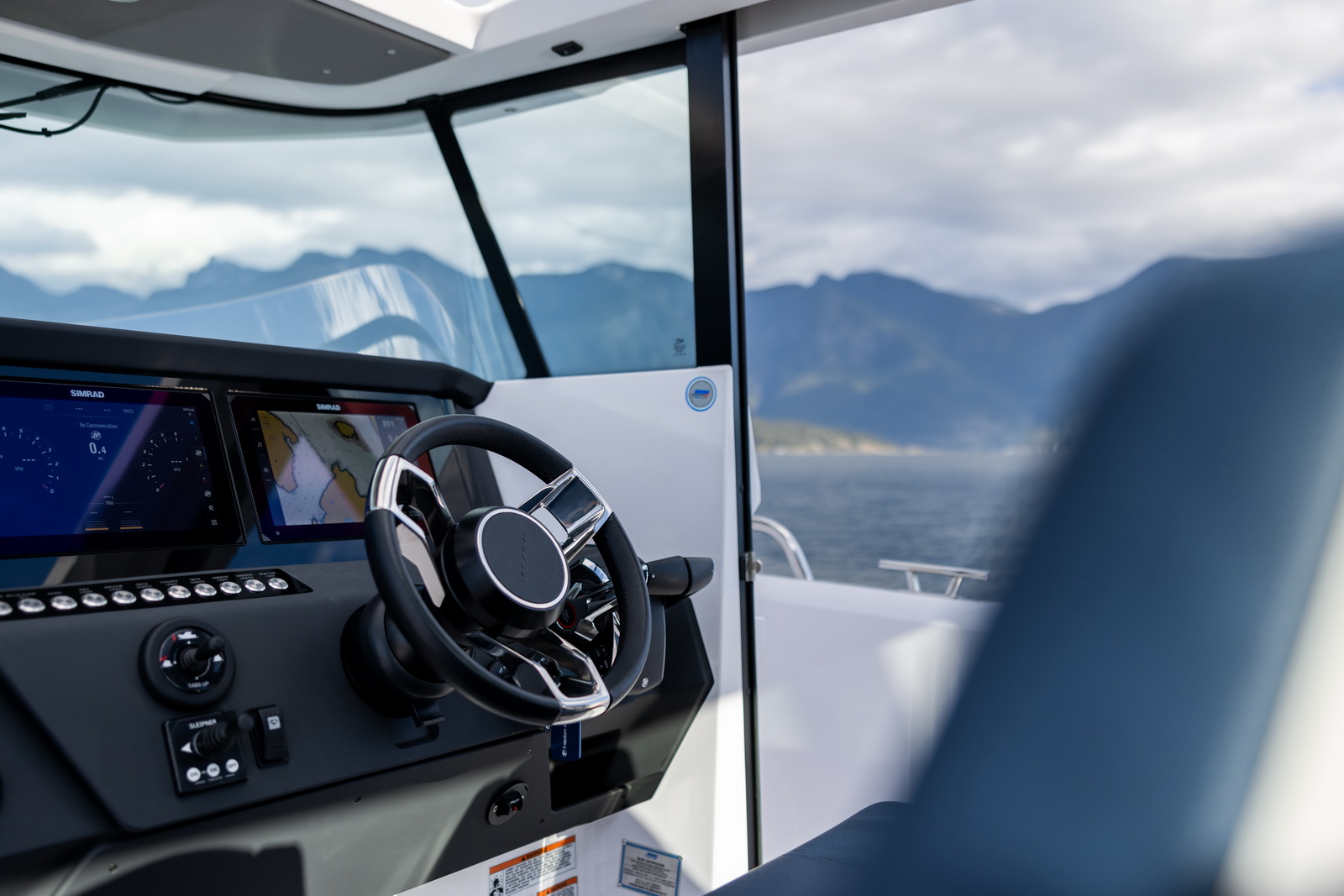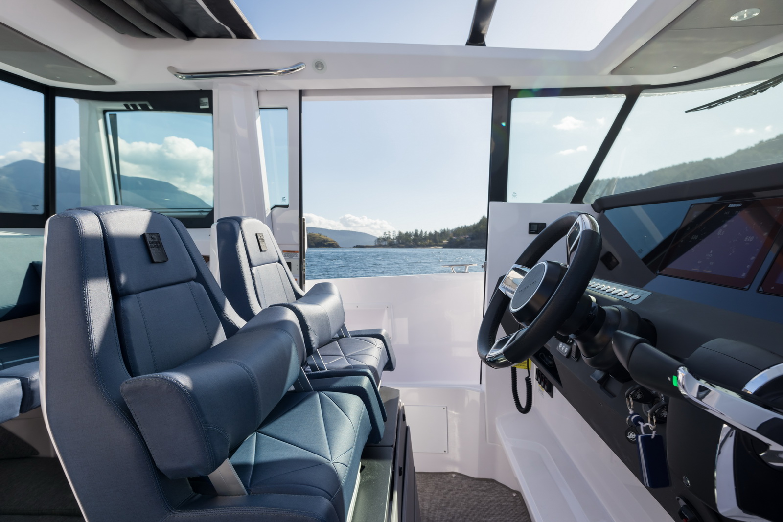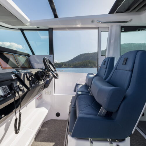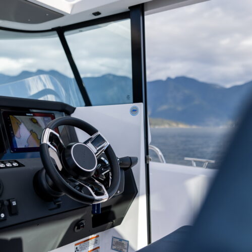 It features a spacious, bright and comfortable cabin with wide sliding doors and a large sliding canvas roof. This highly adaptable model has ample space for fishing and other activities on the aft deck and a large social area on the foredeck that can be quickly and easily converted into a sun bed or a seating and dining area.