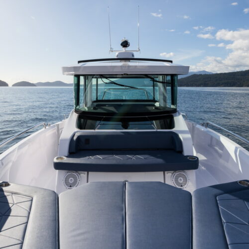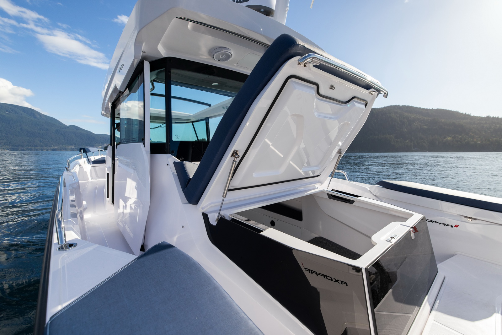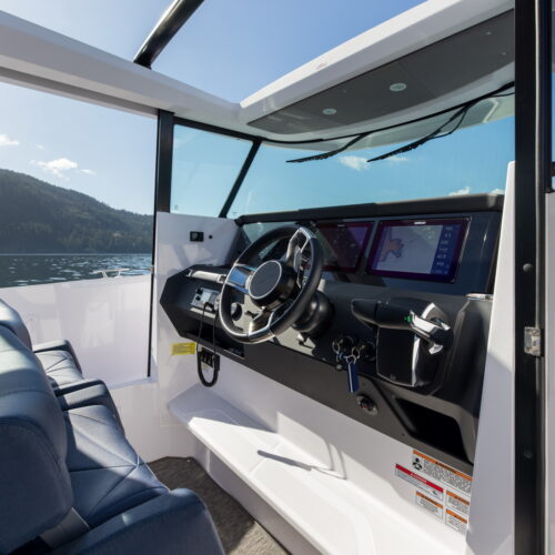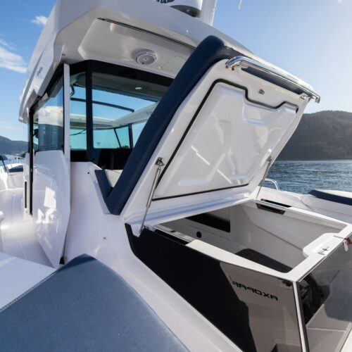 This Axopar 29 XC Cross Cabin is now available for viewing in Phuket Boat Lagoon. The walk-around cabin model with aft cabin is great for all on-water activities with a large canvas roof and two wide sliding doors. The Axopar 29 Cabin is a multi functional craft with modern smart lines that is fully en closable for all weather conditions yet open for warm and sunny summer days. It is fitted with a single 400hp Mercury engine but as shown in the photos can also be ordered to your individual specifications with twin 200hp engines.