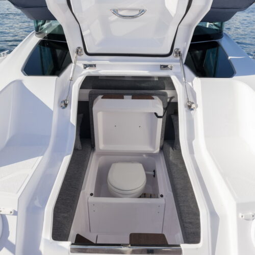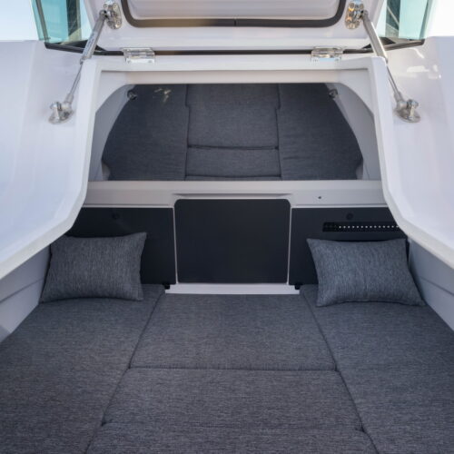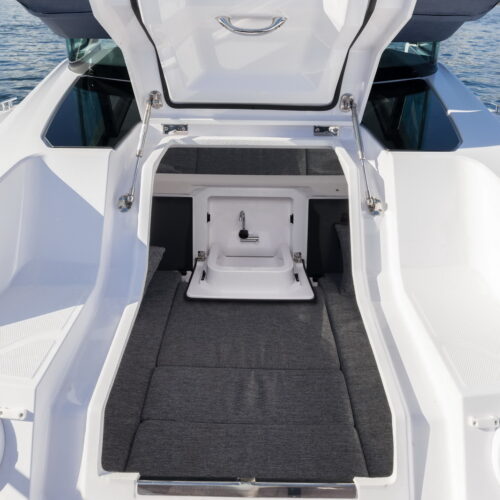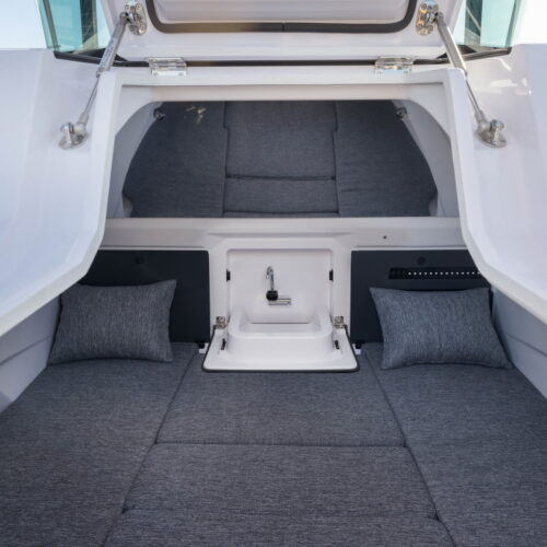 The foredeck also incorporates a double cabin with toilet and sink and lots of storage space when not used for sleeping. There is also an aft cabin for those who want accommodation for up to 4 persons in total. Another feature of the aft cabin is its roof which is equipped with the optional sun cushions. Whether for cruising, fishing or just unwinding with friends and family you’ll love the Axopar 29 Cabin.