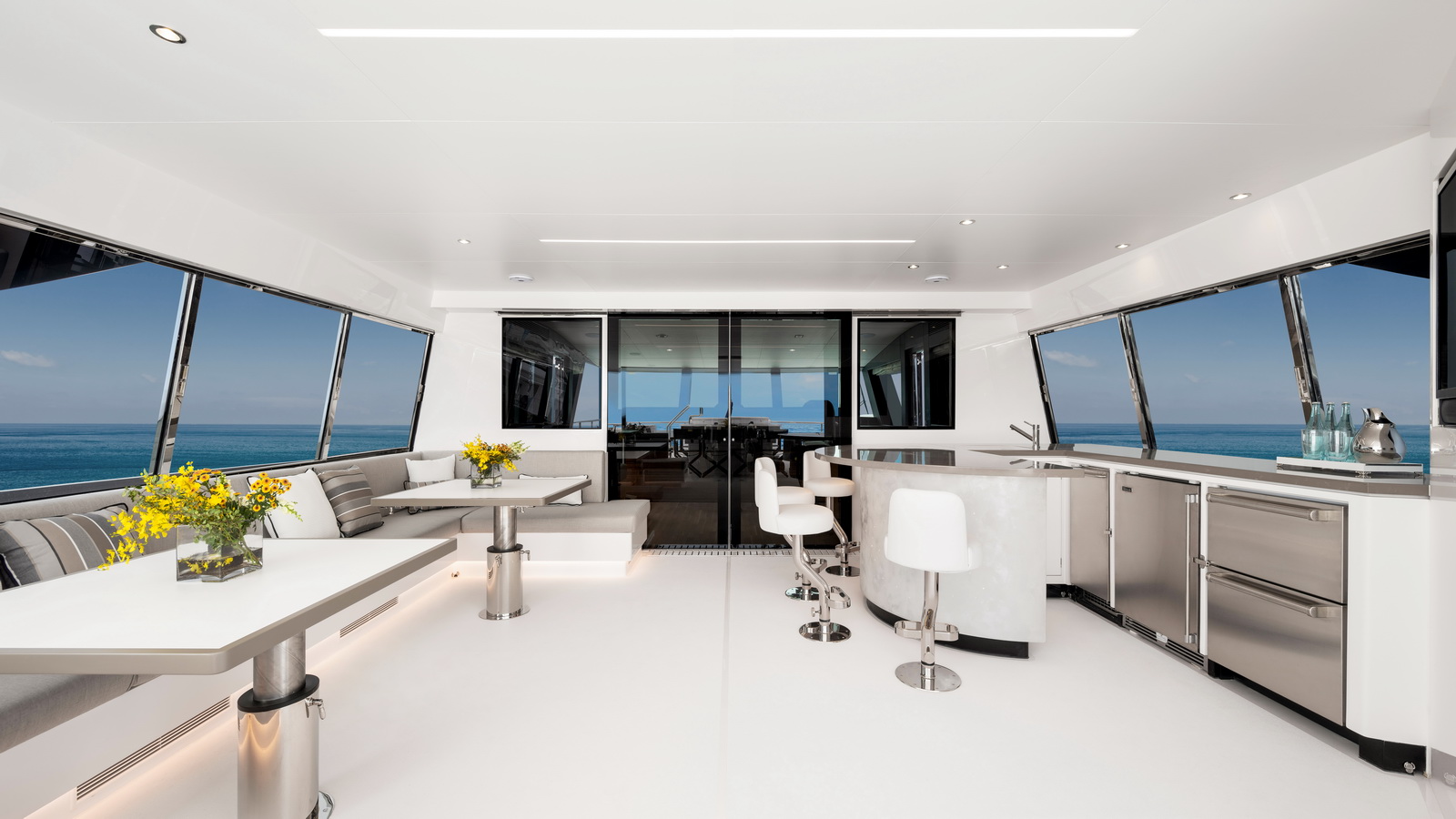 Offered in a Tri-Deck or Skyline configuration, the FD110 comfortably accommodates a crew of six with a large, fully equipped beach club aft.