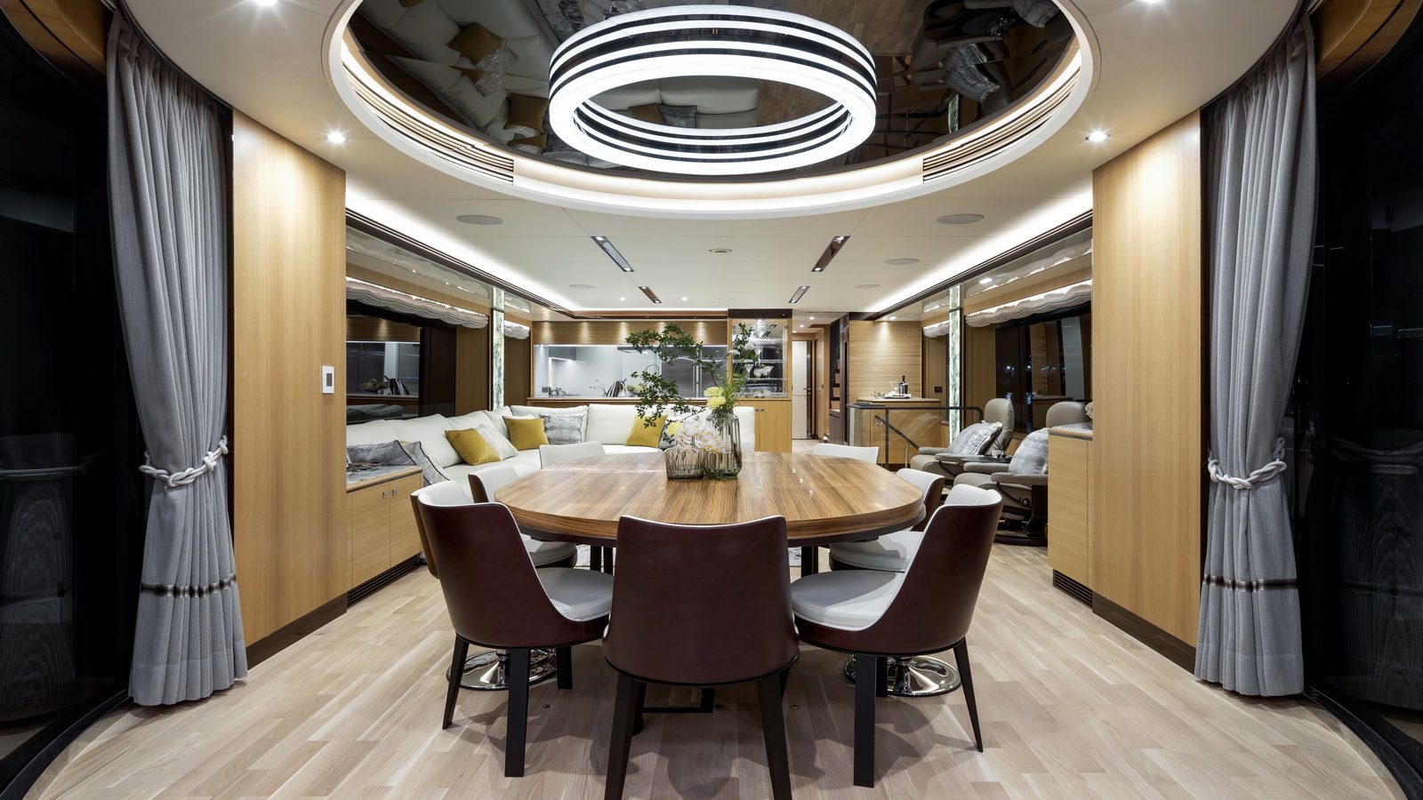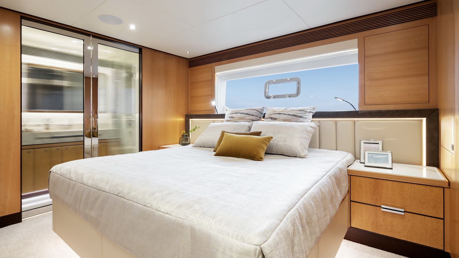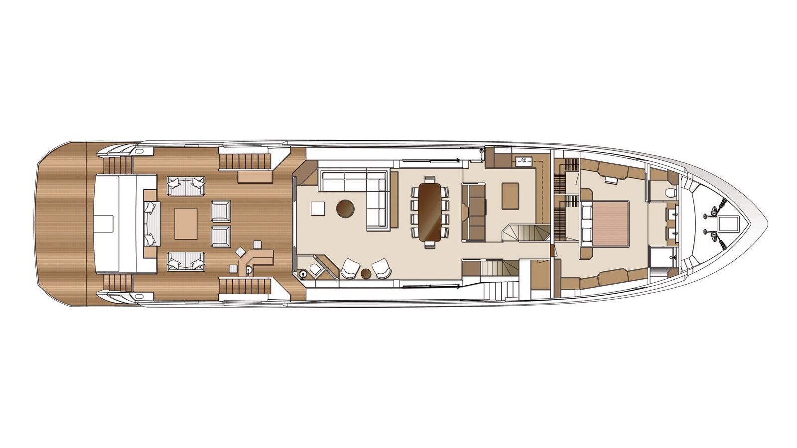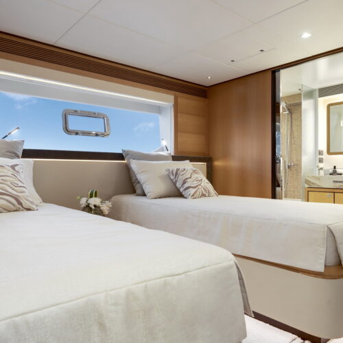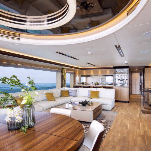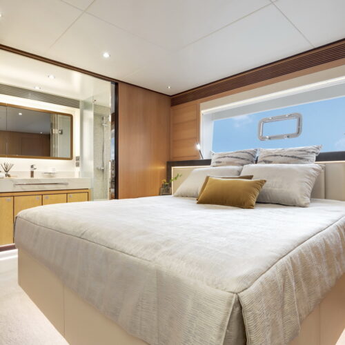 This five-stateroom yacht features an on-deck deluxe master stateroom and plentiful dining and entertaining areas throughout.