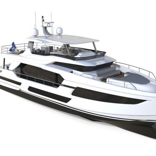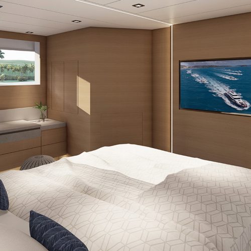 The FD75 is a four-stateroom yacht, which includes a full-beam, on-deck master stateroom fitted with an en suite and walk-in closets, and three spacious staterooms comprised of a queen, double and twin on the lower deck. Accommodations for two crew members are found aft, and a beach club is optional.