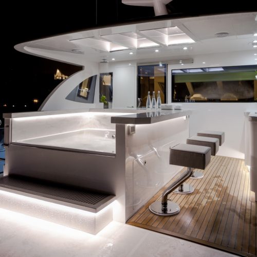 Entertaining with family and friends becomes a true pleasure with a creative foredeck seating area, exterior bar on the boat deck, and an incredible aft deck for luxurious, shaded relaxation.