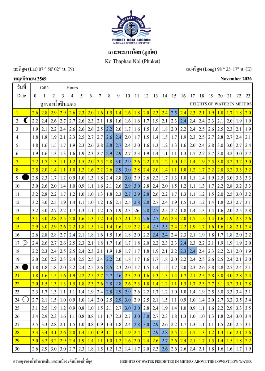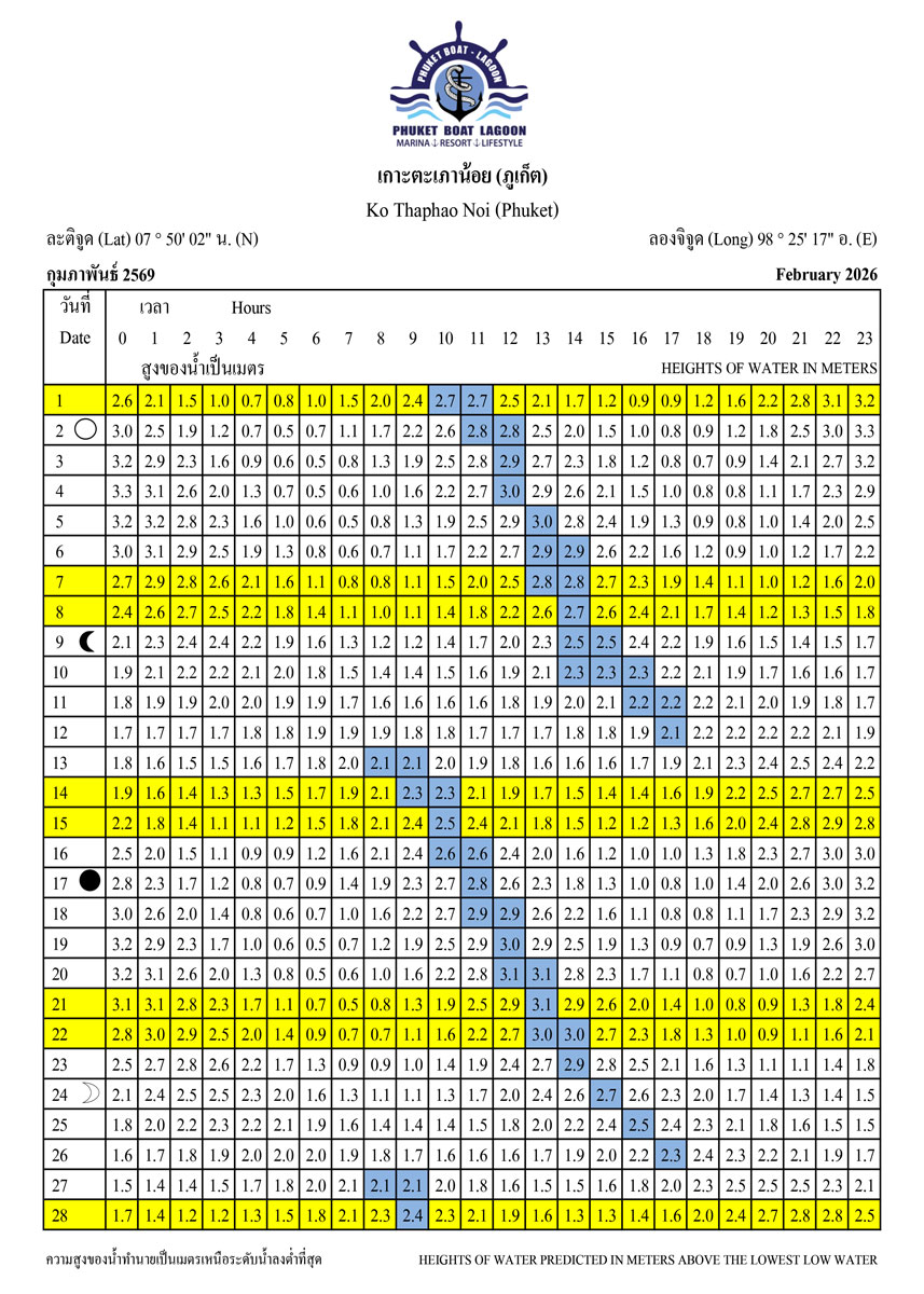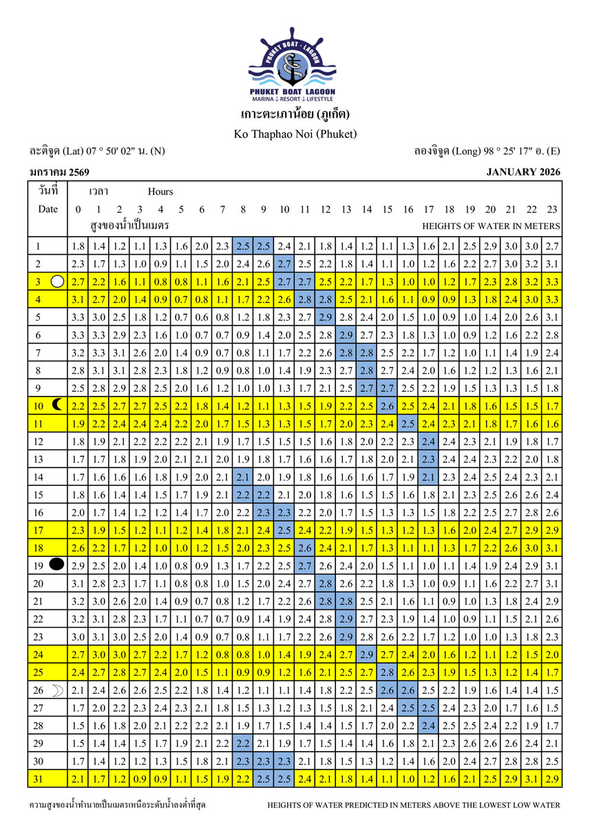 Tide Tables for 2026 at Koh Taphao Noi, Phuket. Predicted heights of water in meters above lowest low water.