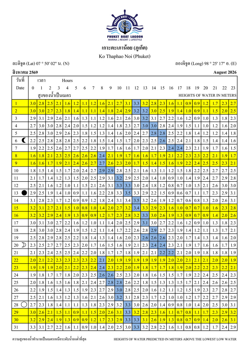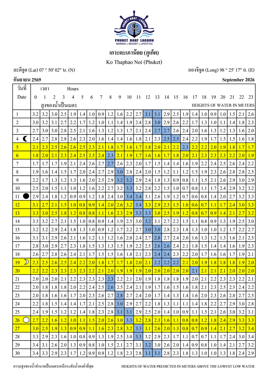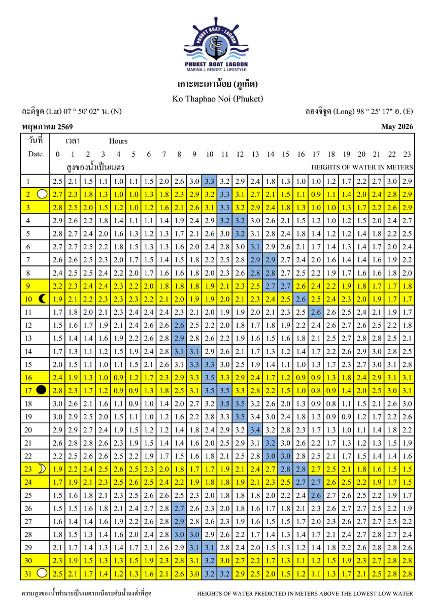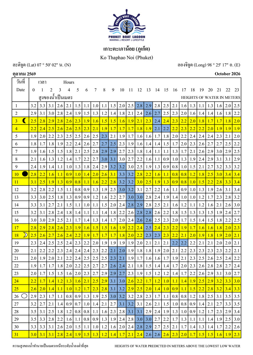 Tide Tables for 2026 at Koh Taphao Noi, Phuket. Predicted heights of water in meters above lowest low water.