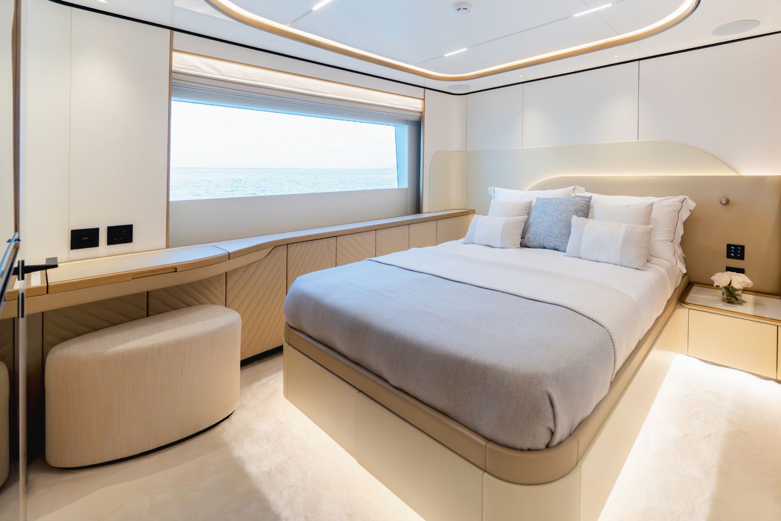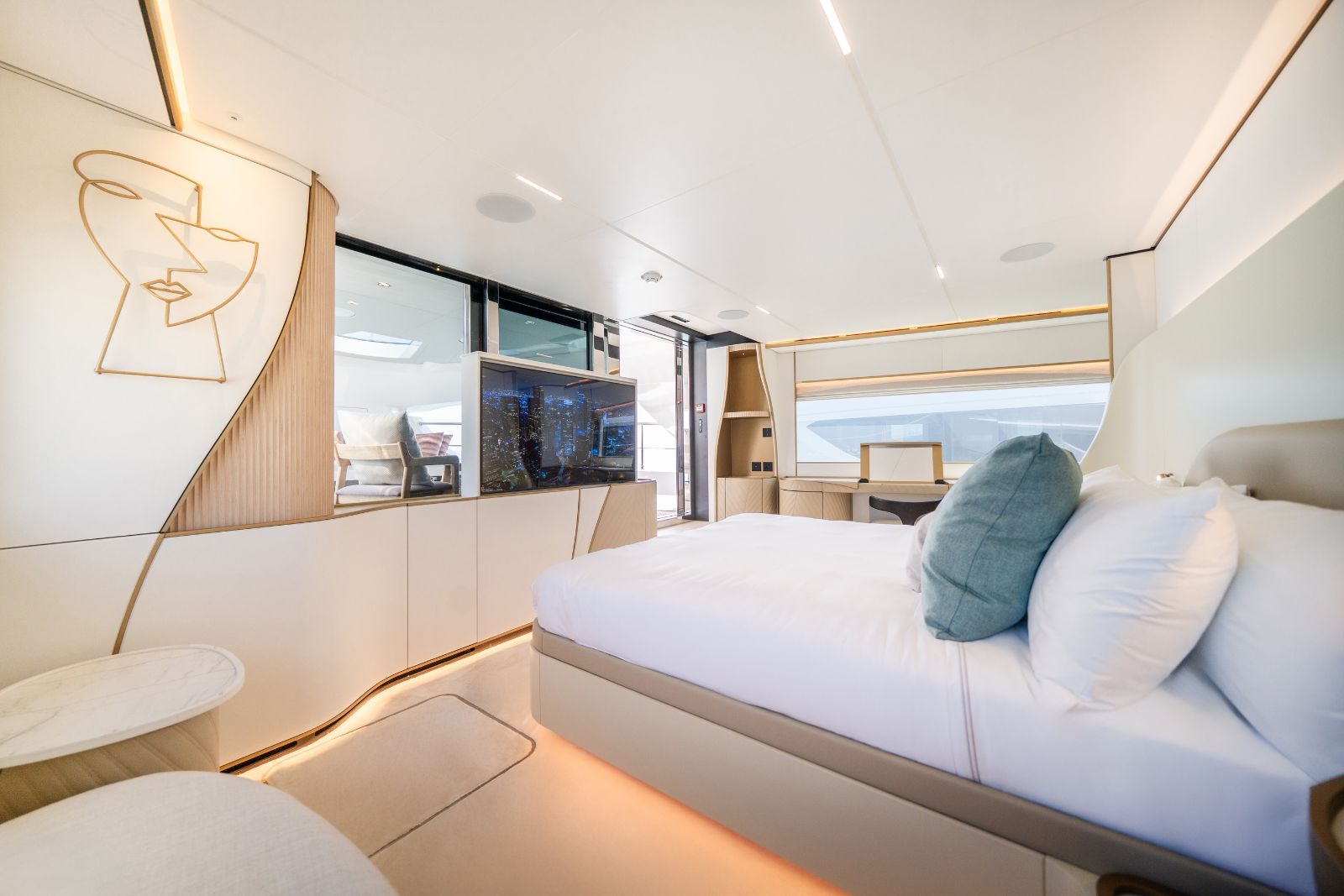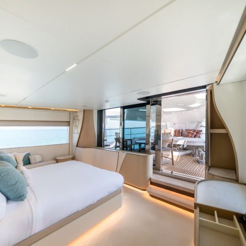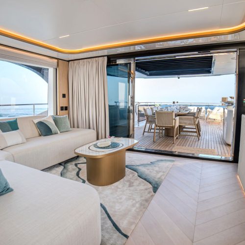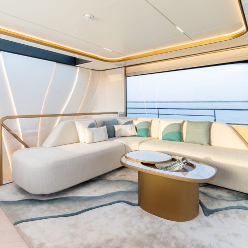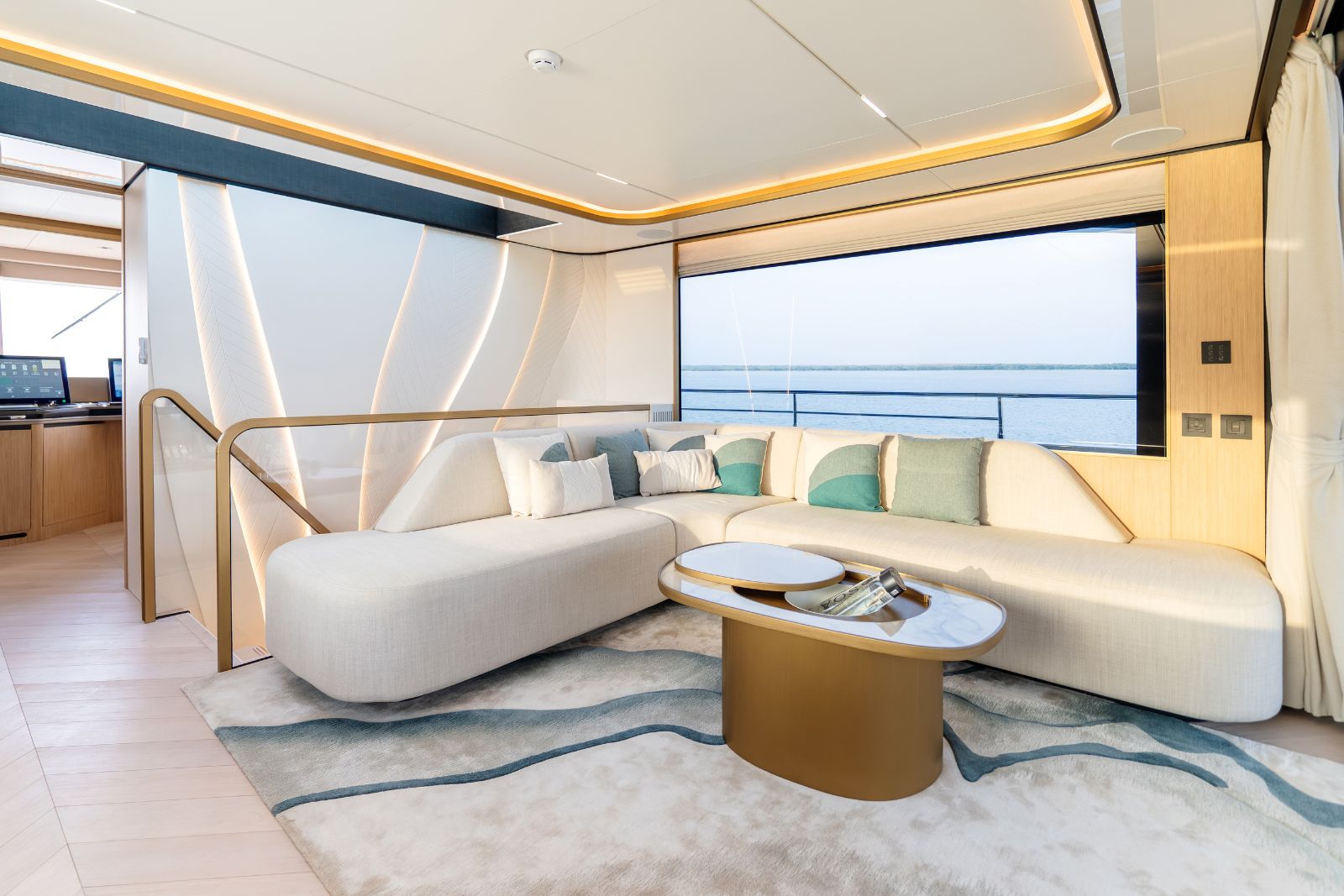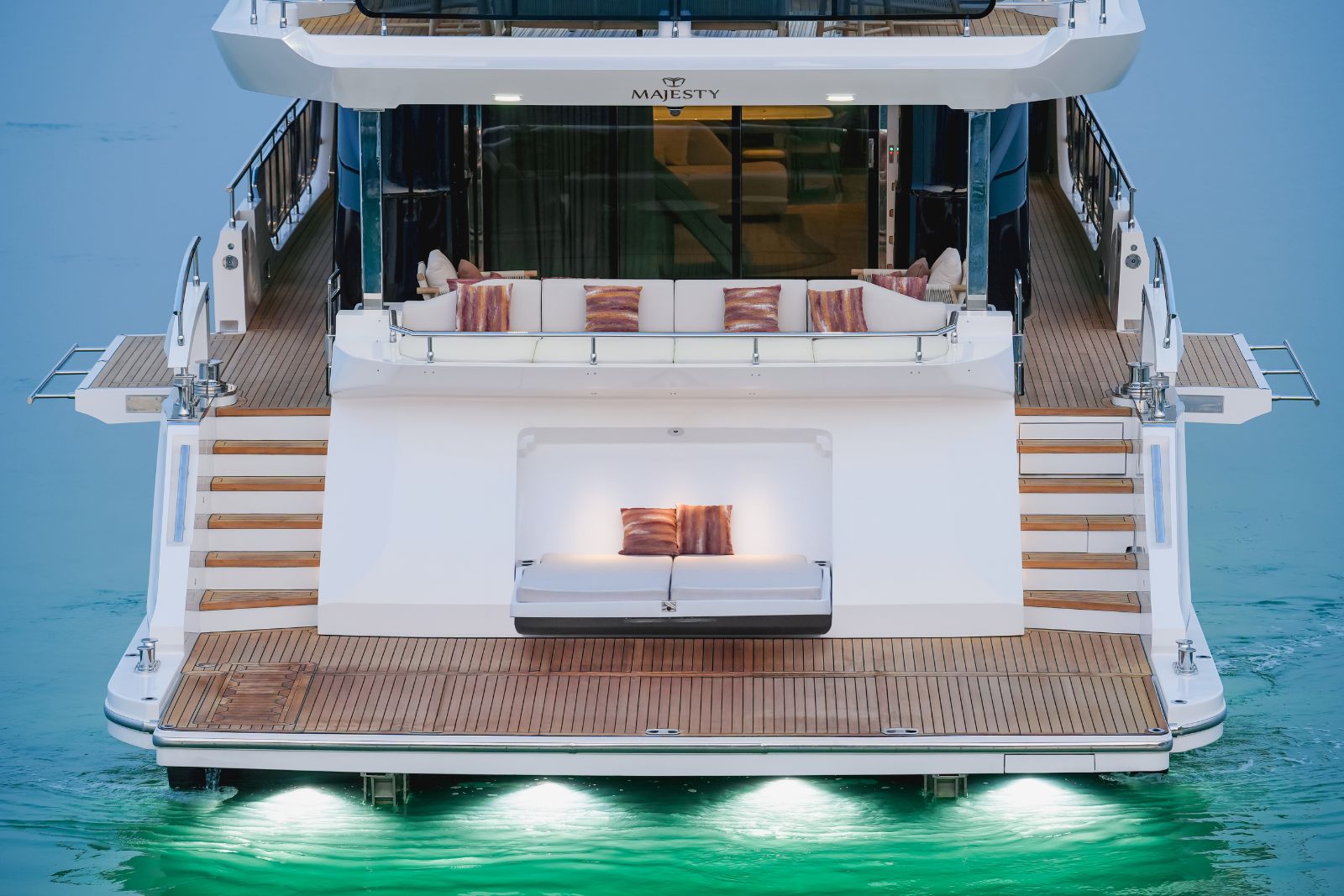 Designed around entertaining and owner enjoyment, the Majesty 100 Terrace offers a 20% increase in usable social space across her decks. Floor-to-ceiling patio doors, expansive dining and lounge areas, and a private owner’s terrace with panoramic views create a seamless indoor–outdoor lifestyle that elevates time spent on board.