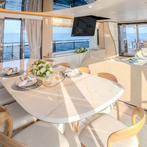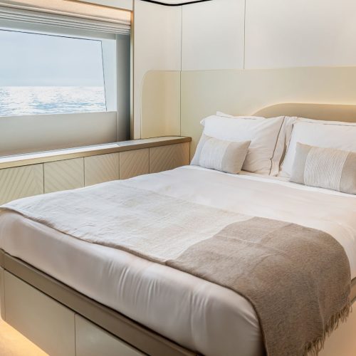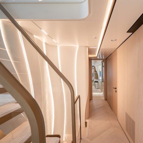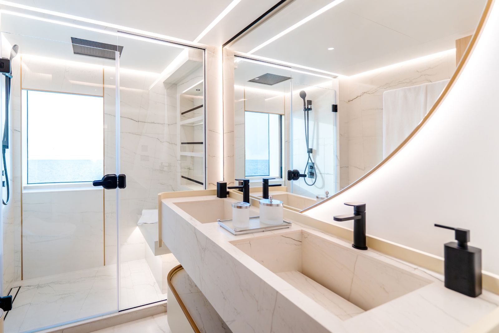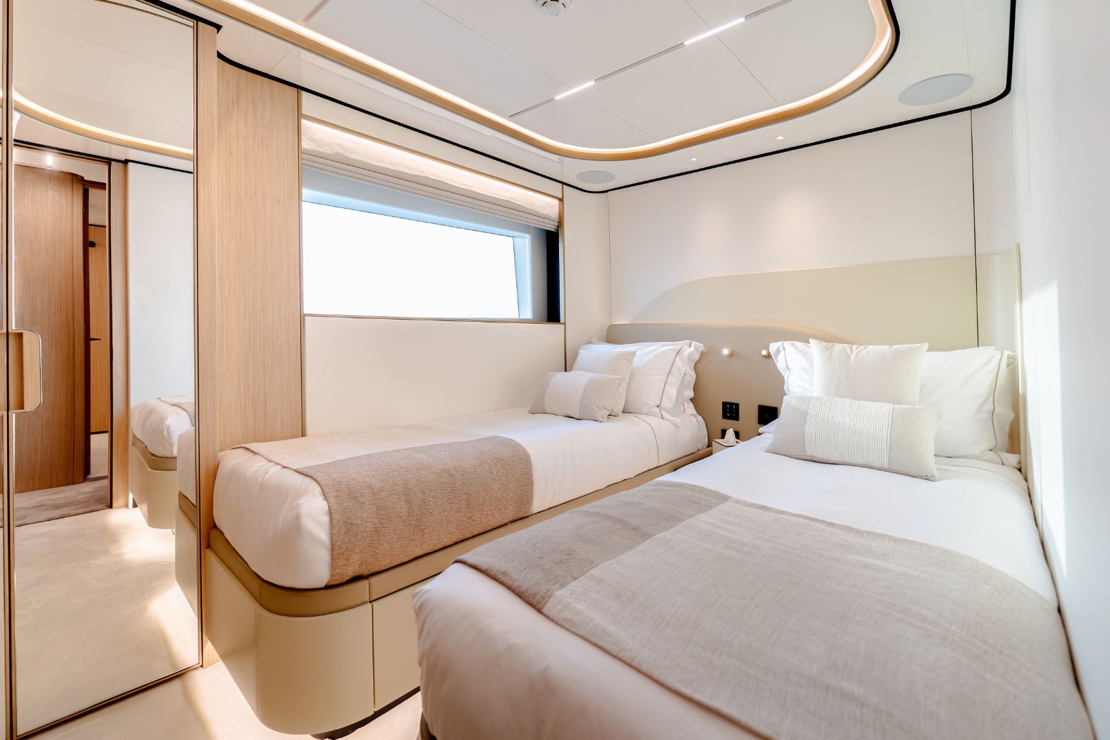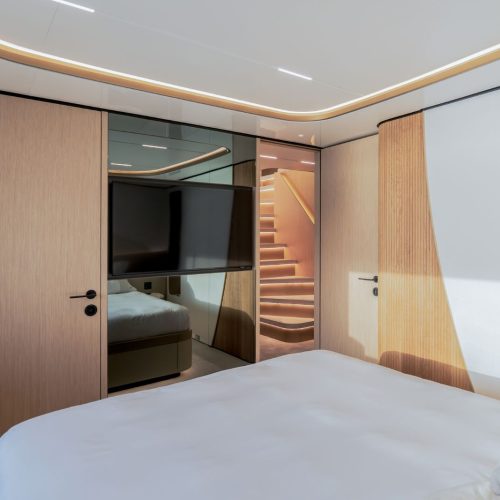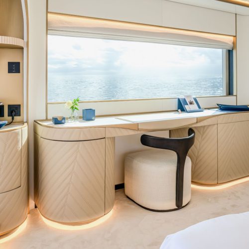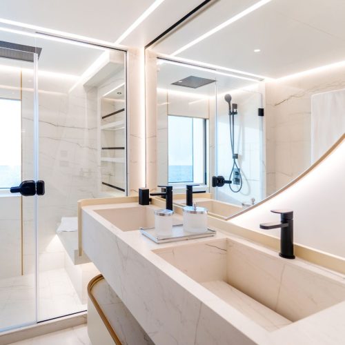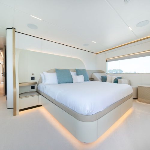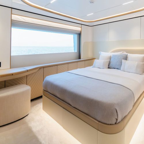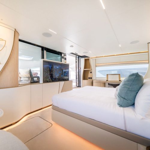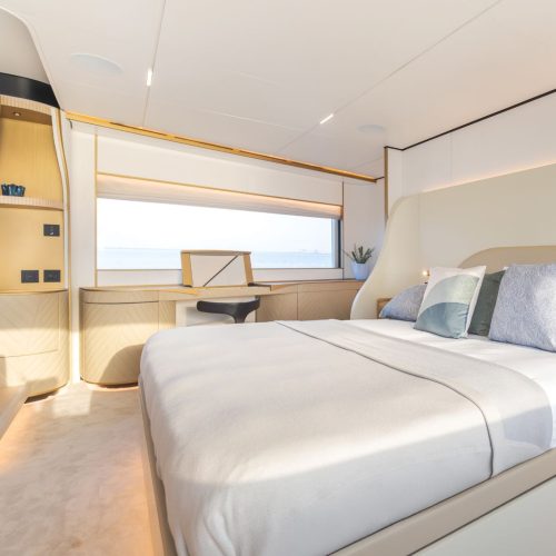 Designed around entertaining and owner enjoyment, the Majesty 100 Terrace offers a 20% increase in usable social space across her decks. Floor-to-ceiling patio doors, expansive dining and lounge areas, and a private owner’s terrace with panoramic views create a seamless indoor–outdoor lifestyle that elevates time spent on board.