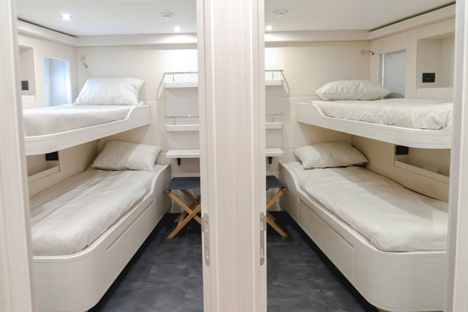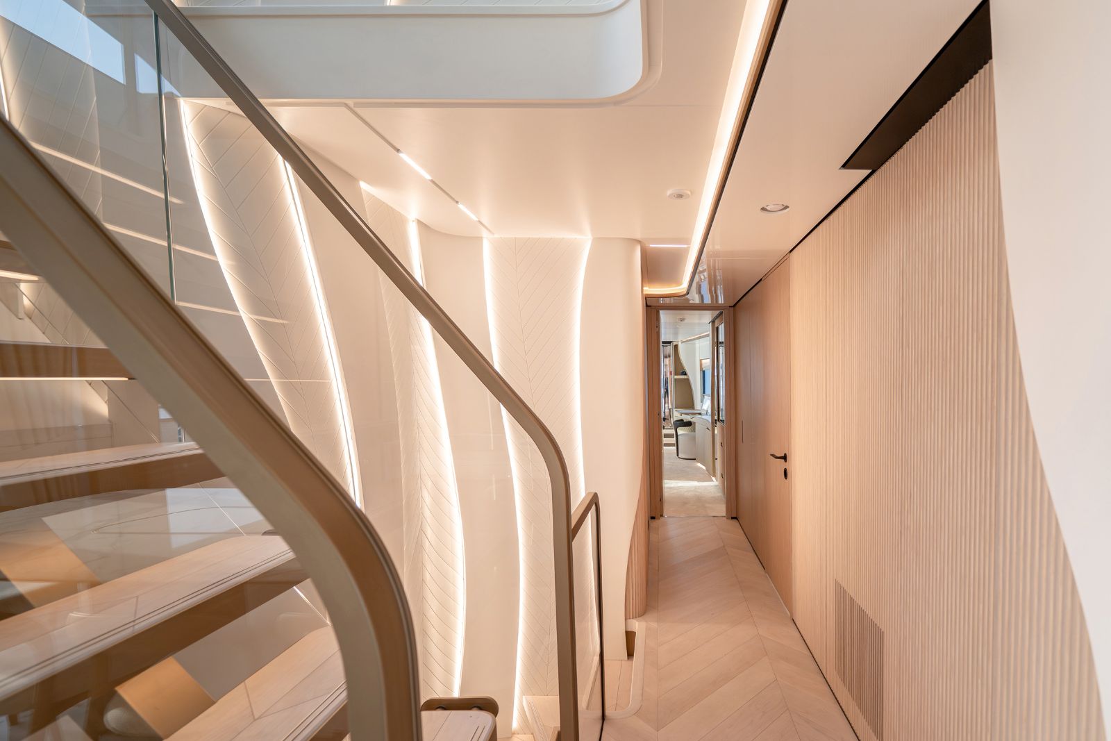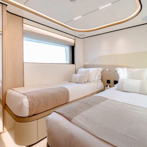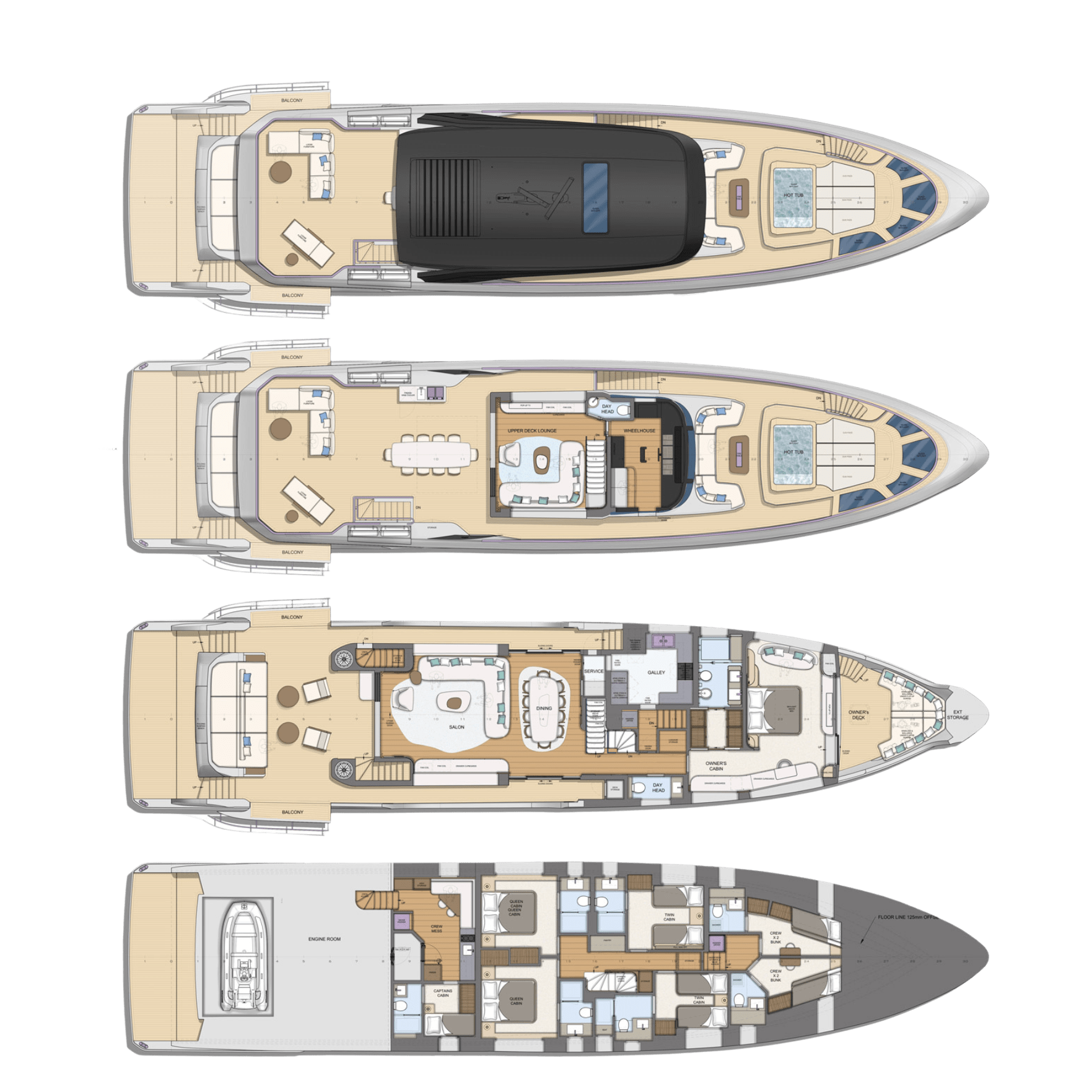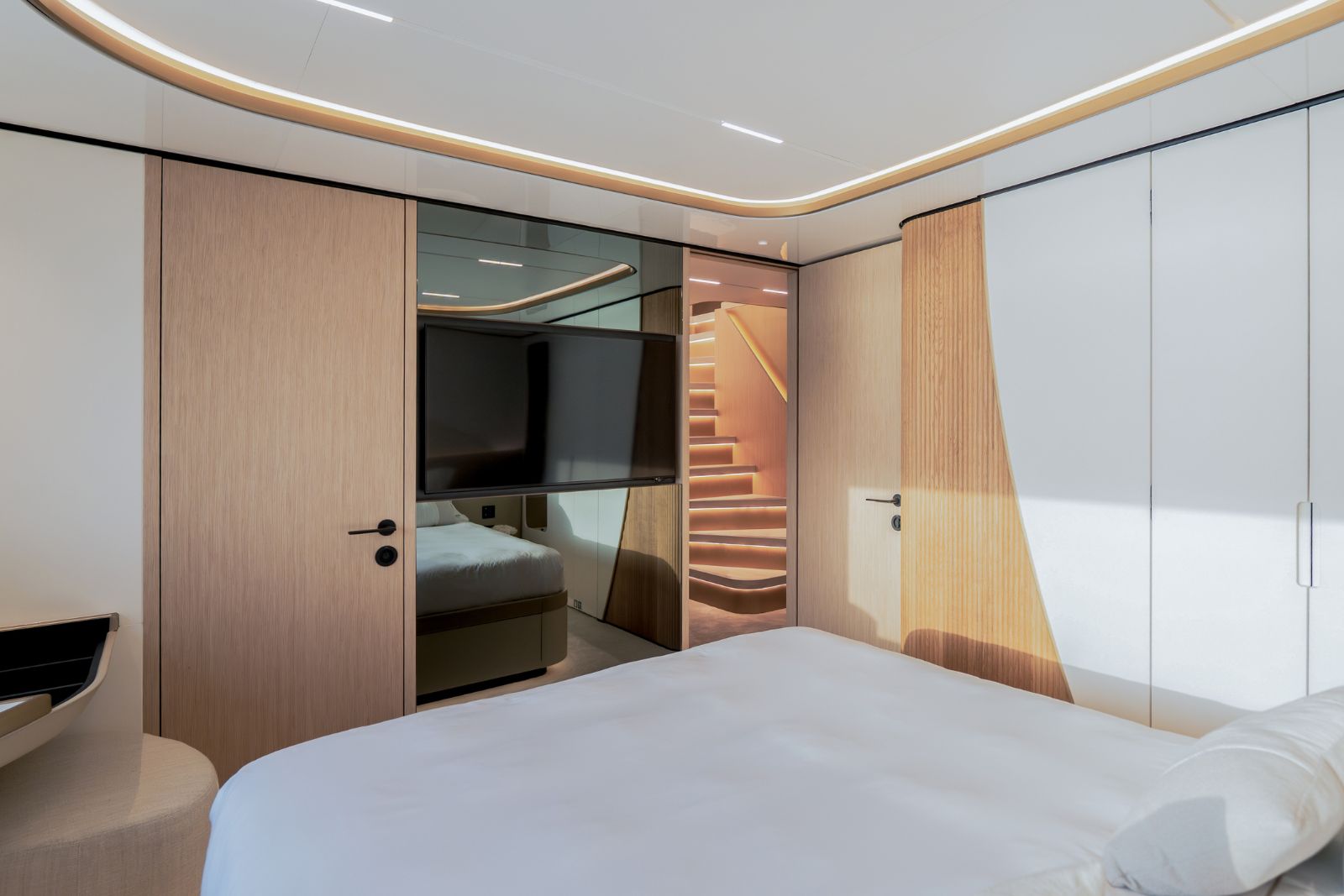 Designed around entertaining and owner enjoyment, the Majesty 100 Terrace offers a 20% increase in usable social space across her decks. Floor-to-ceiling patio doors, expansive dining and lounge areas, and a private owner’s terrace with panoramic views create a seamless indoor–outdoor lifestyle that elevates time spent on board.