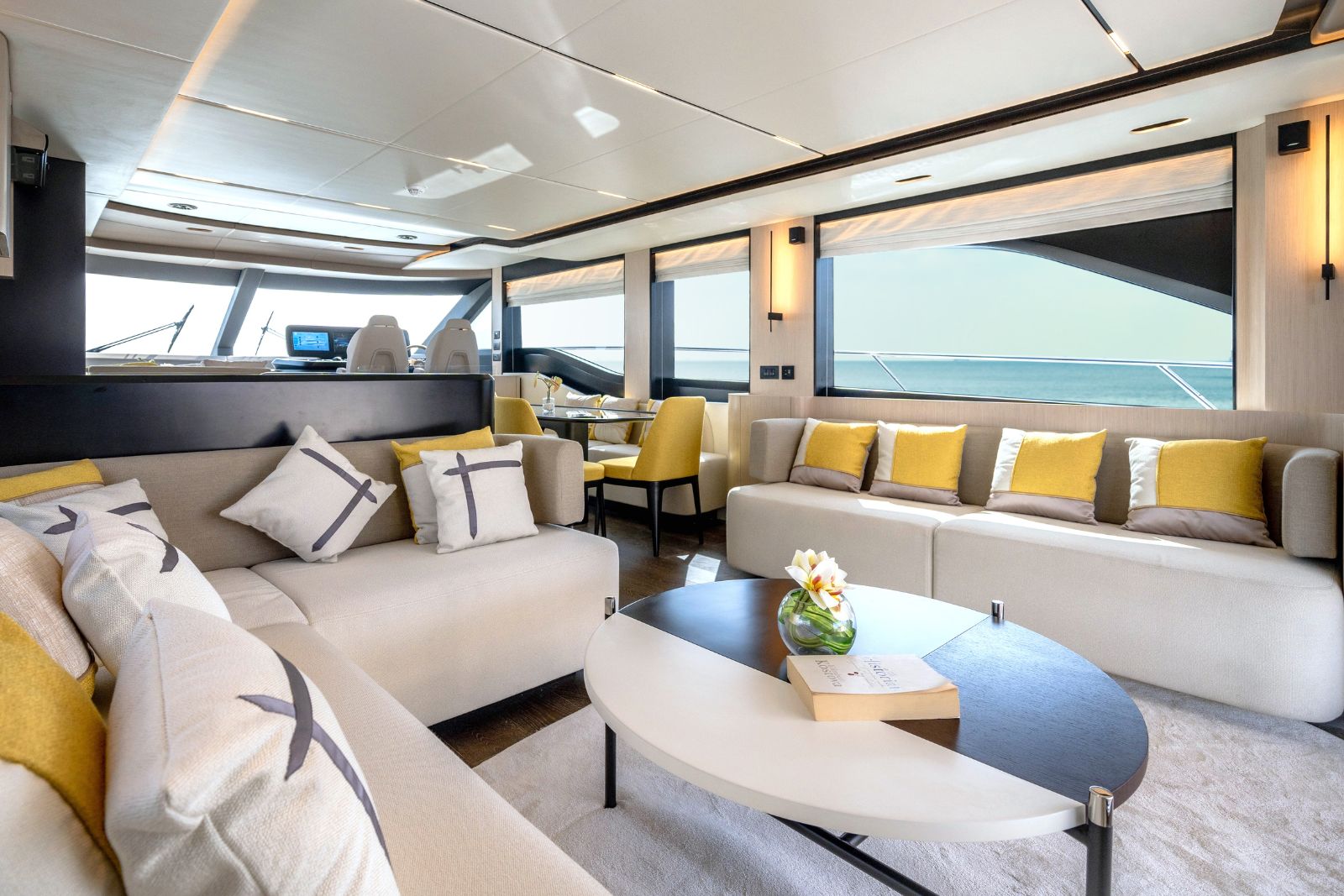 The Majesty 72 delivers an exceptional sense of space, highlighted by an impressive beam that rivals much larger yachts. Her open-plan layout creates seamless indoor–outdoor living, enhanced by panoramic windows and uninterrupted ocean views, resulting in a light-filled, fluid environment across every deck.