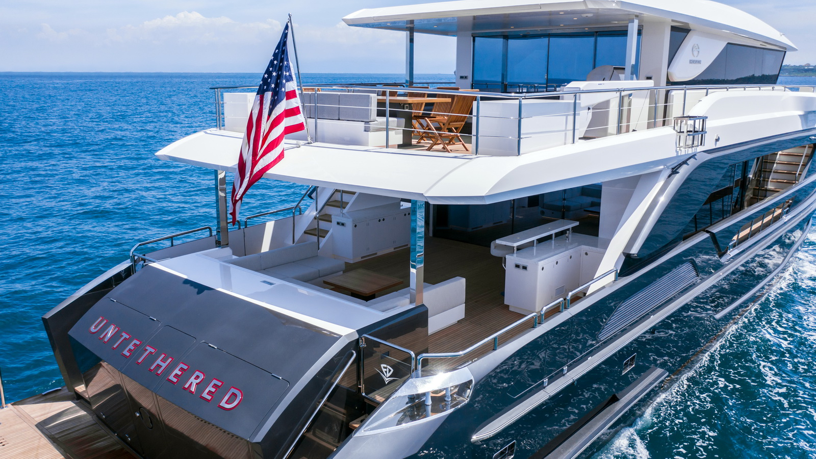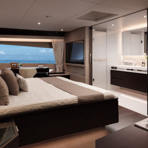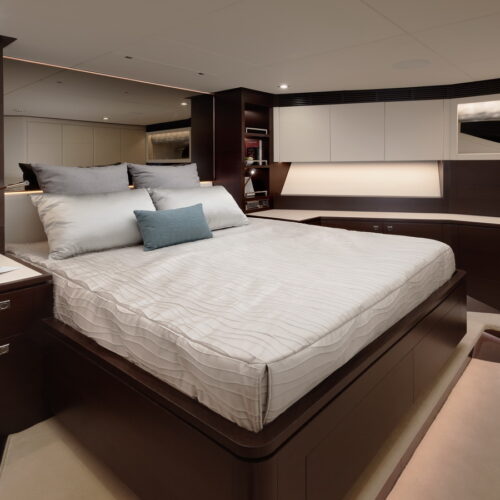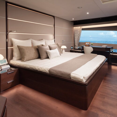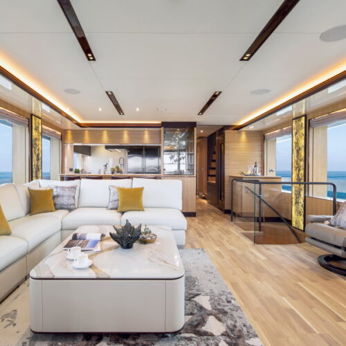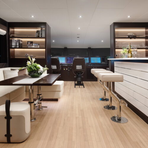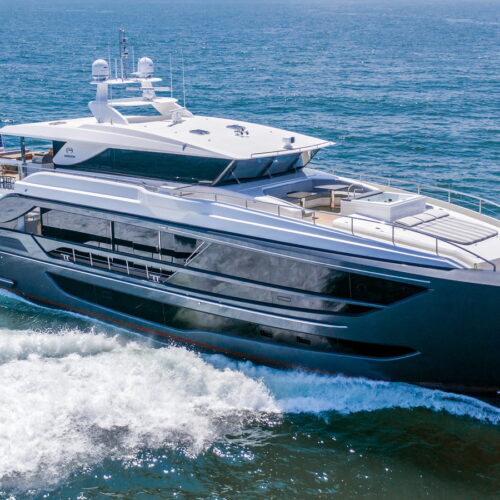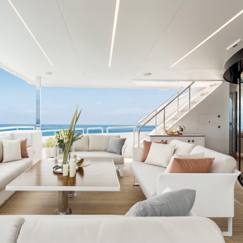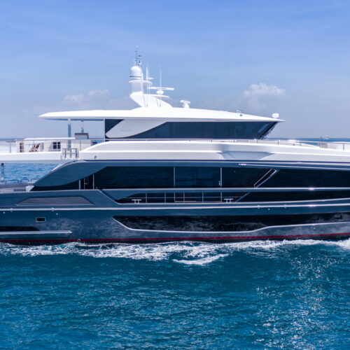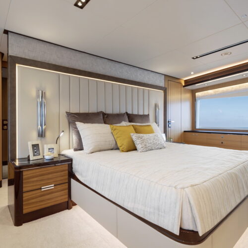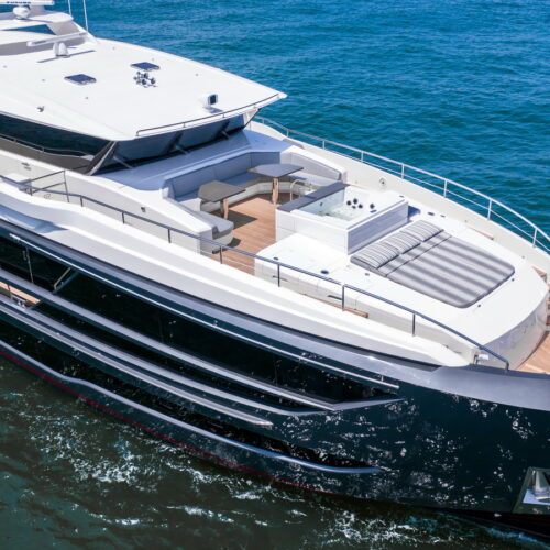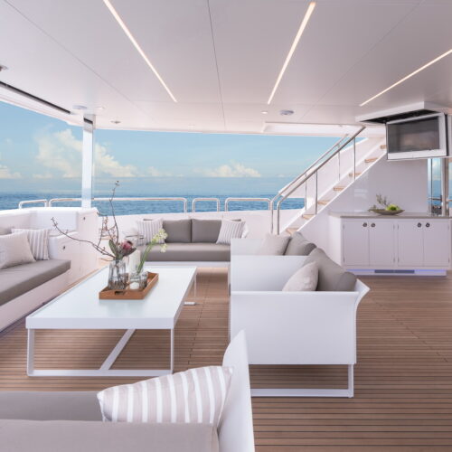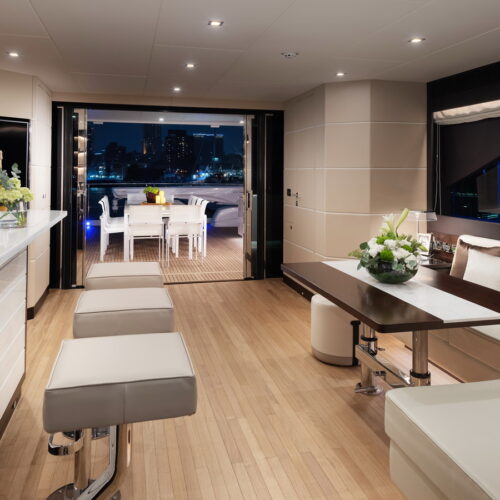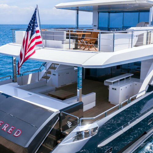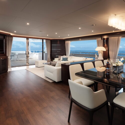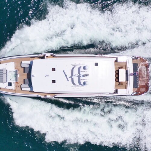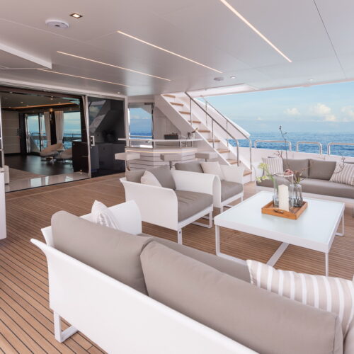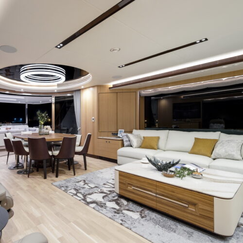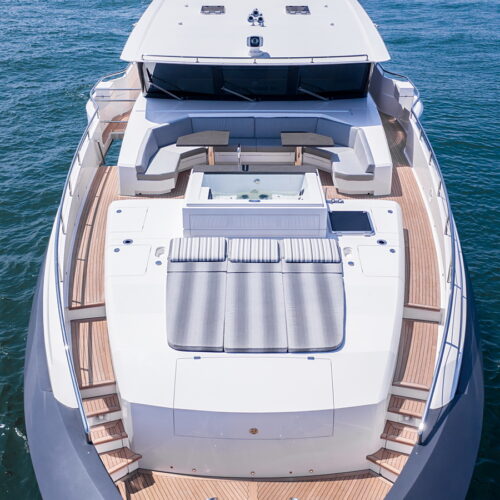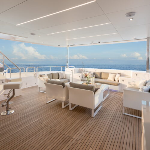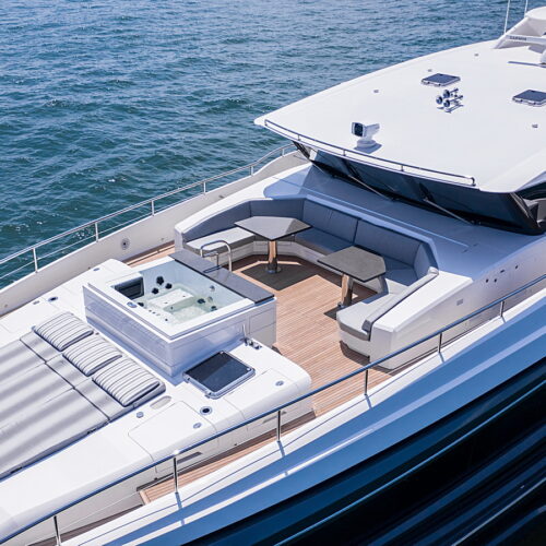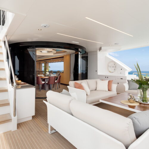This five-stateroom yacht features an on-deck deluxe master stateroom and plentiful dining and entertaining areas throughout.