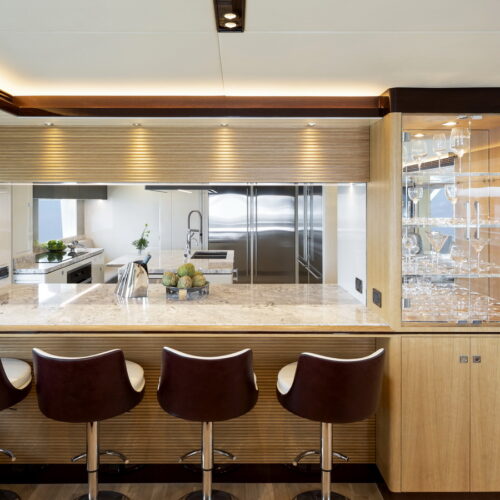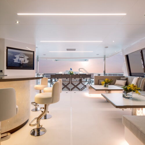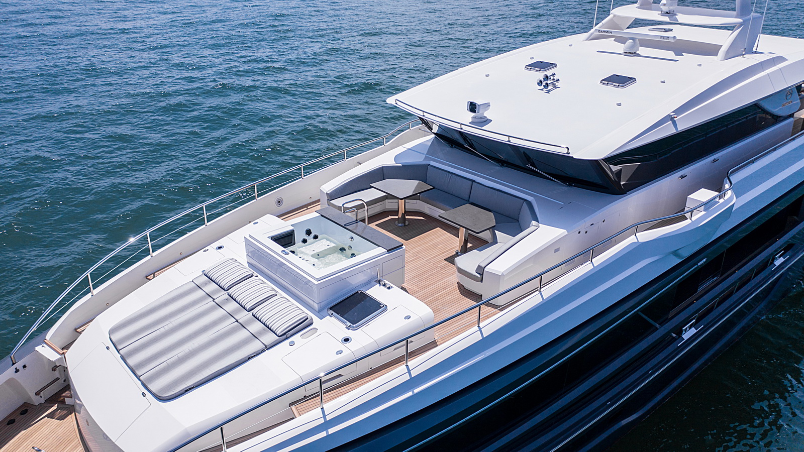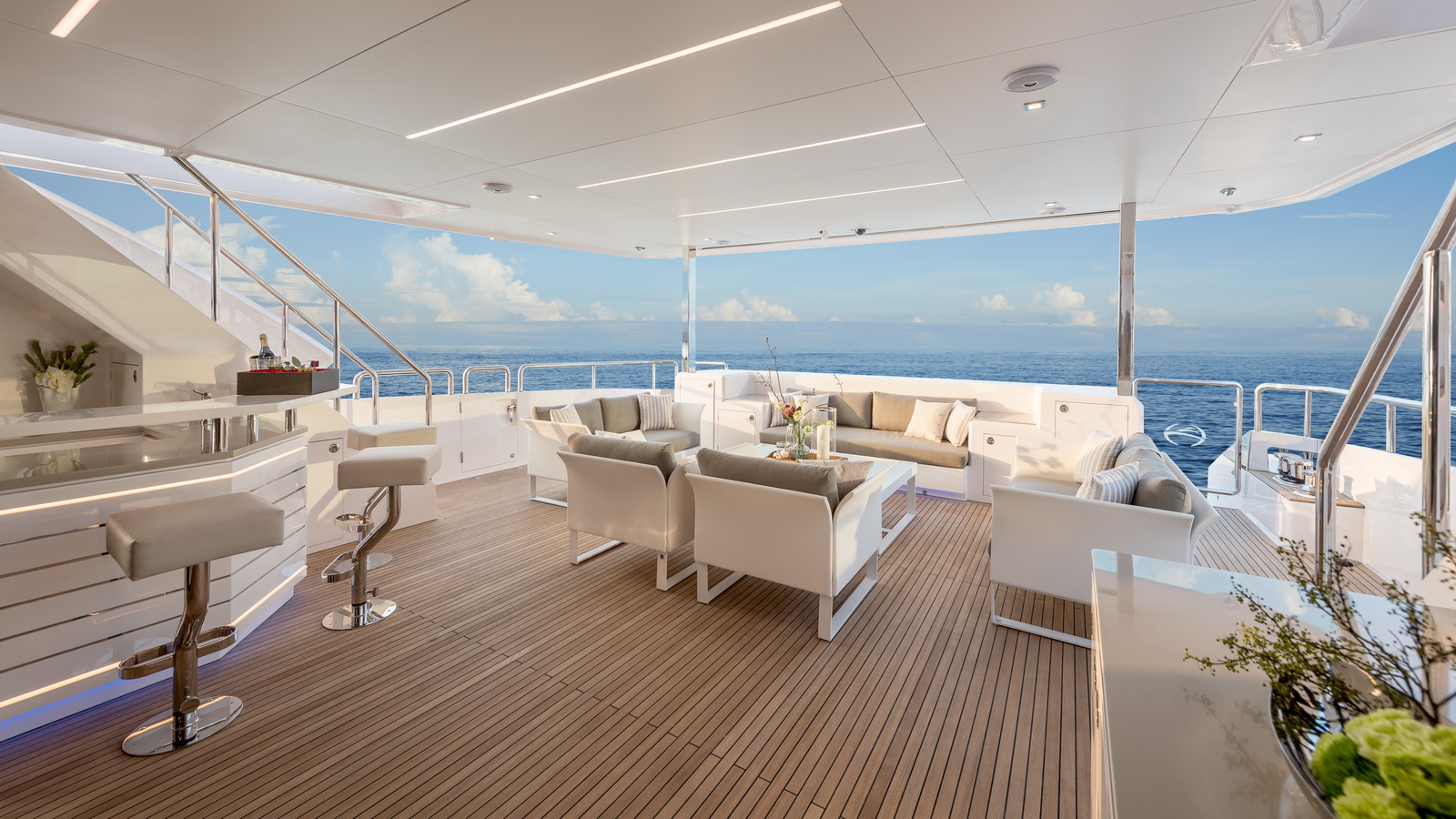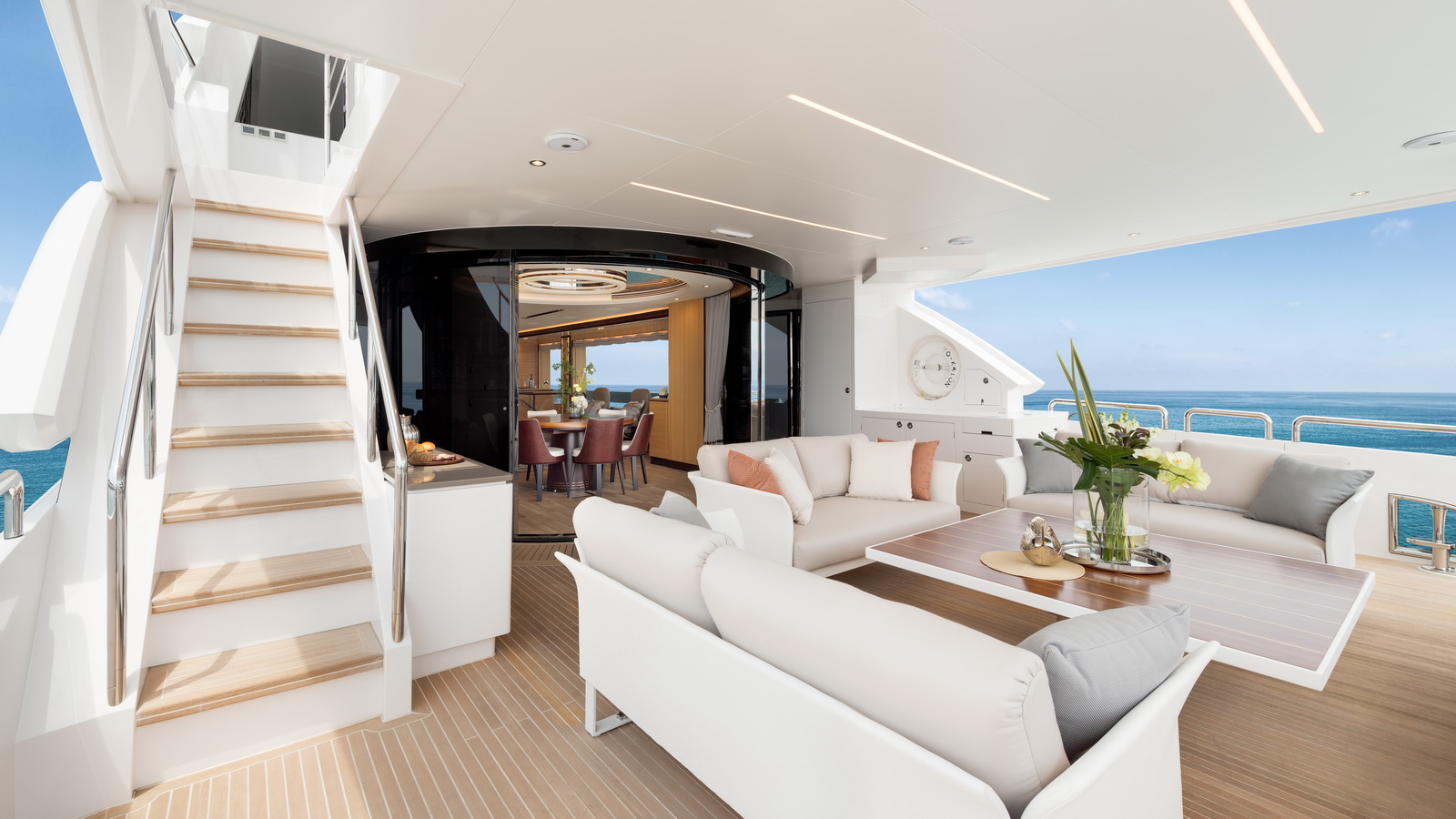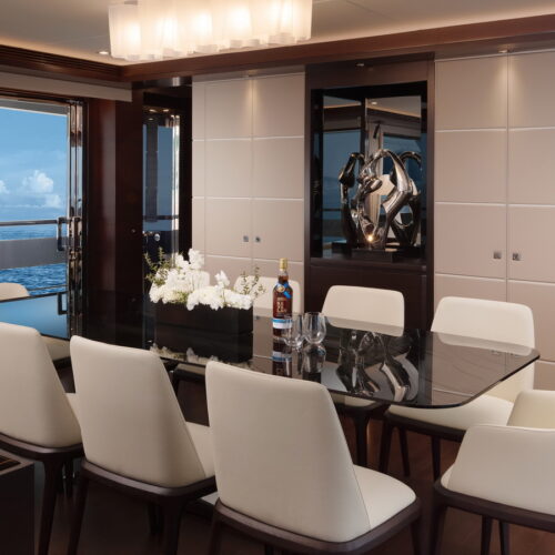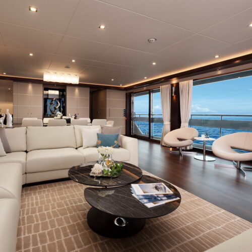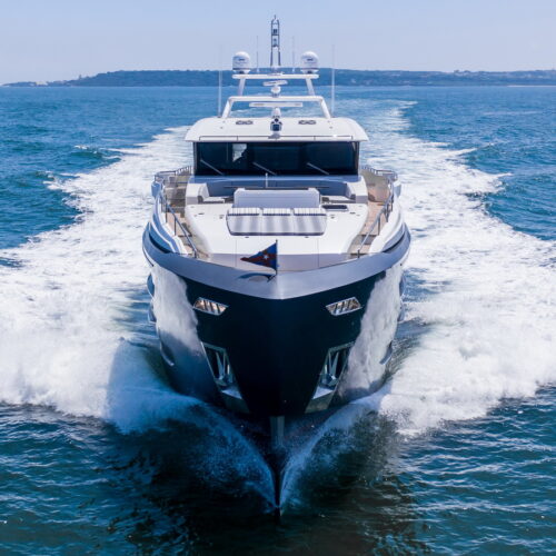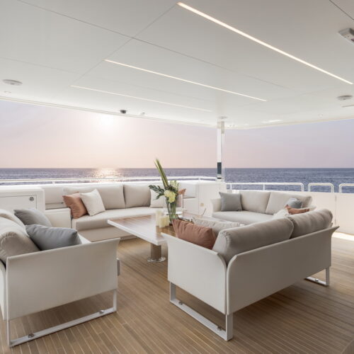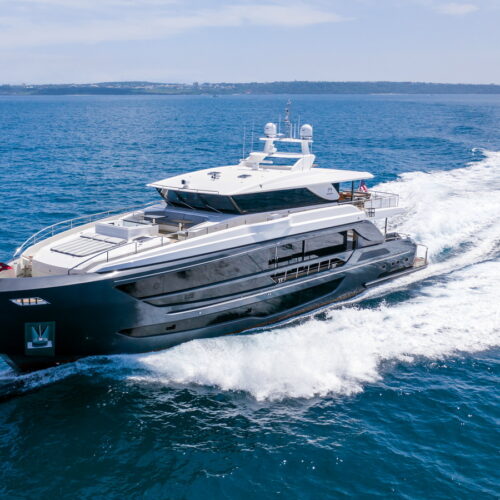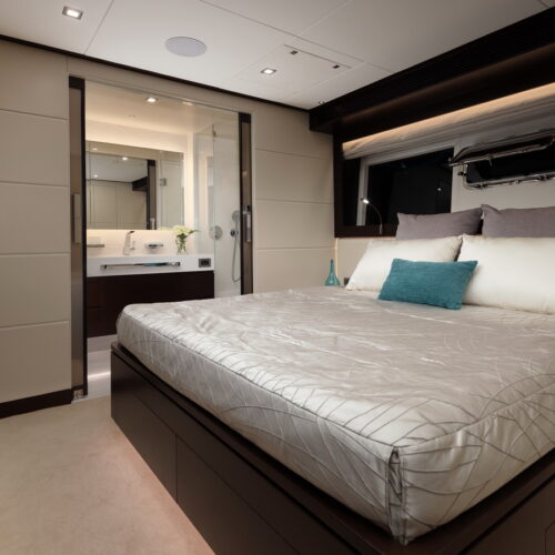 This five-stateroom yacht features an on-deck deluxe master stateroom and plentiful dining and entertaining areas throughout.
