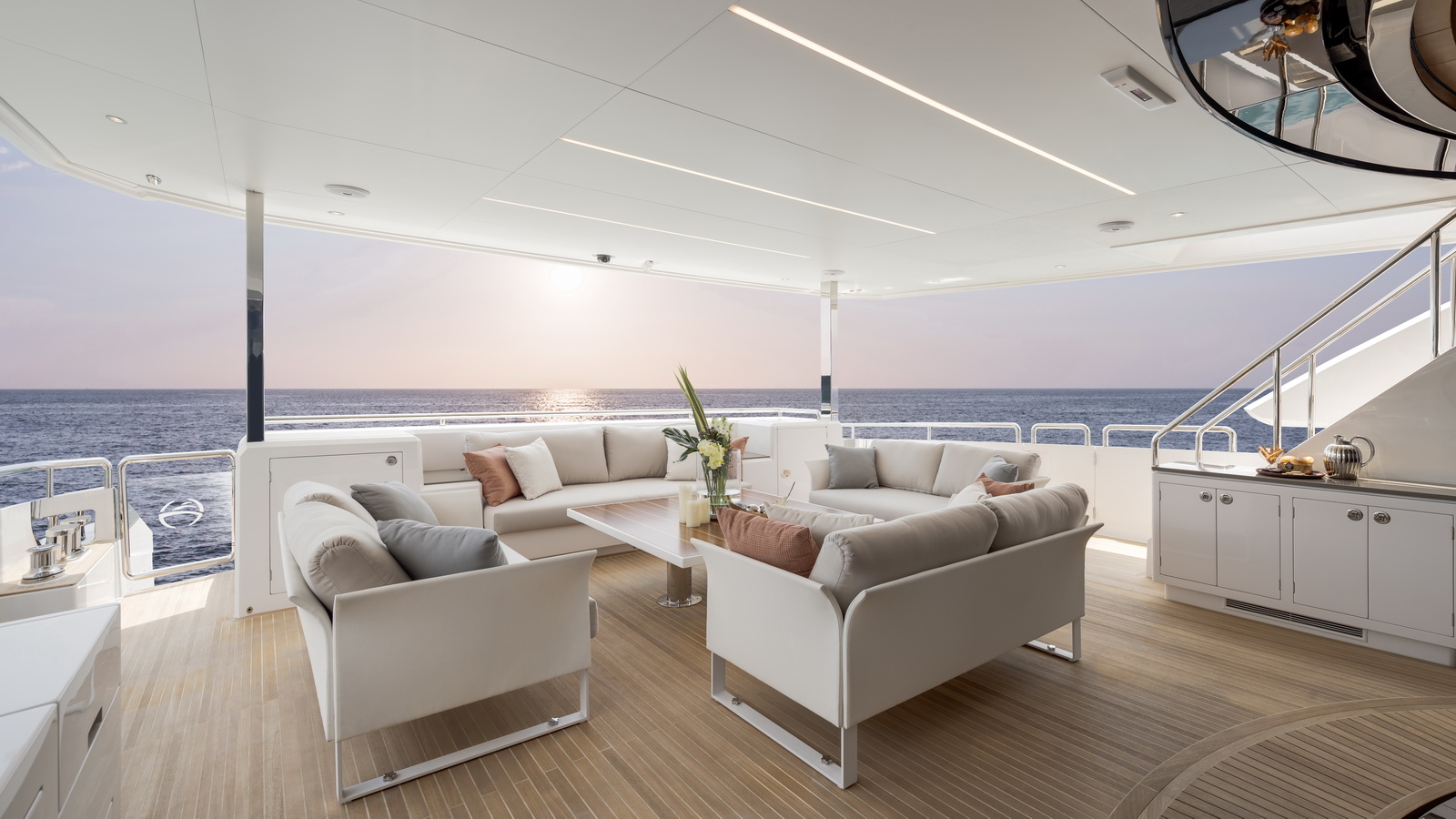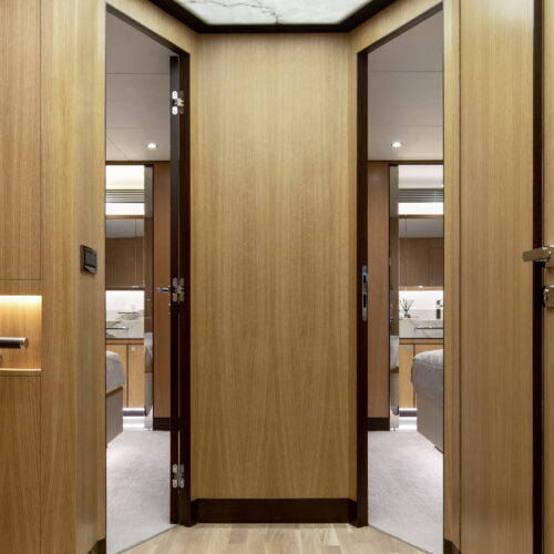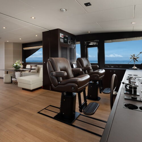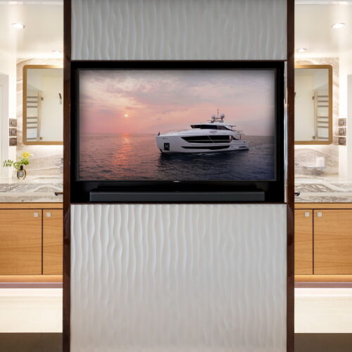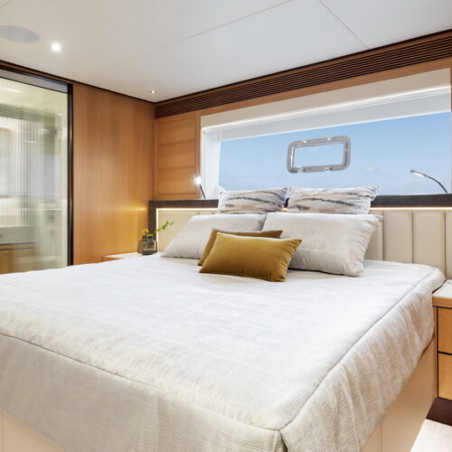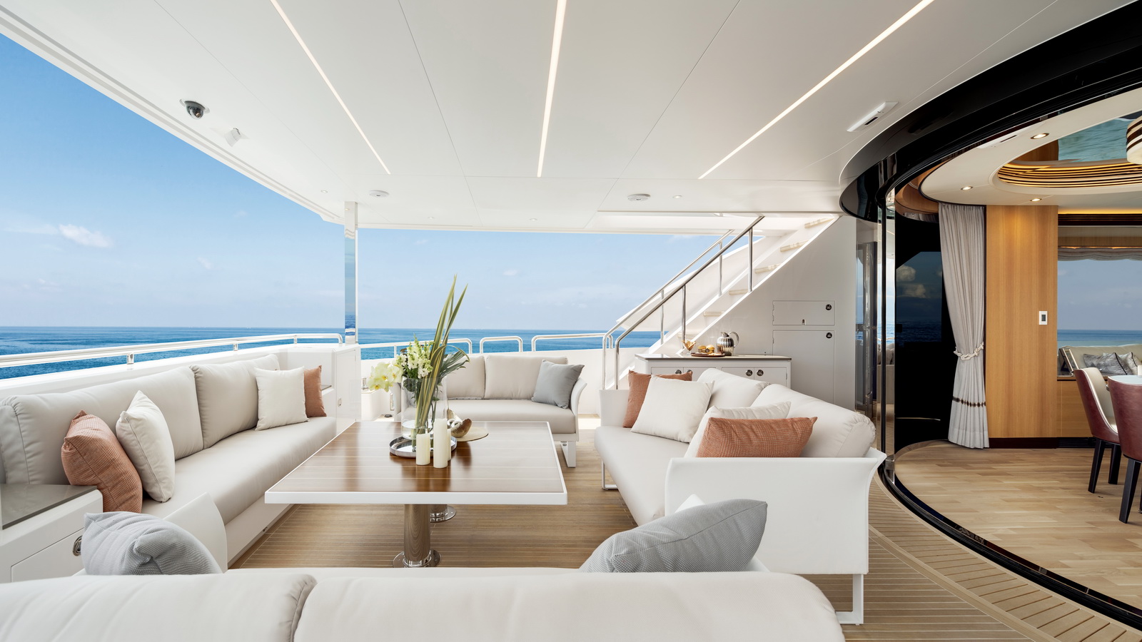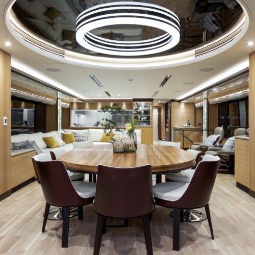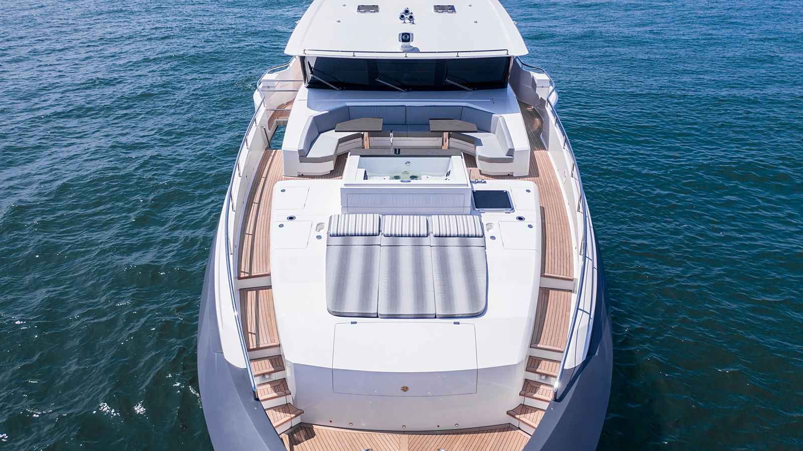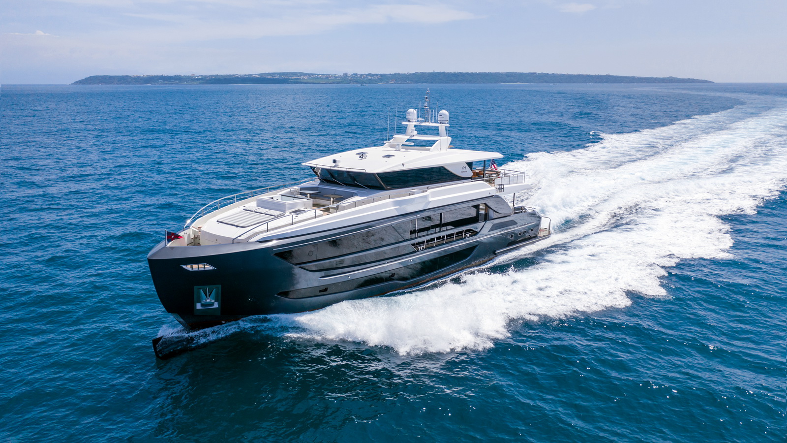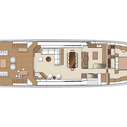 This five-stateroom yacht features an on-deck deluxe master stateroom and plentiful dining and entertaining areas throughout.