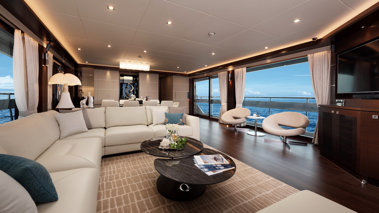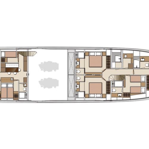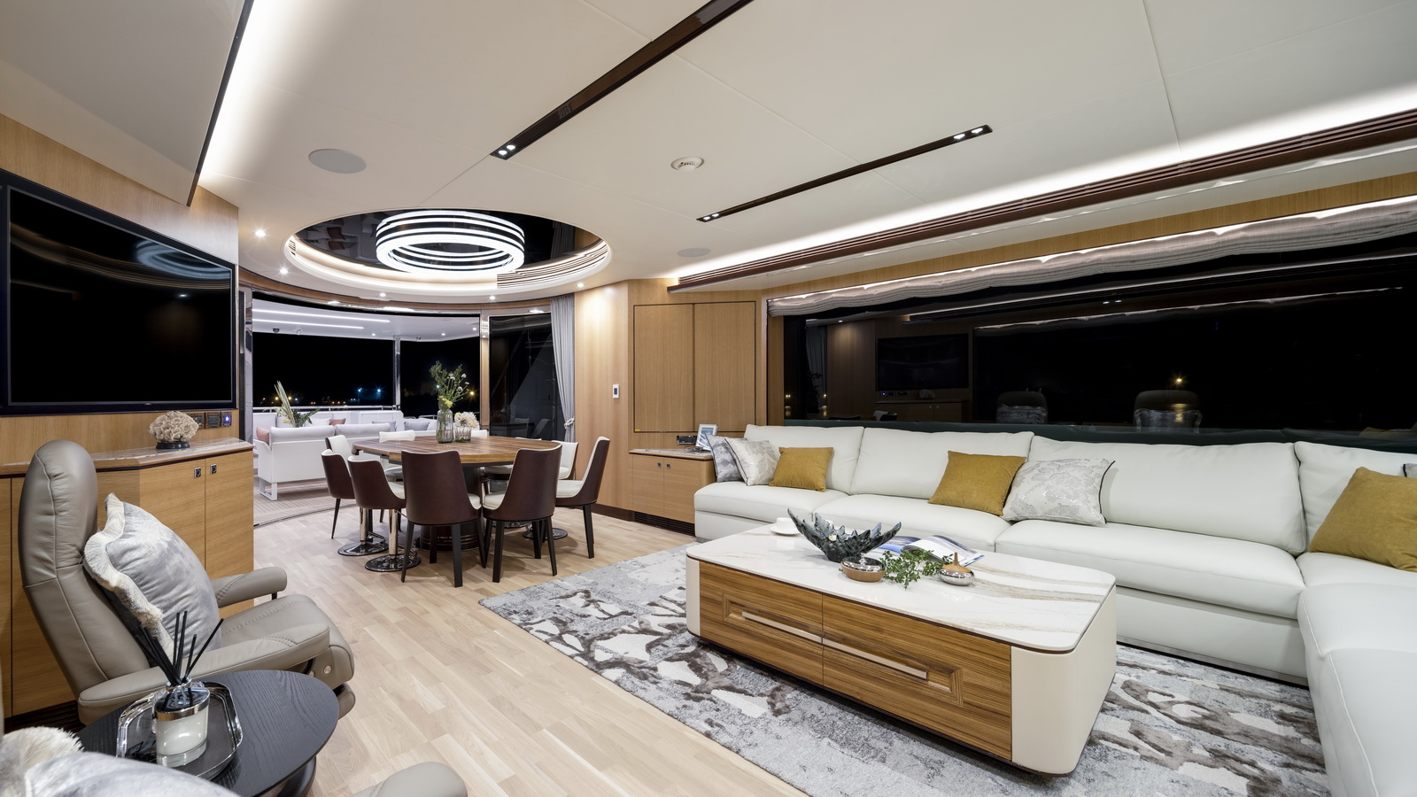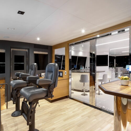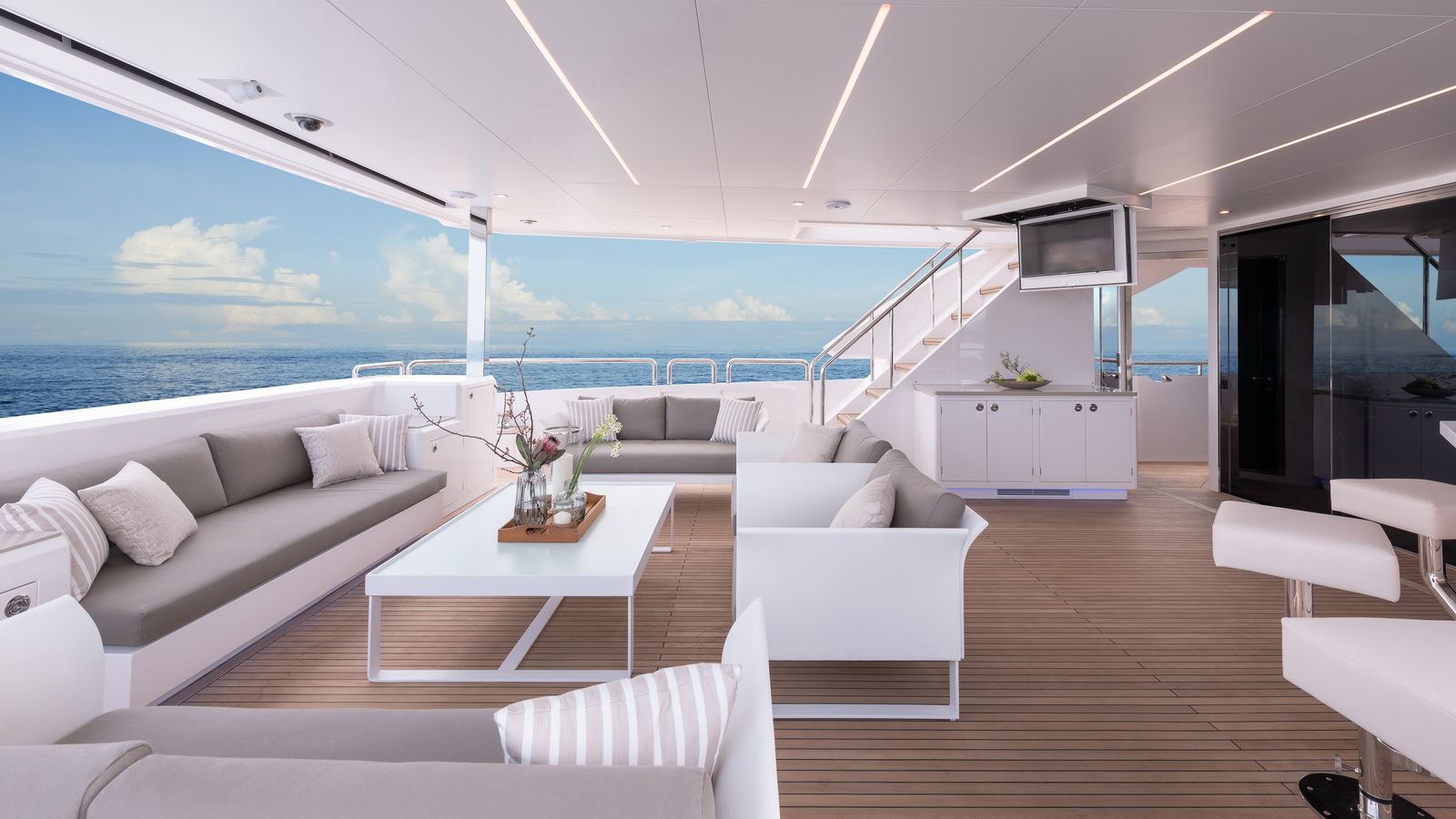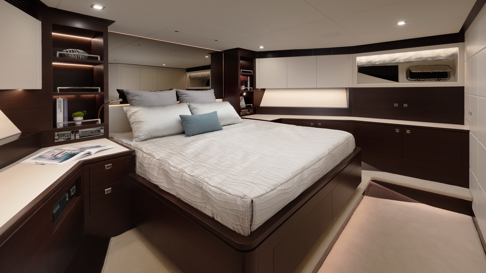 This five-stateroom yacht features an on-deck deluxe master stateroom and plentiful dining and entertaining areas throughout.