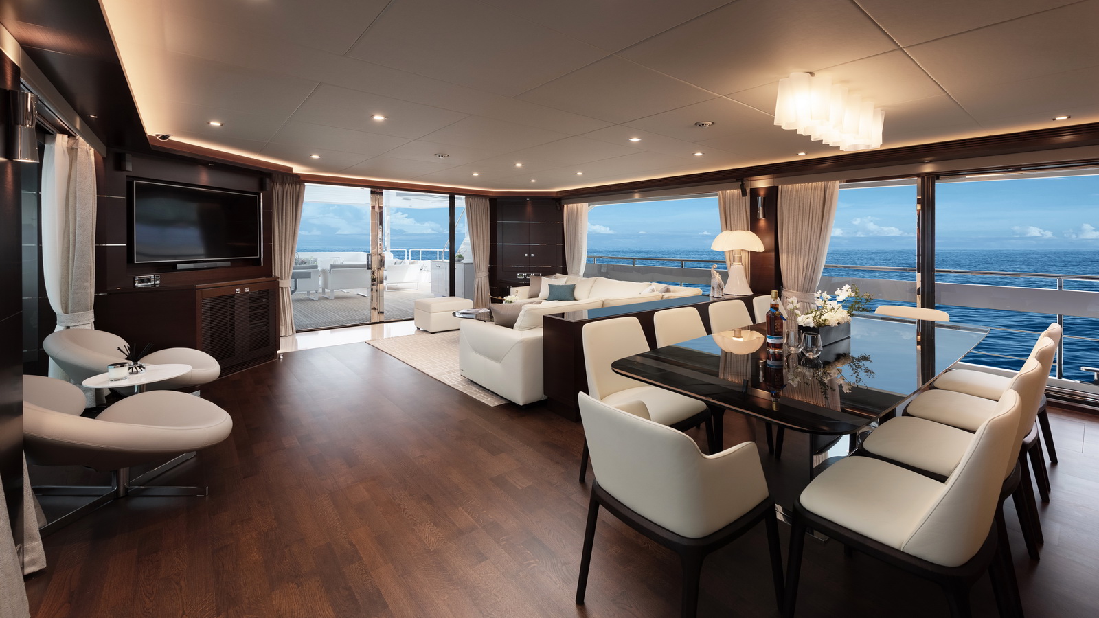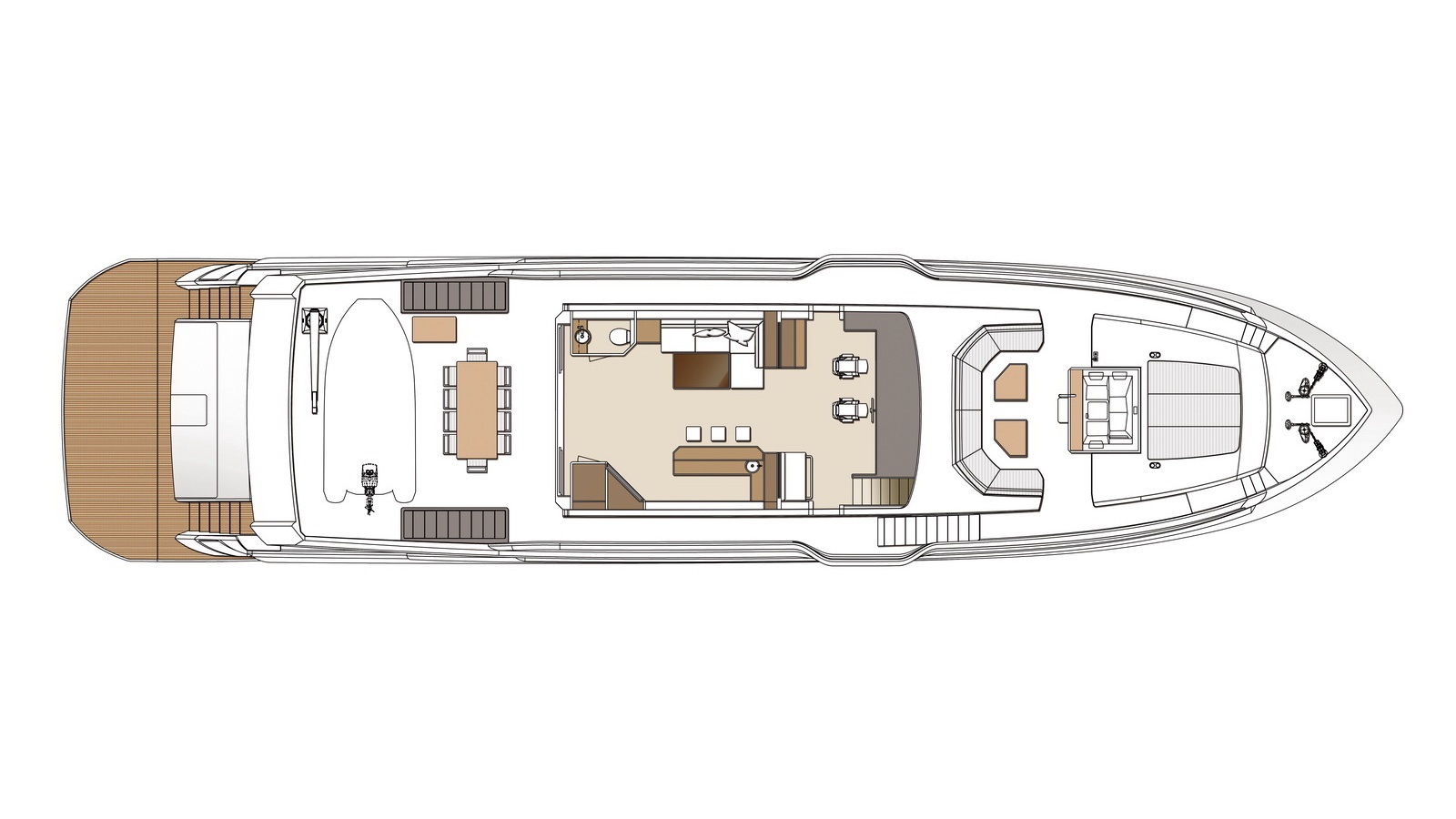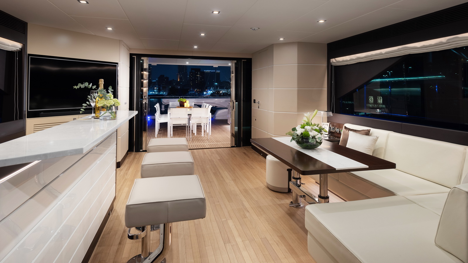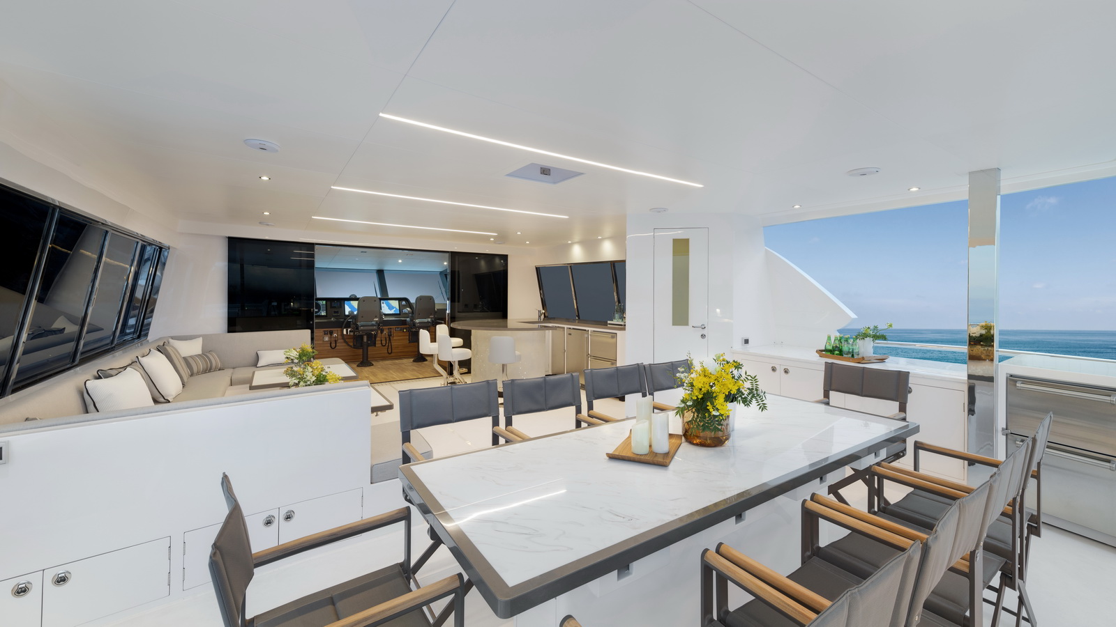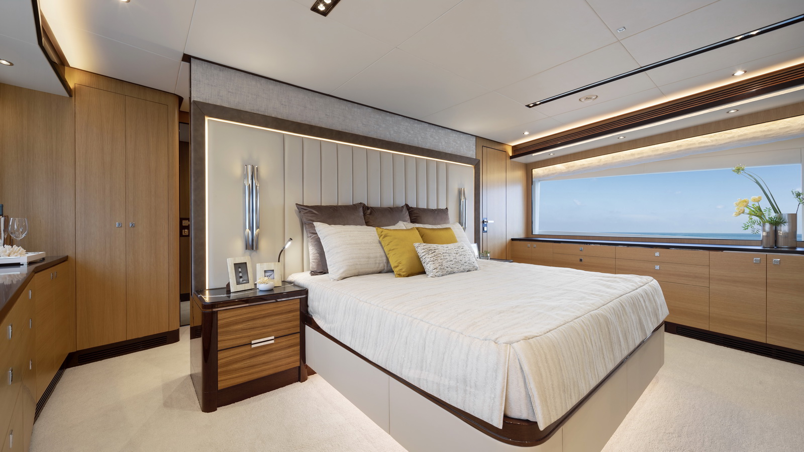 This five-stateroom yacht features an on-deck deluxe master stateroom and plentiful dining and entertaining areas throughout.