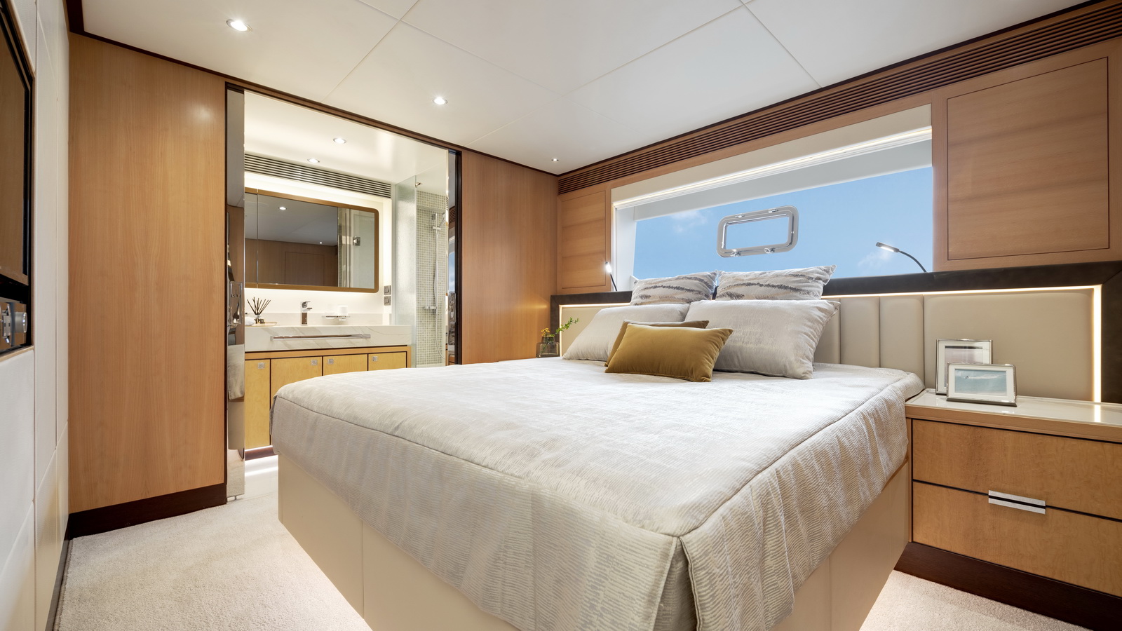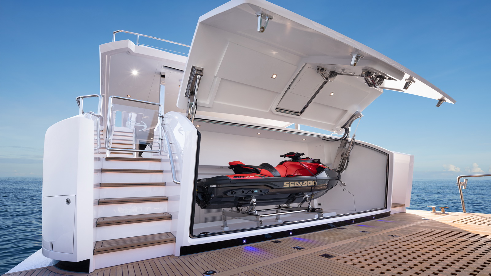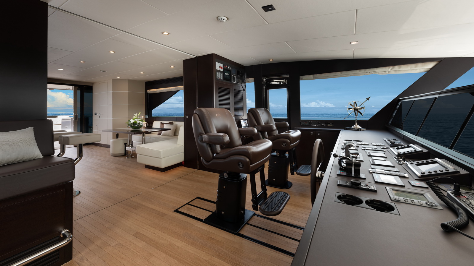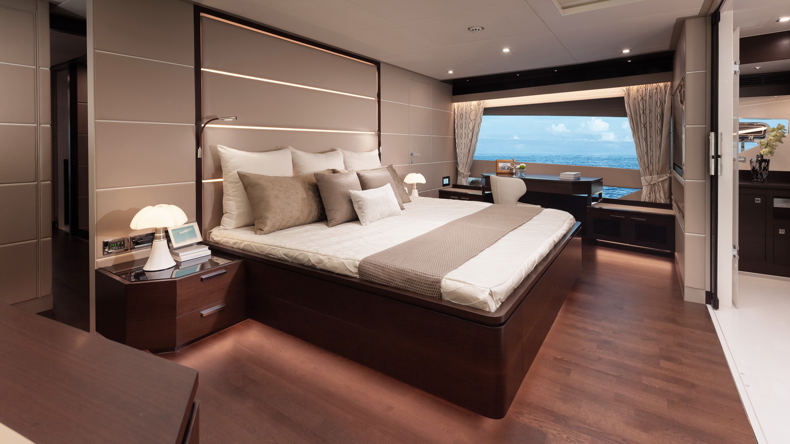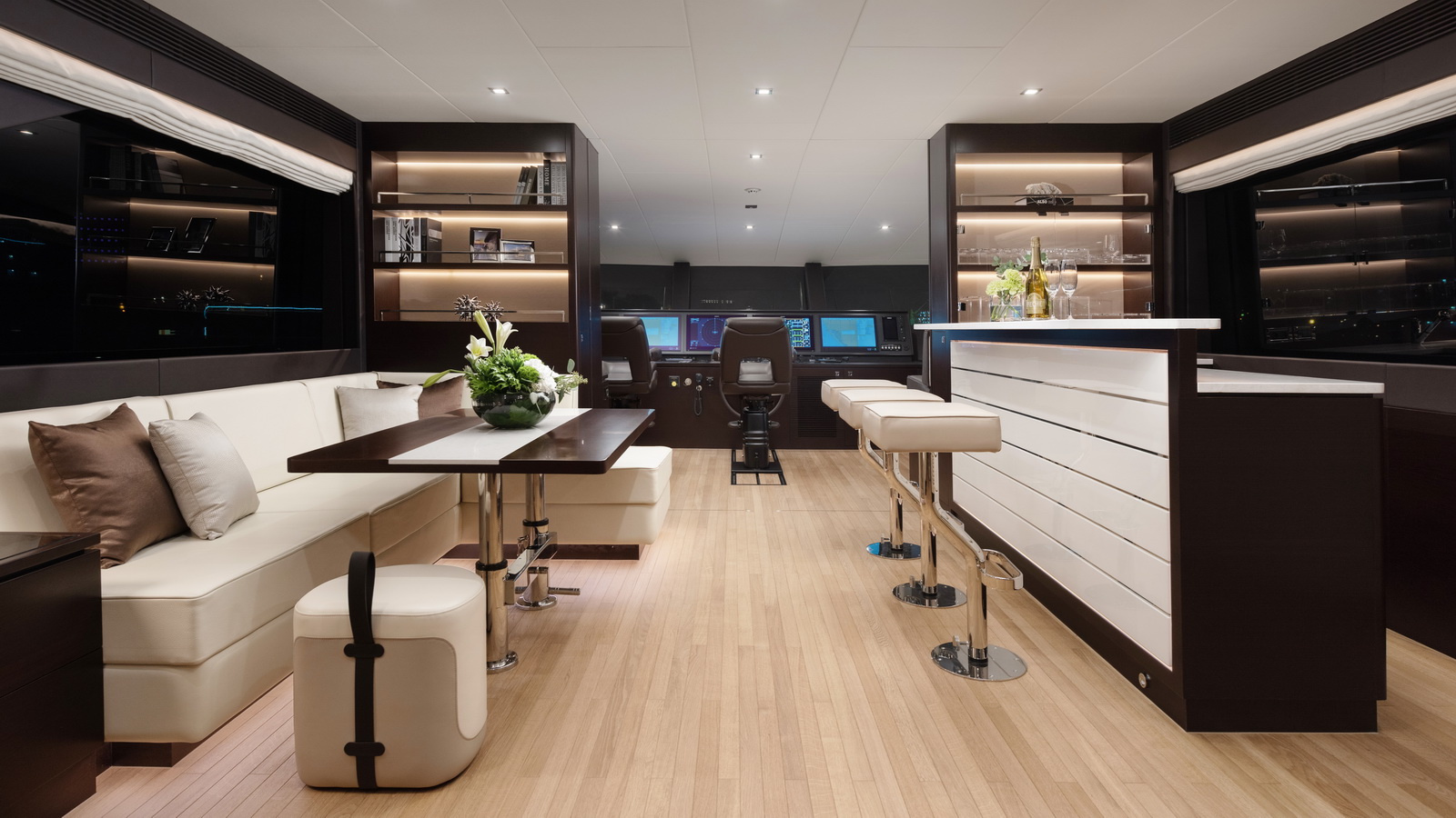 This five-stateroom yacht features an on-deck deluxe master stateroom and plentiful dining and entertaining areas throughout.