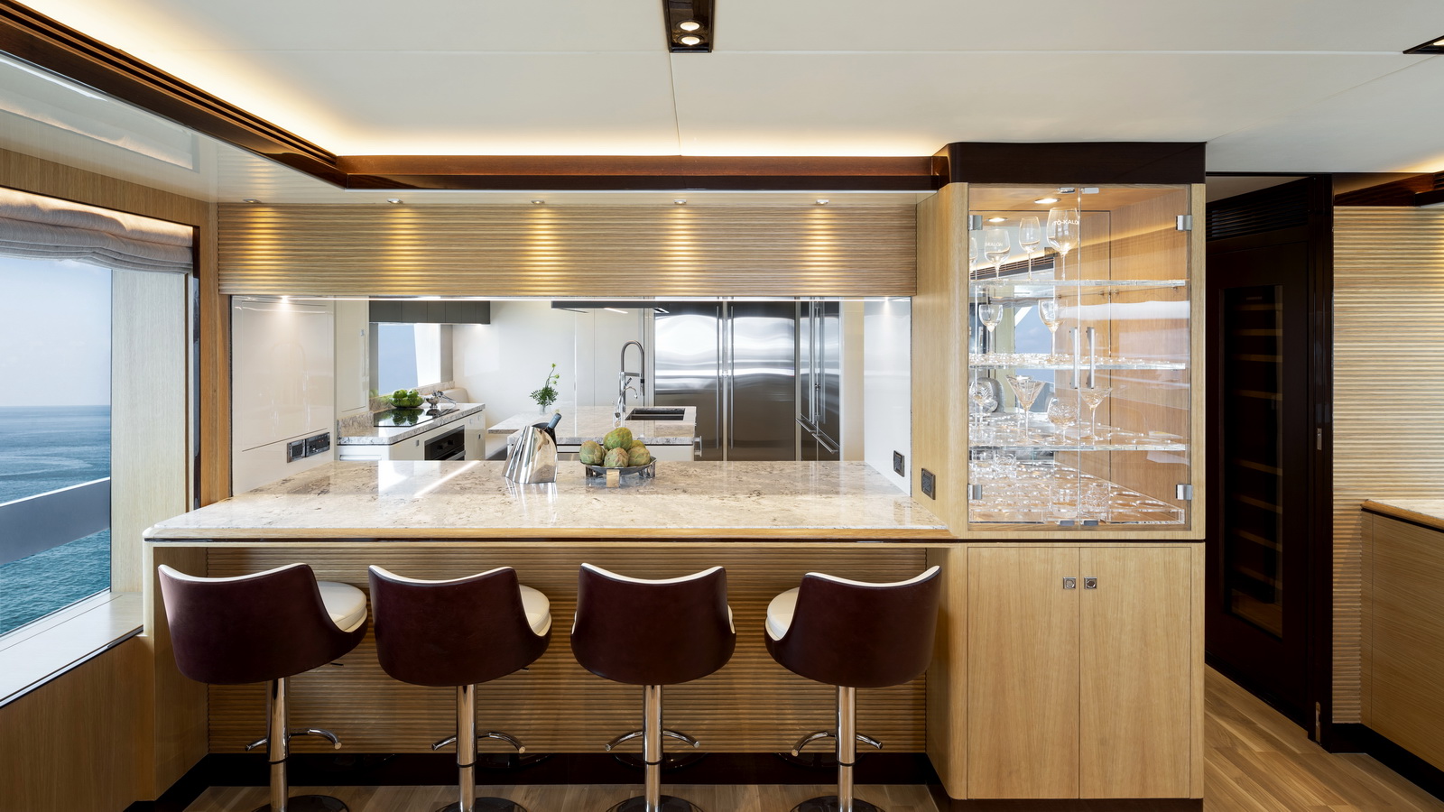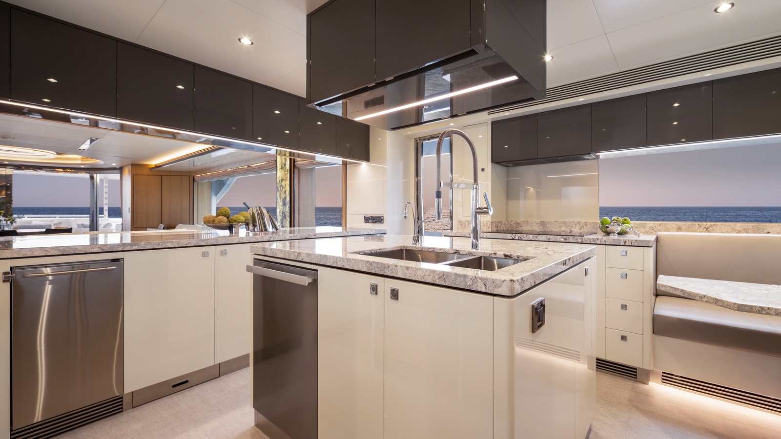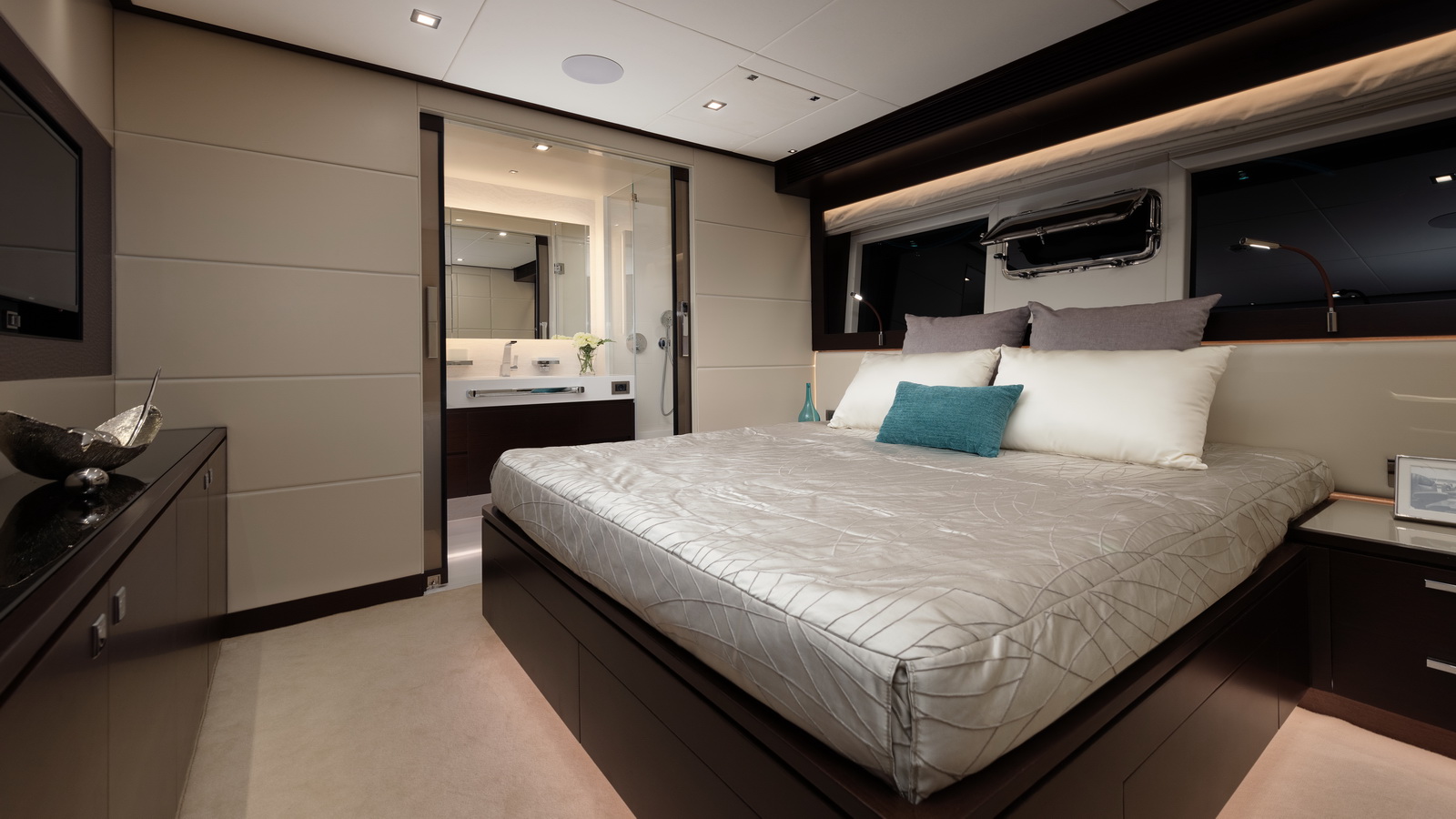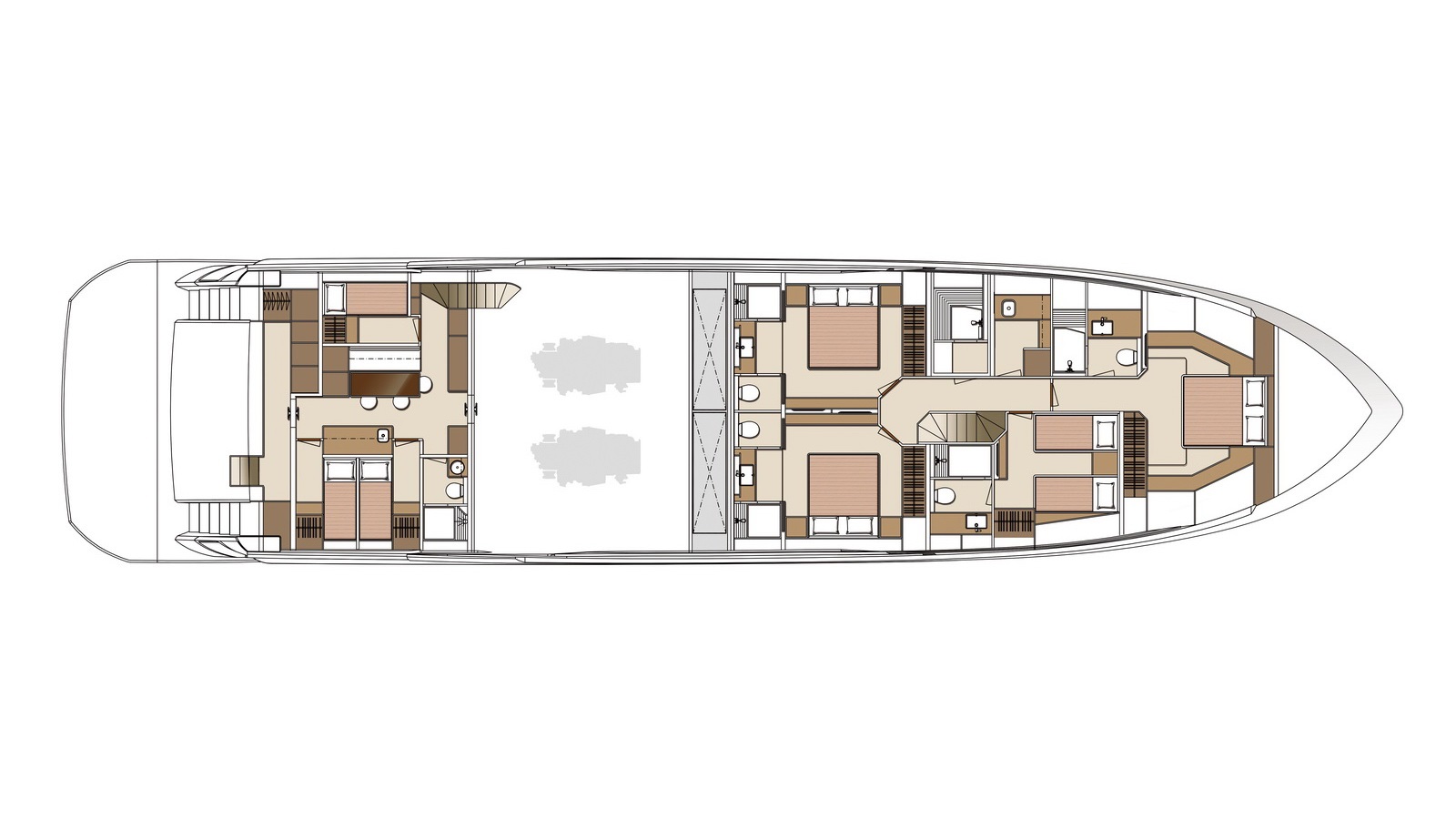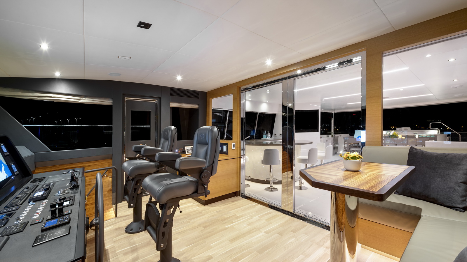 This five-stateroom yacht features an on-deck deluxe master stateroom and plentiful dining and entertaining areas throughout.