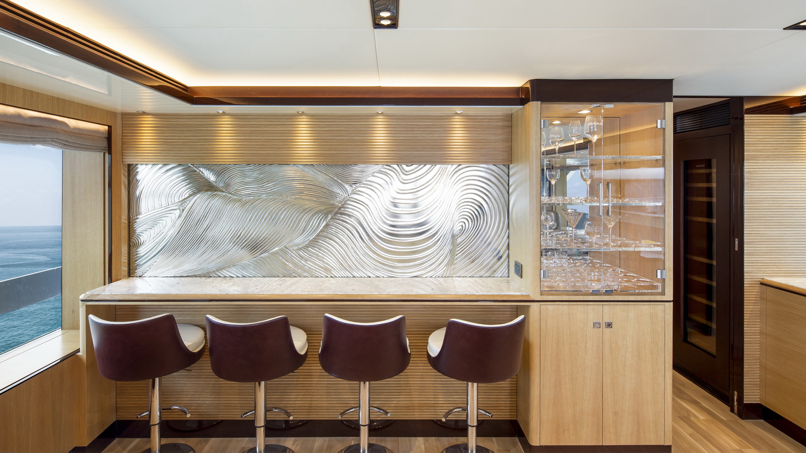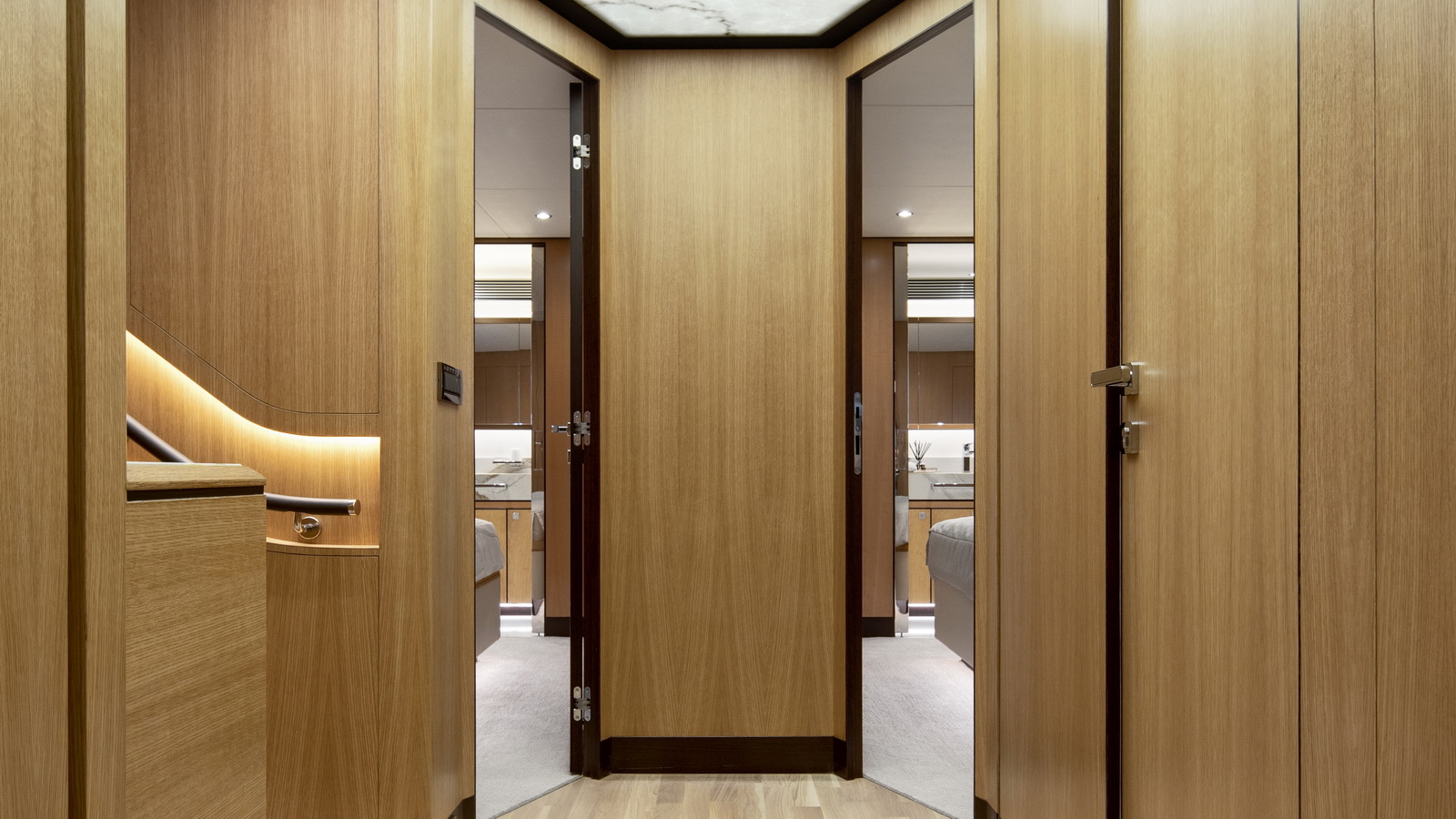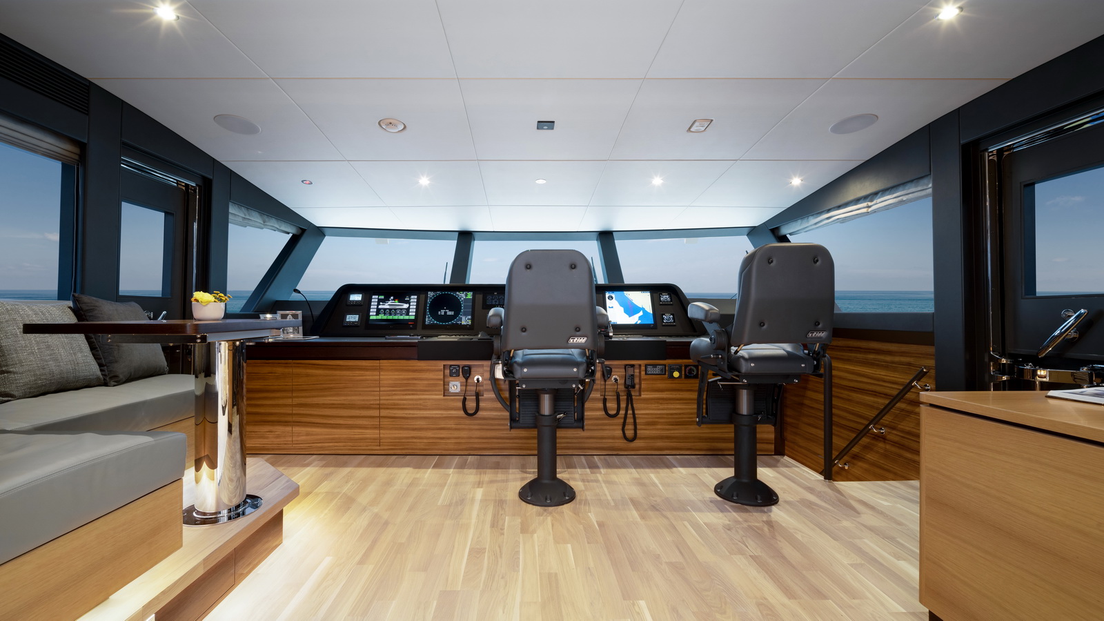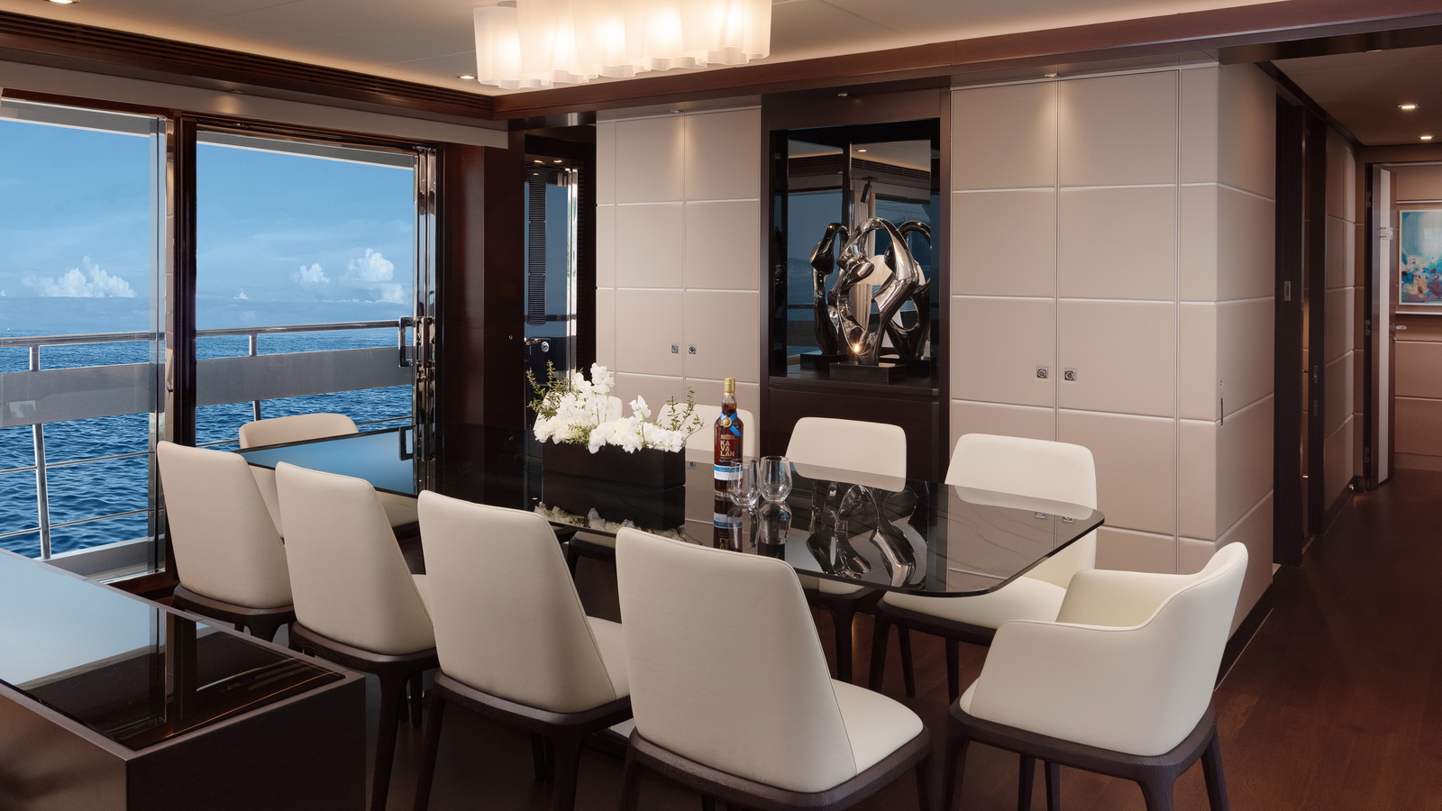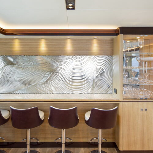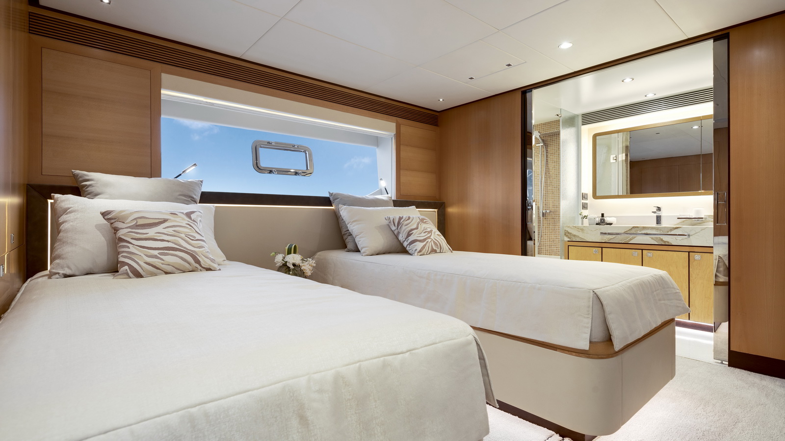 This five-stateroom yacht features an on-deck deluxe master stateroom and plentiful dining and entertaining areas throughout.