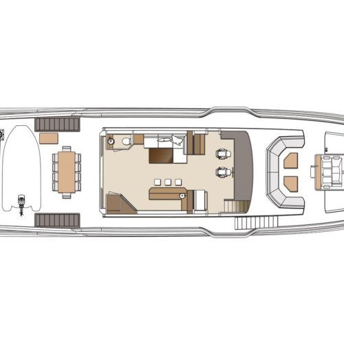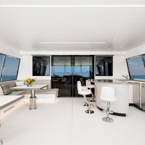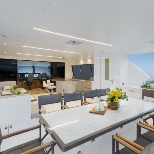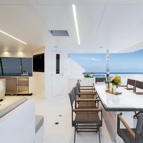 Offered in a Tri-Deck or Skyline configuration, the FD110 comfortably accommodates a crew of six with a large, fully equipped beach club aft.