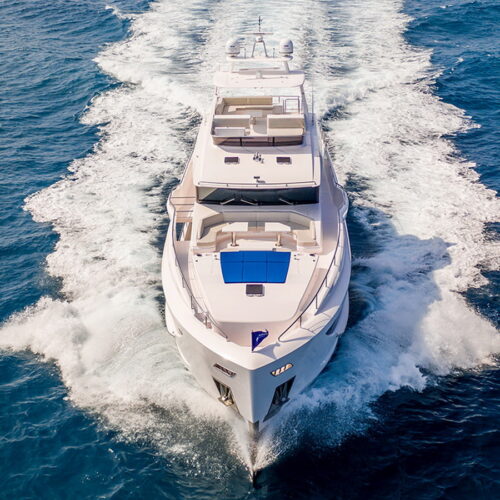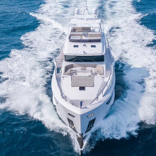 The Skyline configuration offers a large wheelhouse with enclosed skylounge aft along with ample deck space for entertaining. The FD100 is designed with spacious crew quarters for four aft as well as a fully equipped beach club.