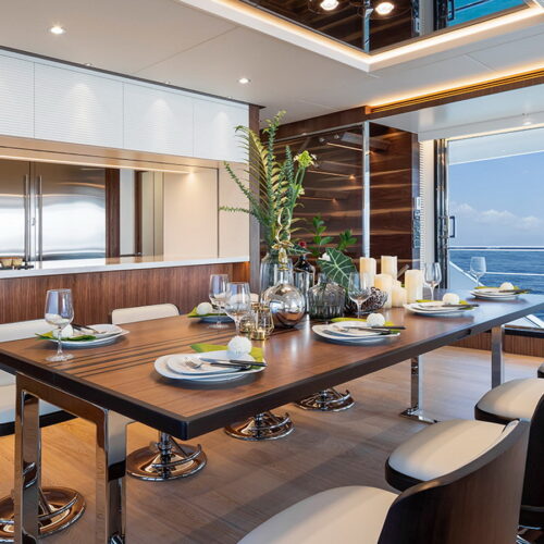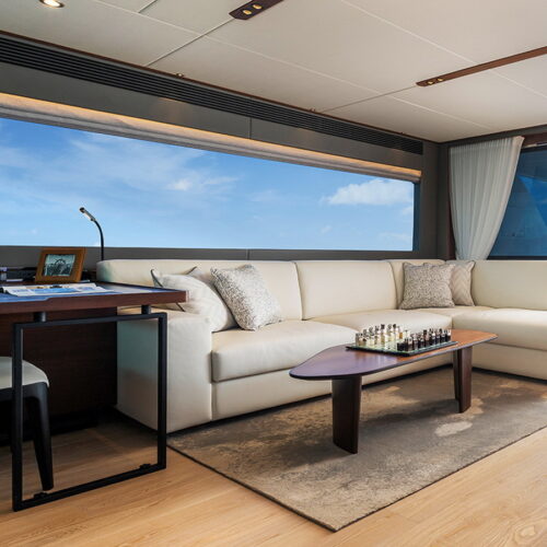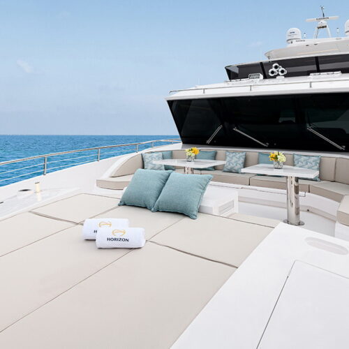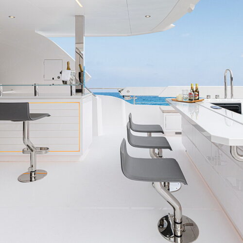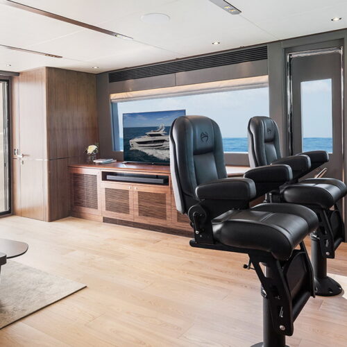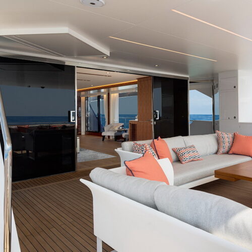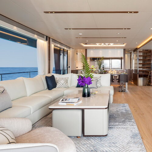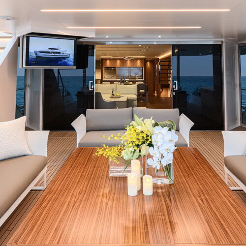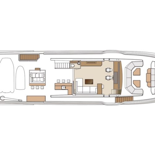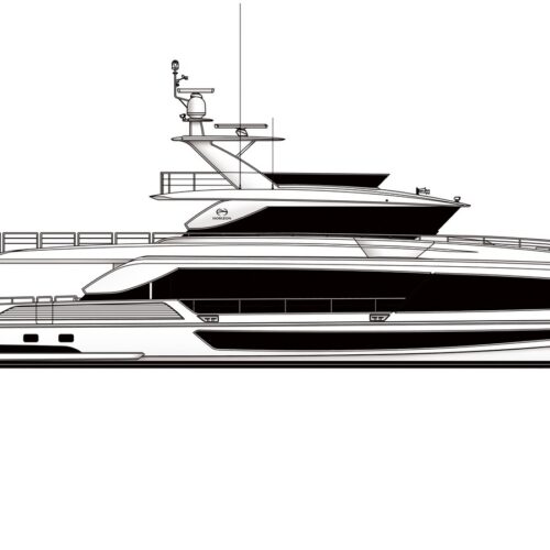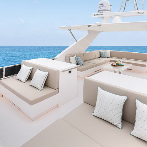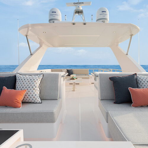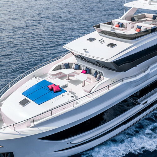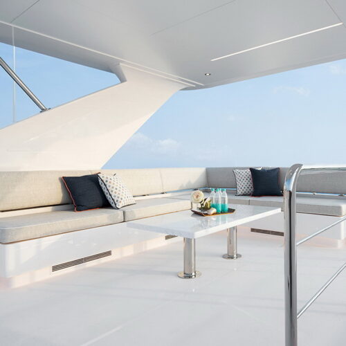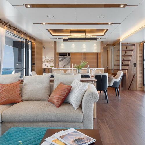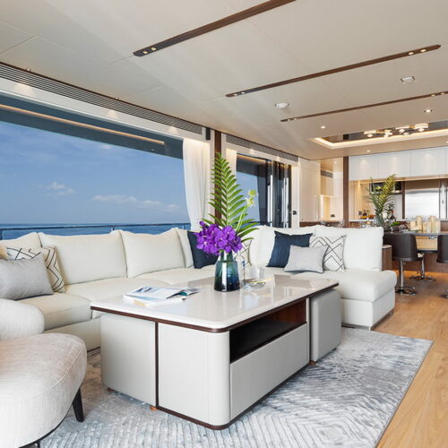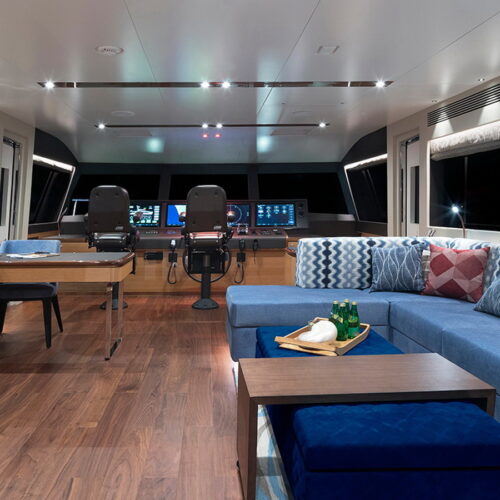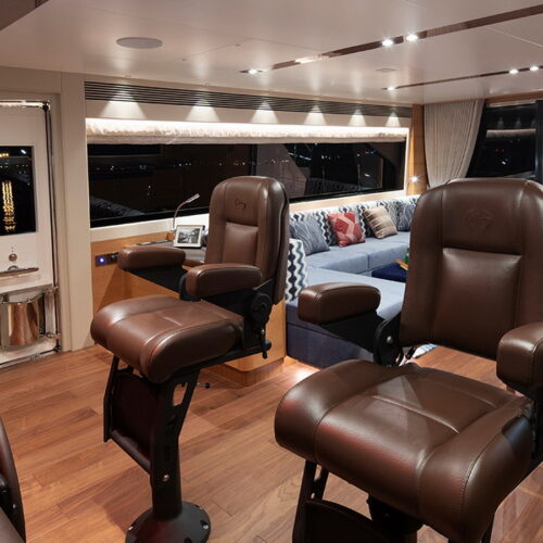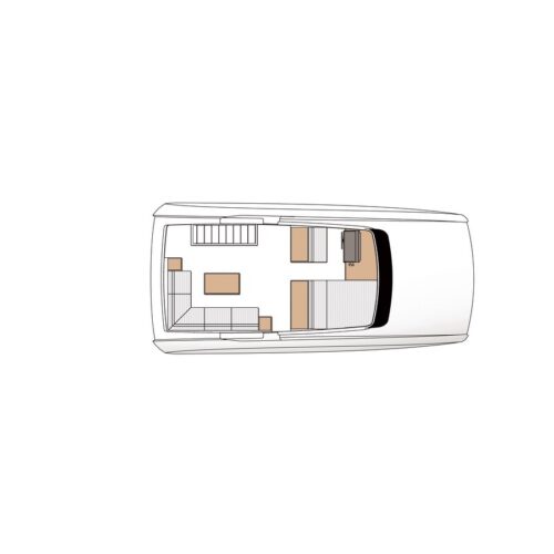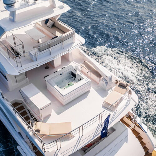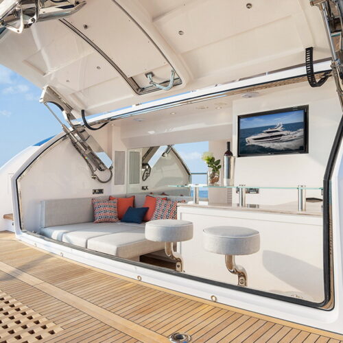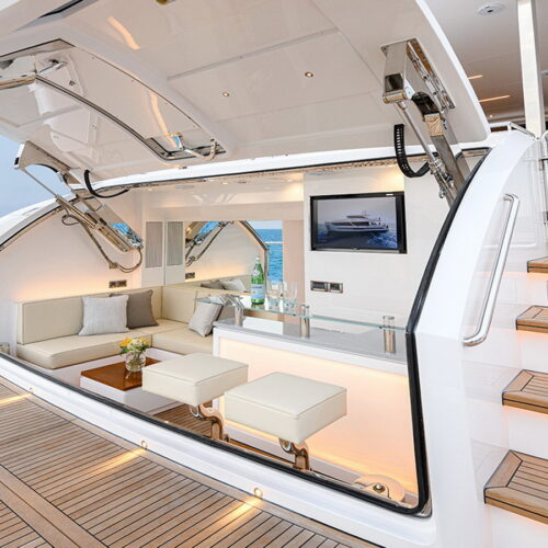 The Tri-Deck layout option offers a lightweight open flybridge equipped with a helm and seating area atop the bridge deck, which features a forward wheelhouse, interior skylounge with dayhead and bar and jacuzzi aft.