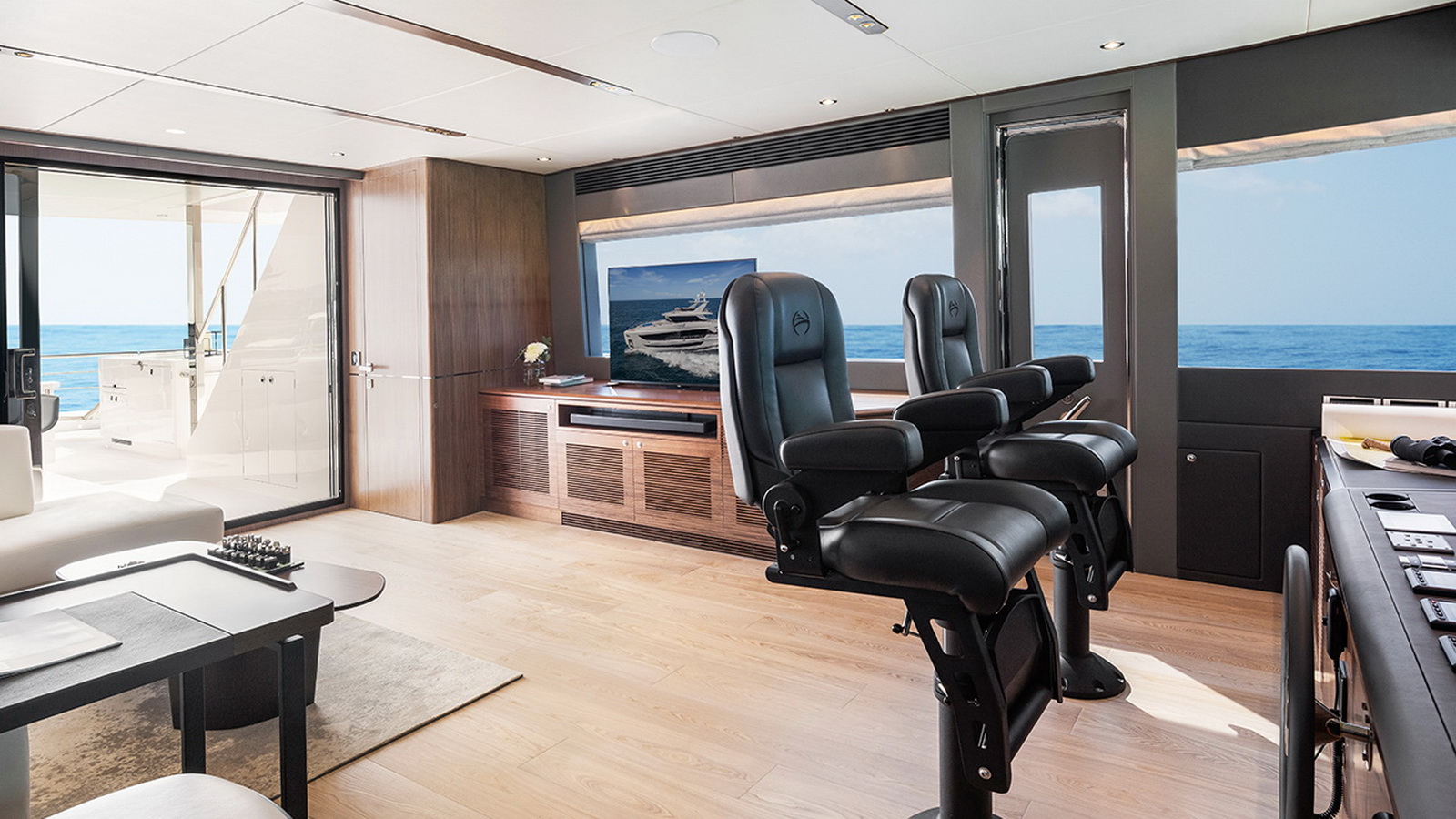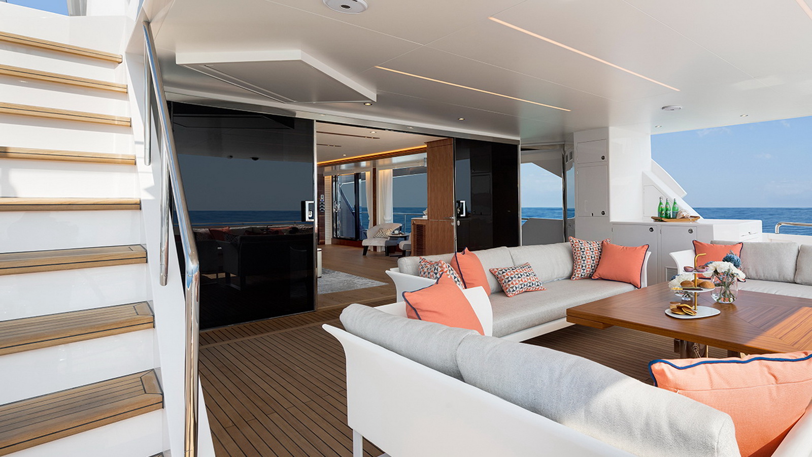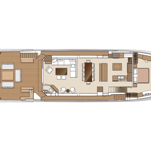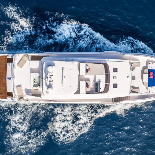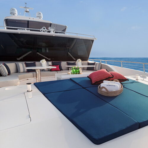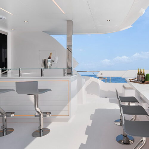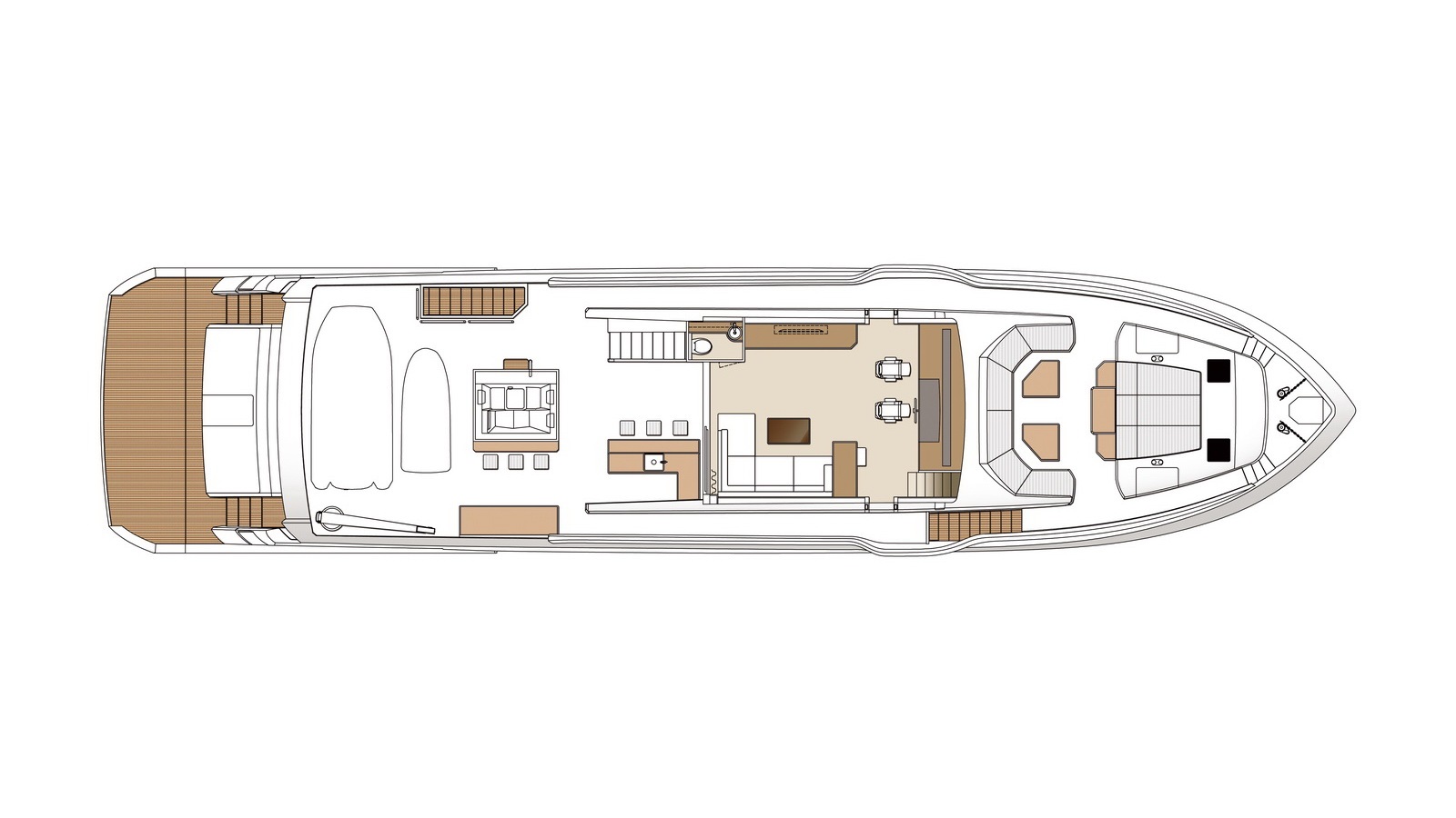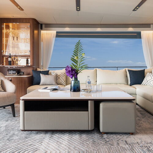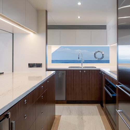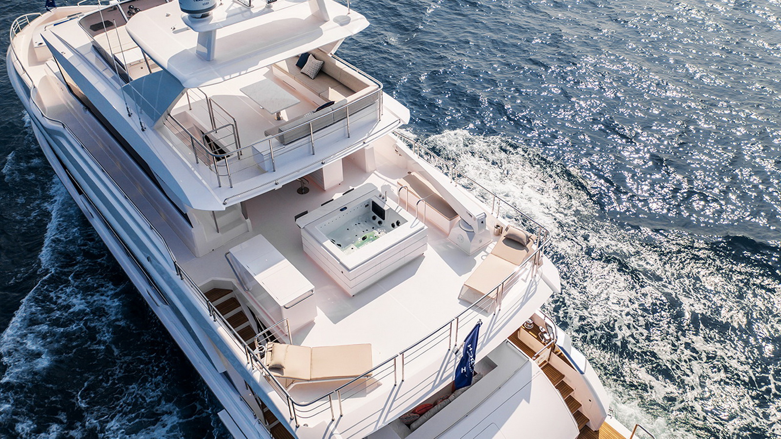 The Tri-Deck layout option offers a lightweight open flybridge equipped with a helm and seating area atop the bridge deck, which features a forward wheelhouse, interior skylounge with dayhead and bar and jacuzzi aft.