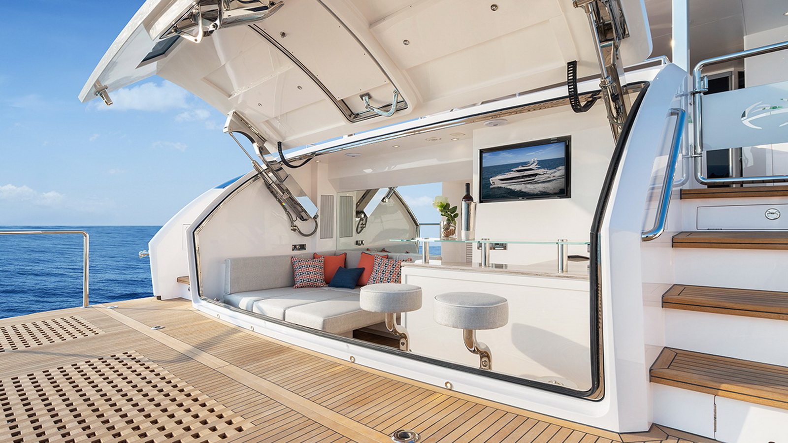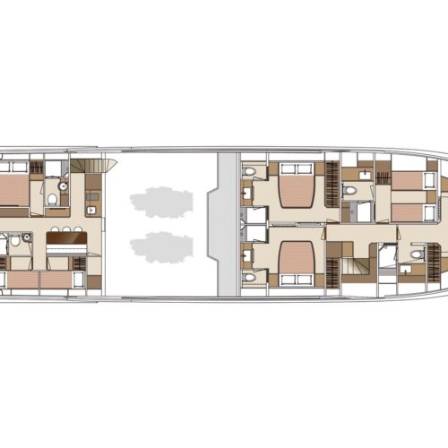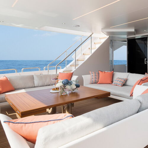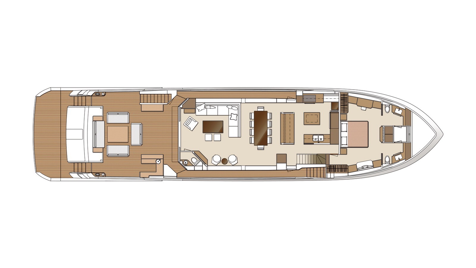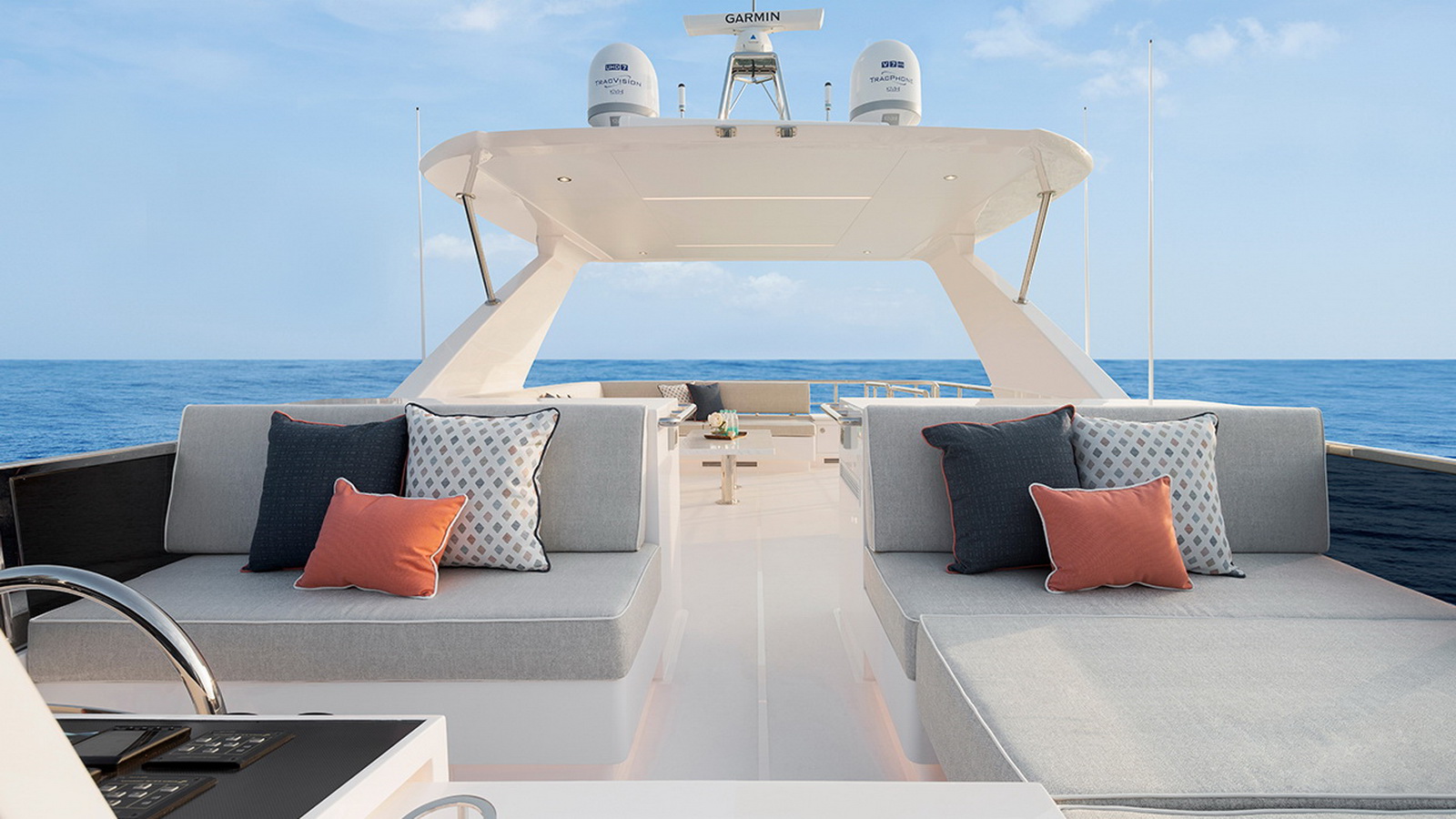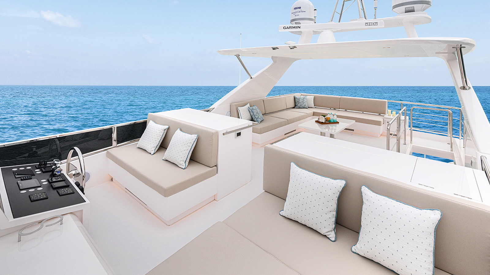 The Tri-Deck layout option offers a lightweight open flybridge equipped with a helm and seating area atop the bridge deck, which features a forward wheelhouse, interior skylounge with dayhead and bar and jacuzzi aft.