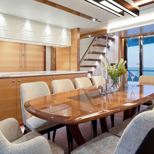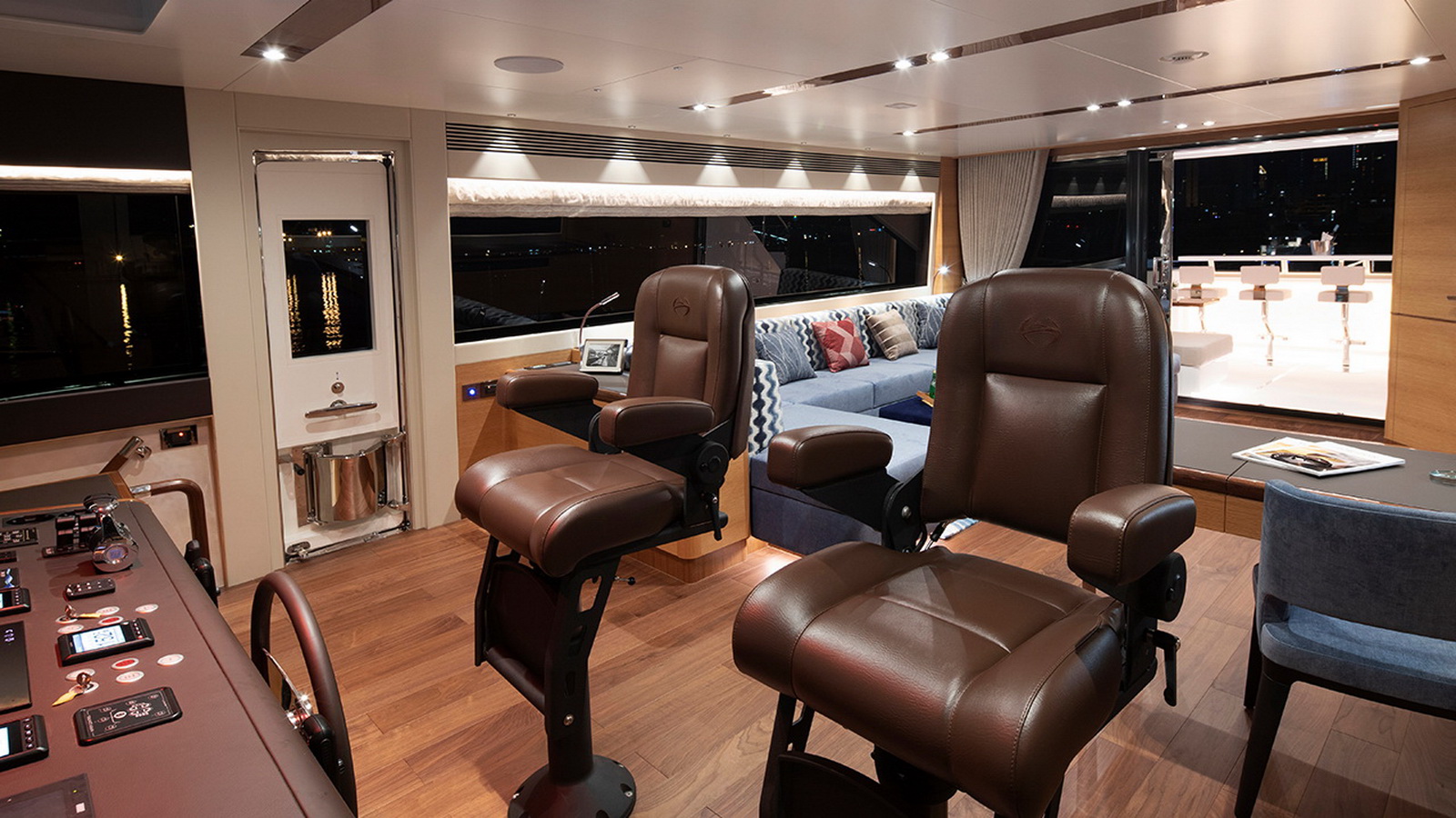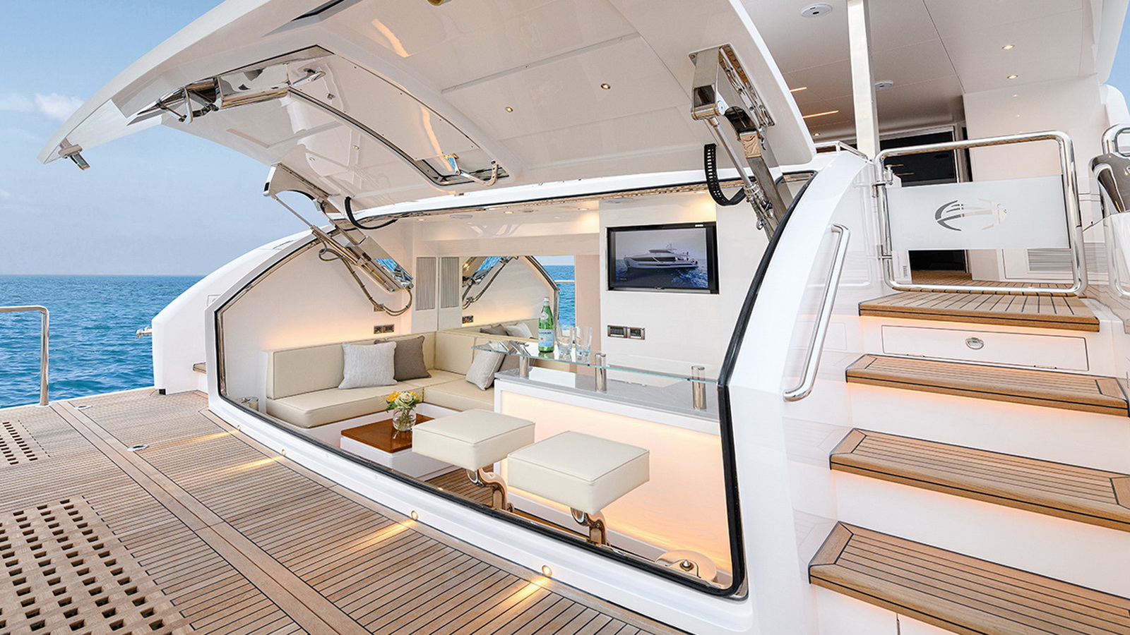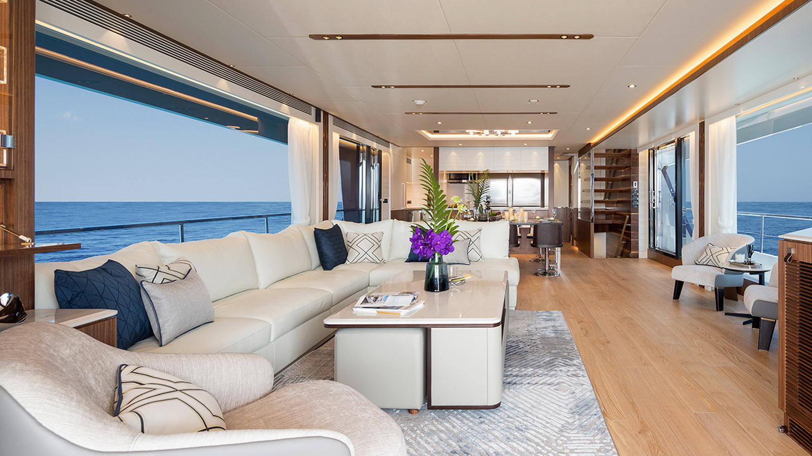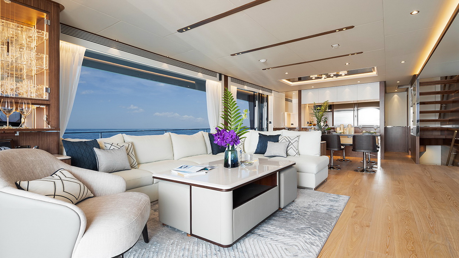 The Tri-Deck layout option offers a lightweight open flybridge equipped with a helm and seating area atop the bridge deck, which features a forward wheelhouse, interior skylounge with dayhead and bar and jacuzzi aft.