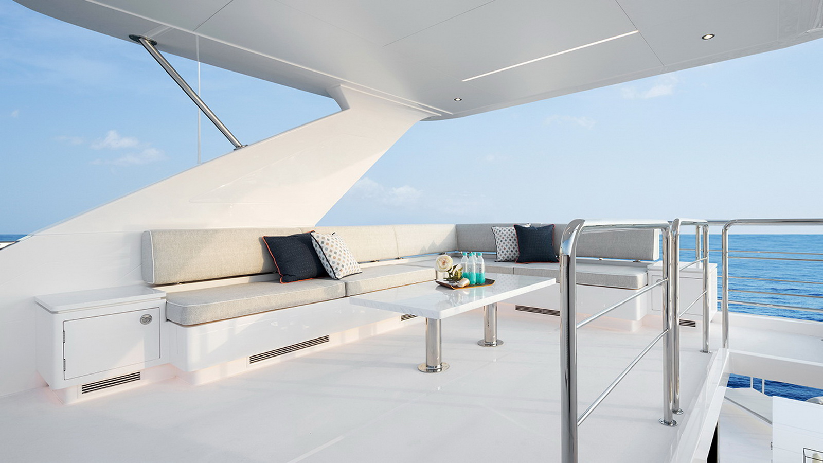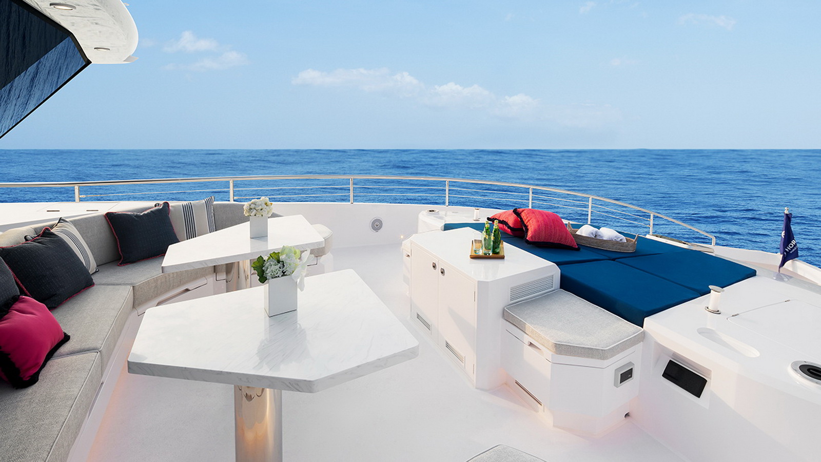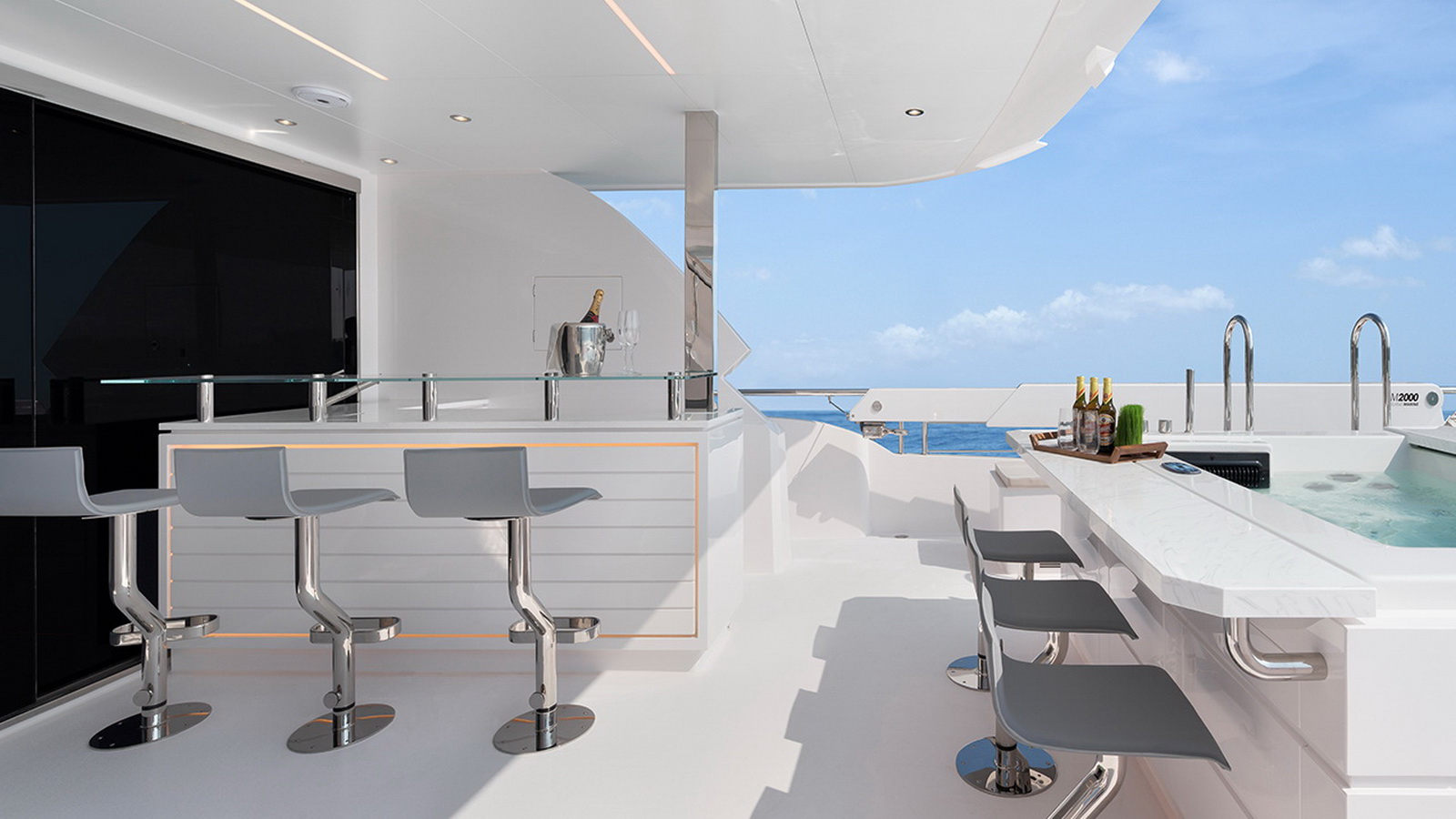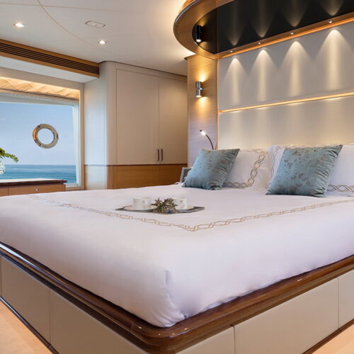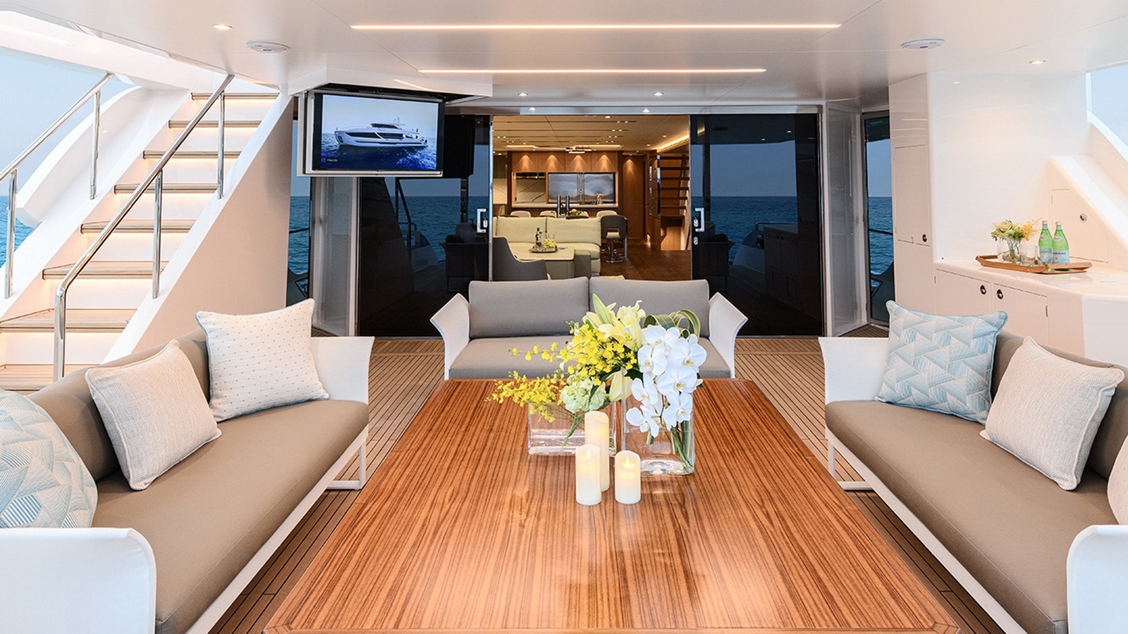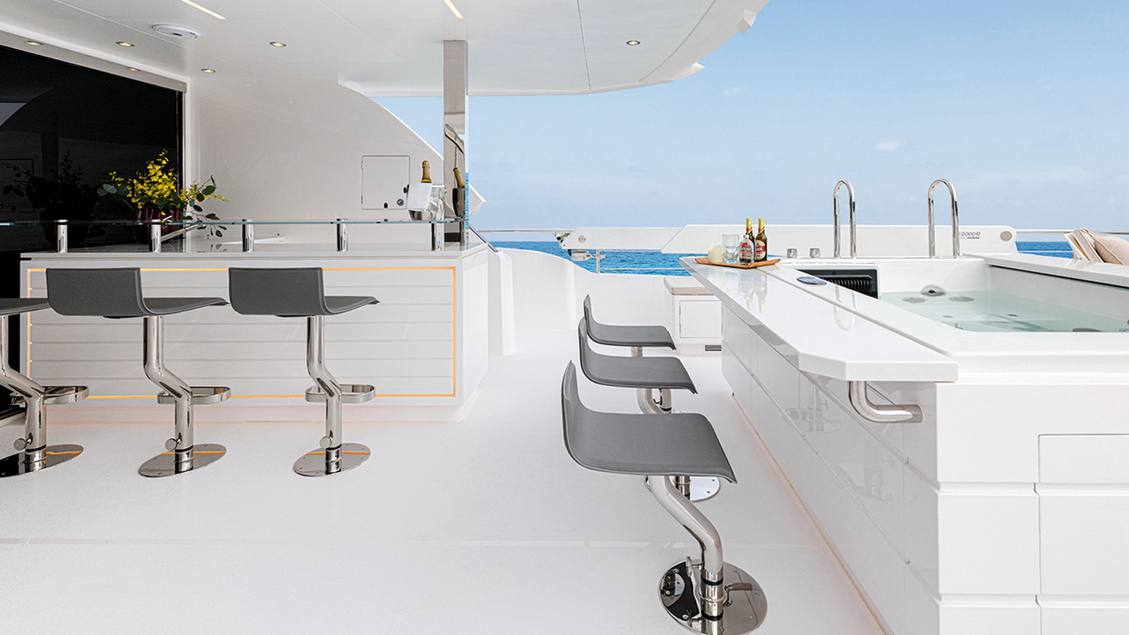 The Tri-Deck layout option offers a lightweight open flybridge equipped with a helm and seating area atop the bridge deck, which features a forward wheelhouse, interior skylounge with dayhead and bar and jacuzzi aft.
