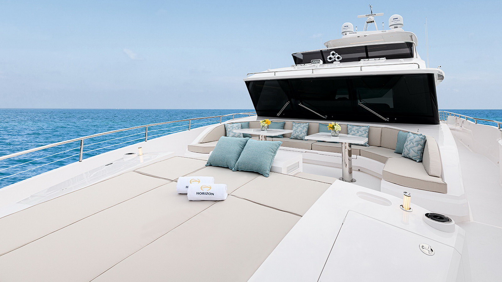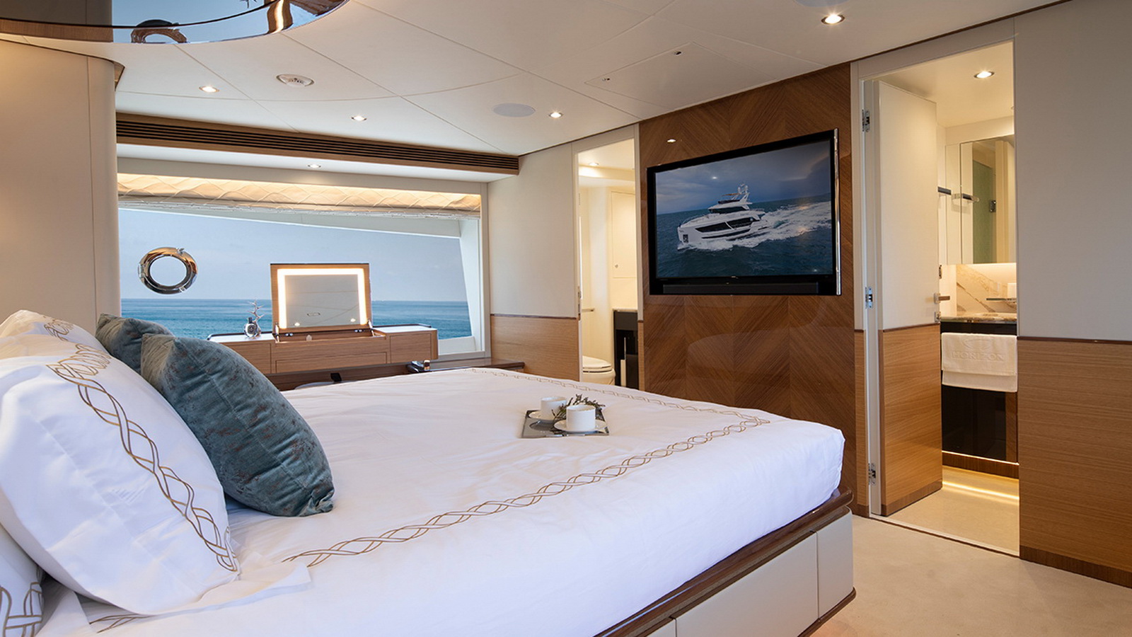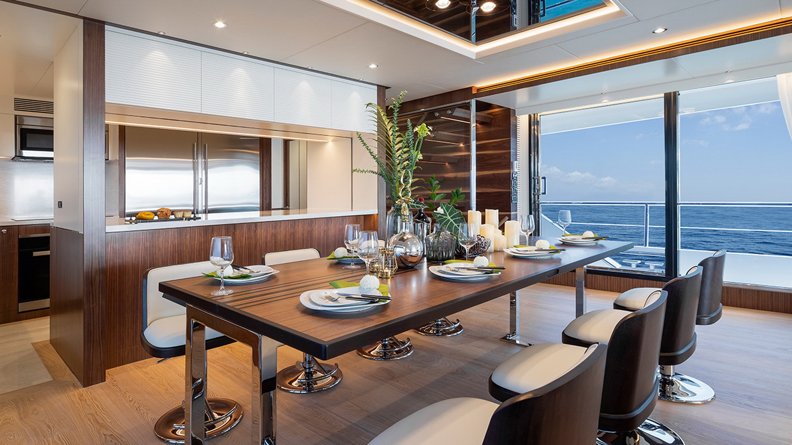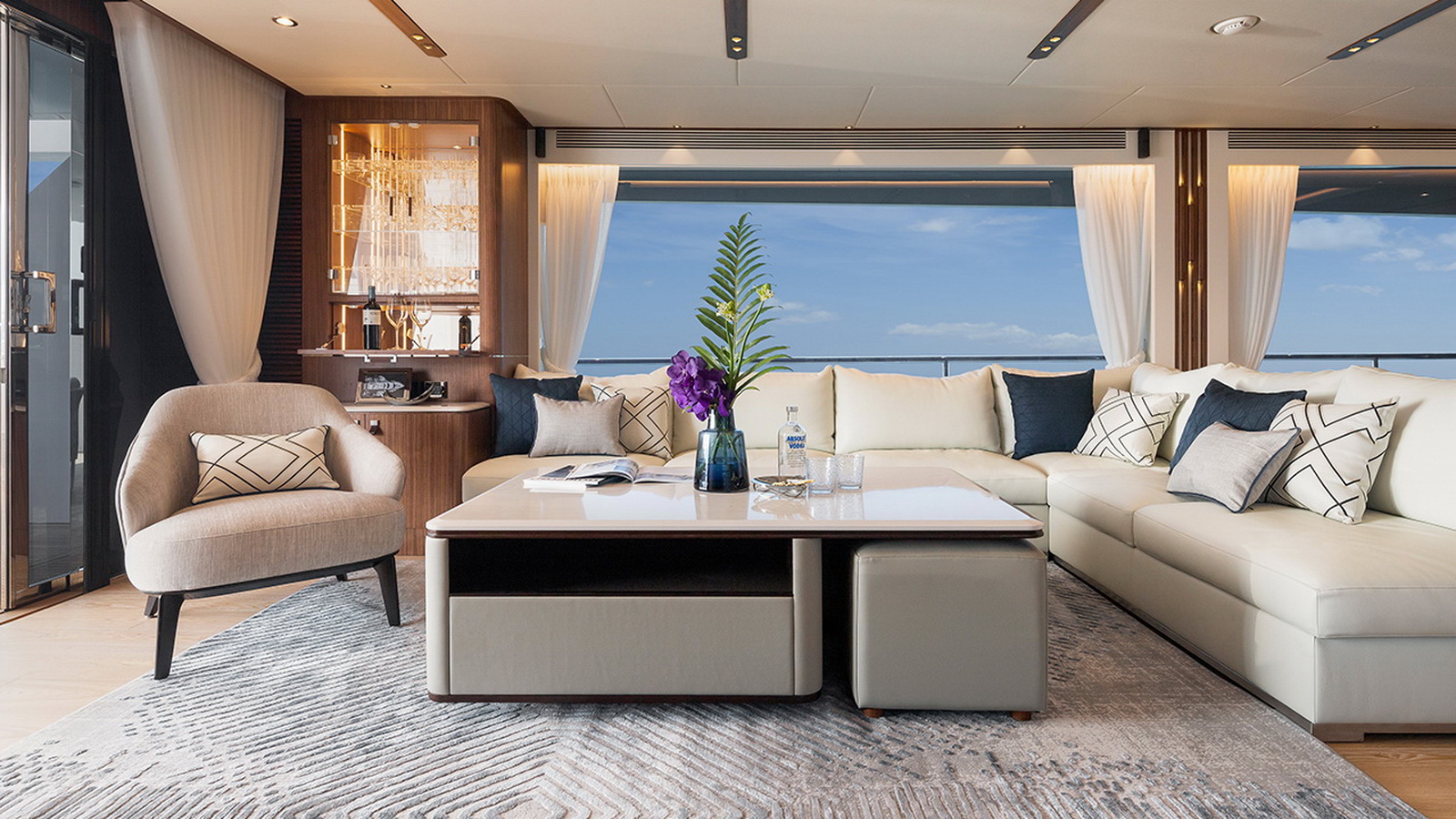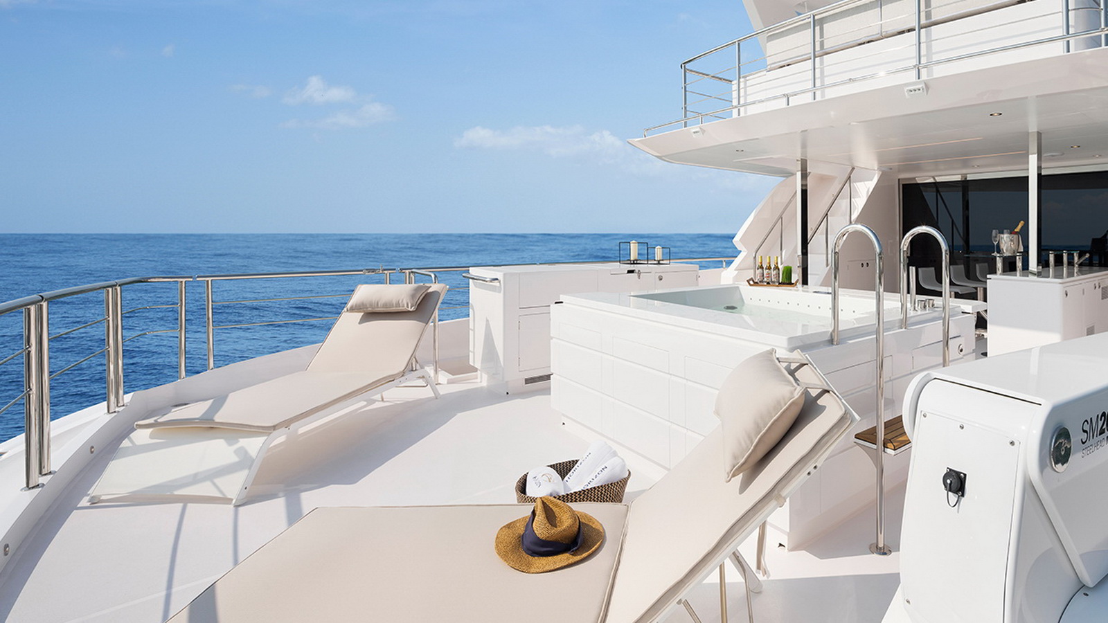 The Tri-Deck layout option offers a lightweight open flybridge equipped with a helm and seating area atop the bridge deck, which features a forward wheelhouse, interior skylounge with dayhead and bar and jacuzzi aft.