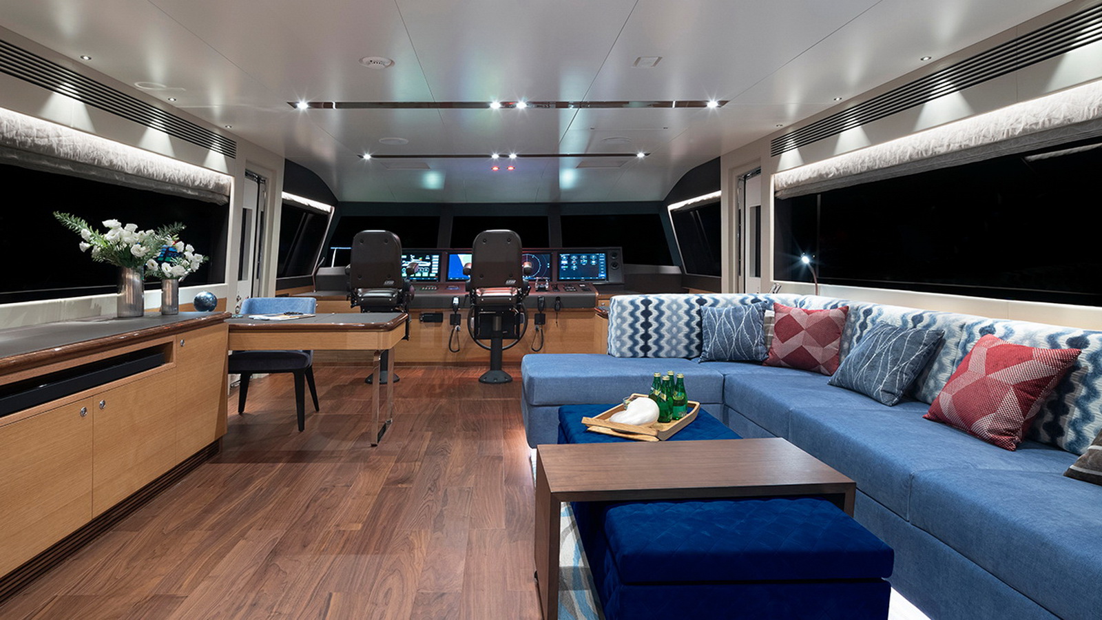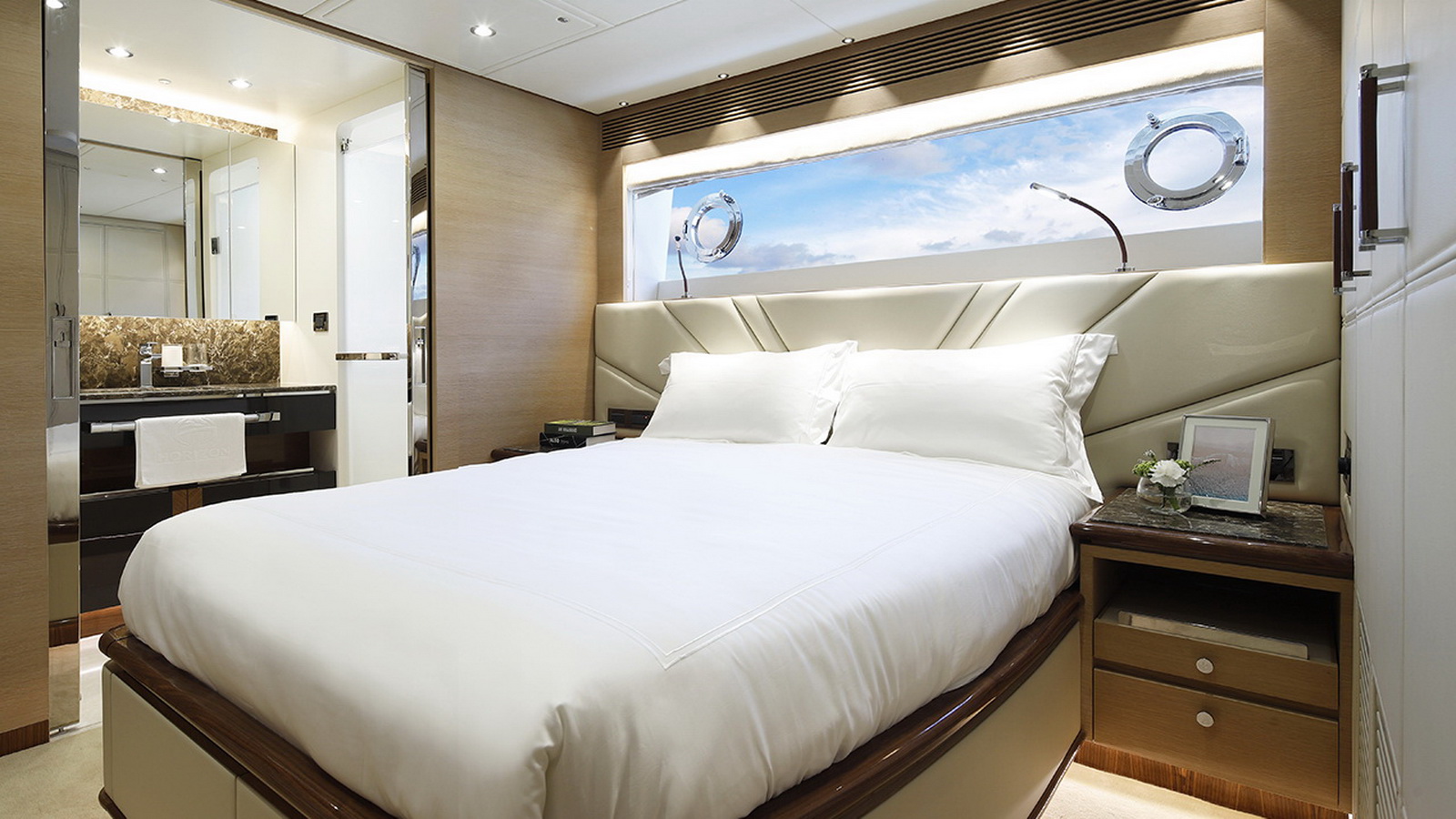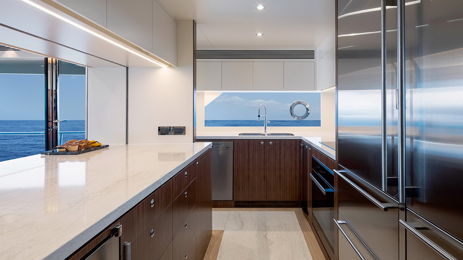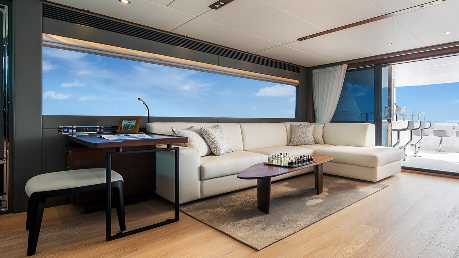 The Tri-Deck layout option offers a lightweight open flybridge equipped with a helm and seating area atop the bridge deck, which features a forward wheelhouse, interior skylounge with dayhead and bar and jacuzzi aft.