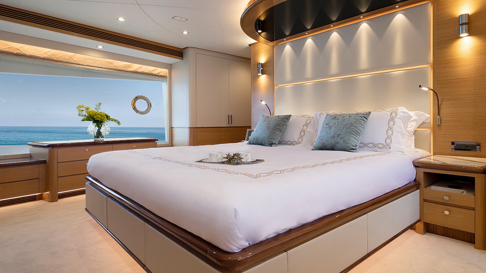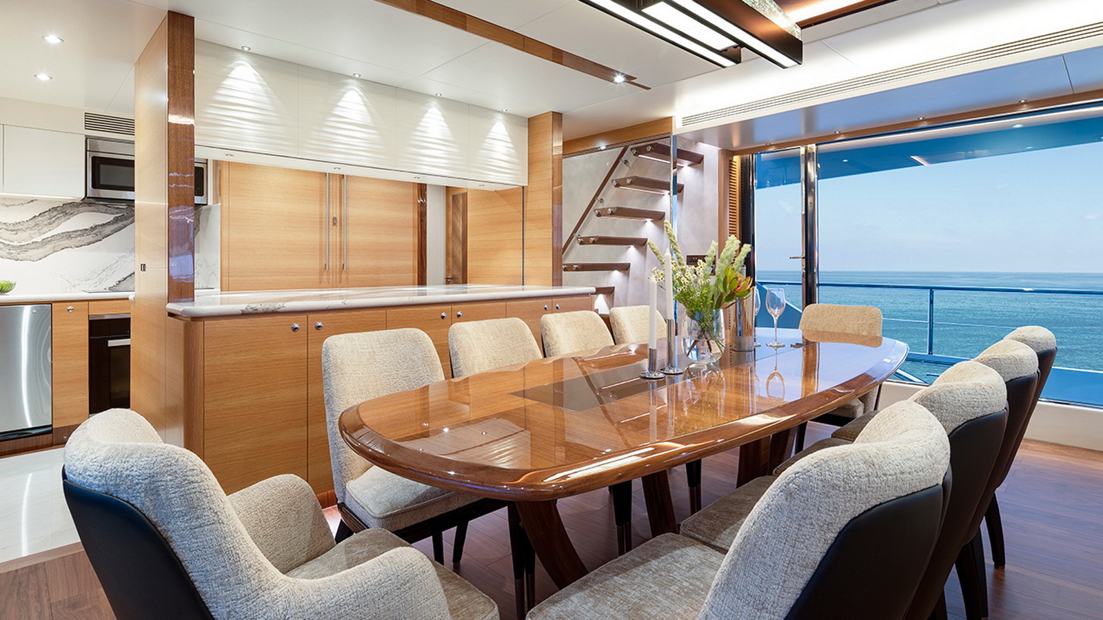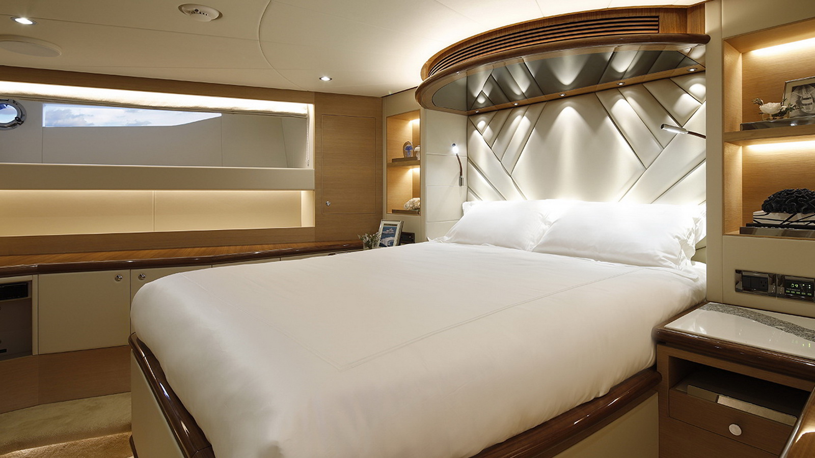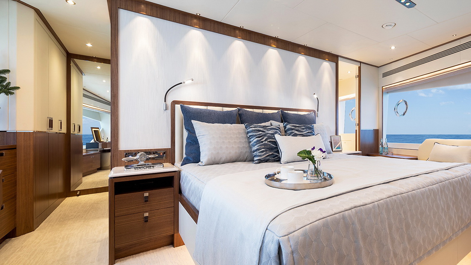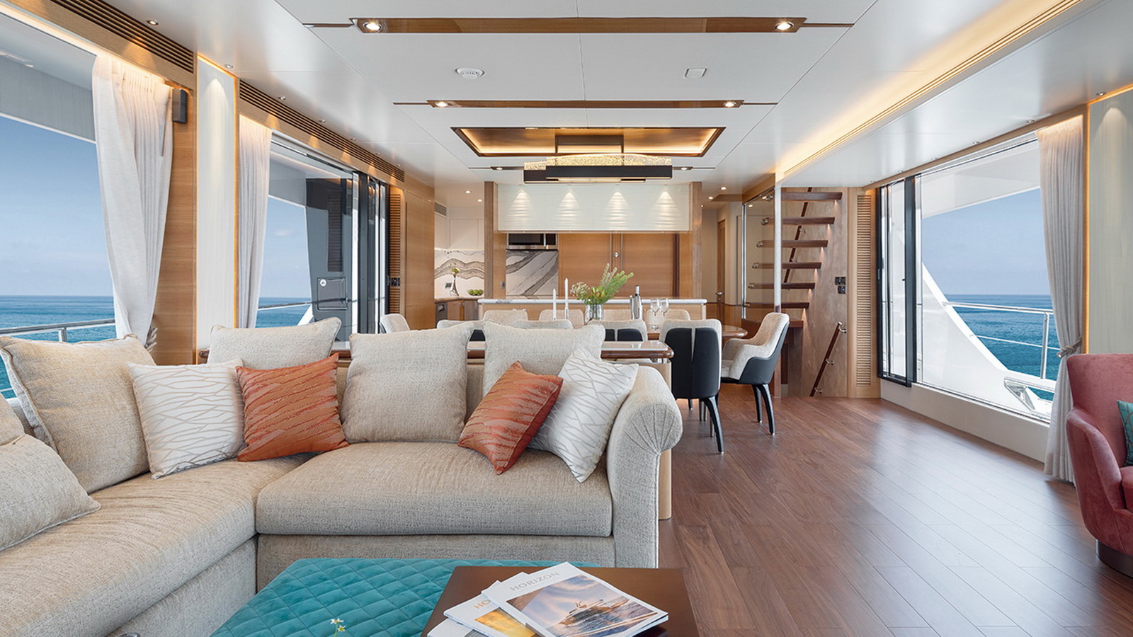 The Tri-Deck layout option offers a lightweight open flybridge equipped with a helm and seating area atop the bridge deck, which features a forward wheelhouse, interior skylounge with dayhead and bar and jacuzzi aft.