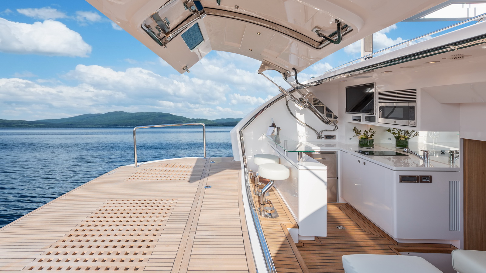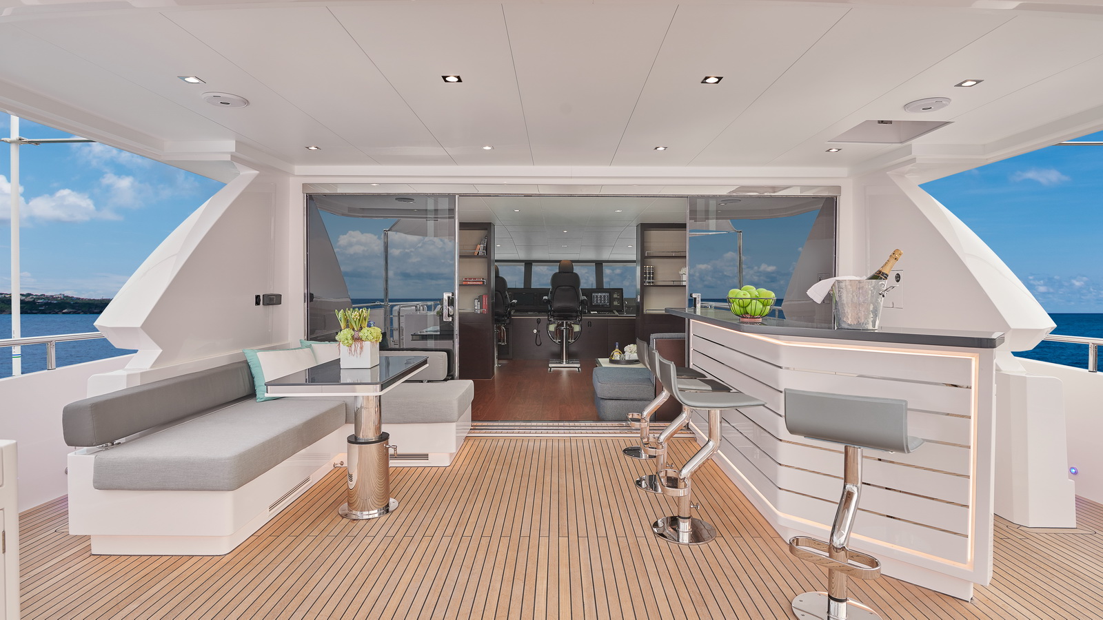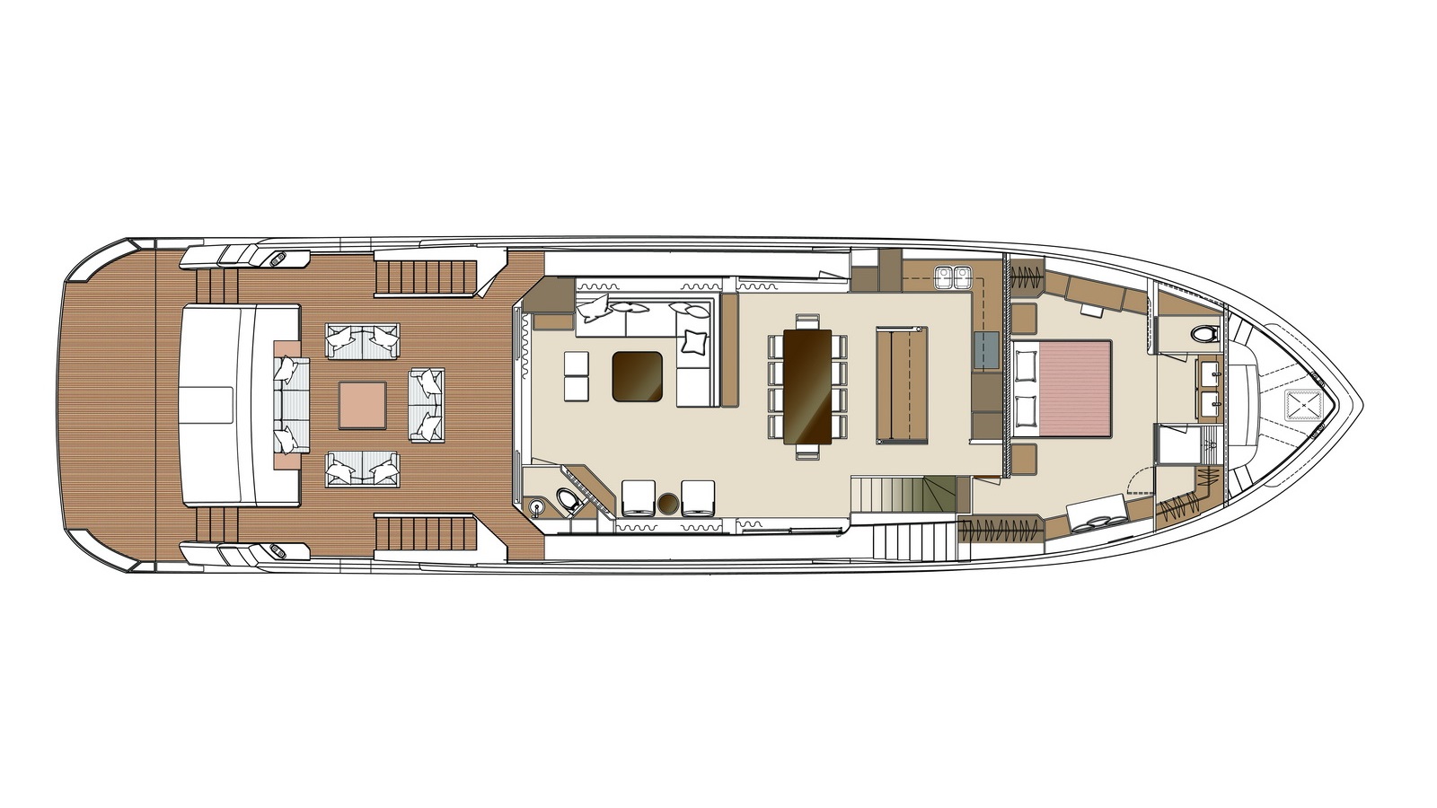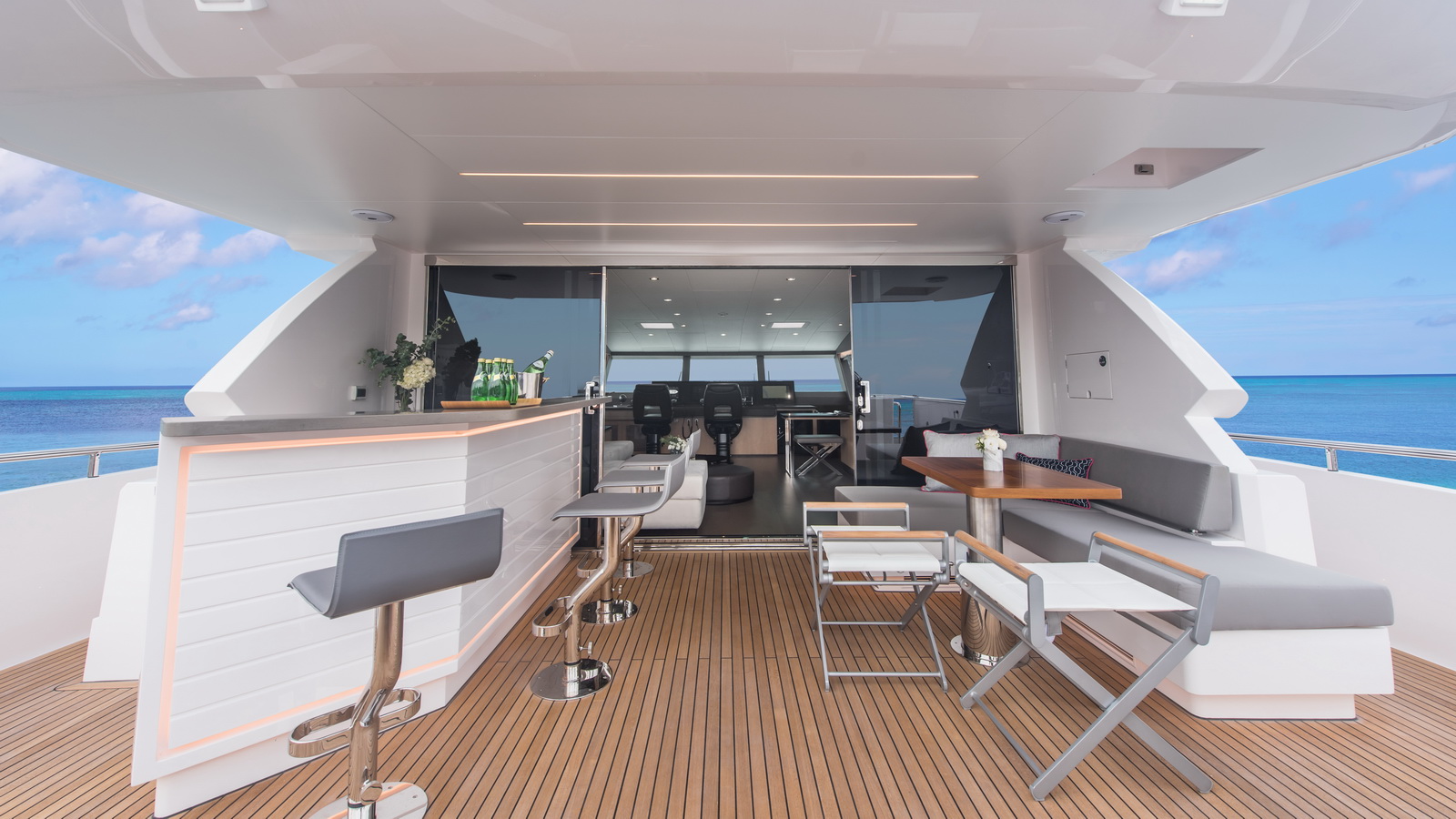A walkaround design on the bridge deck affords ease of access between the boat deck and forward seating areas, which can be customized with multiple features from refrigeration to storage, sun shades and more.