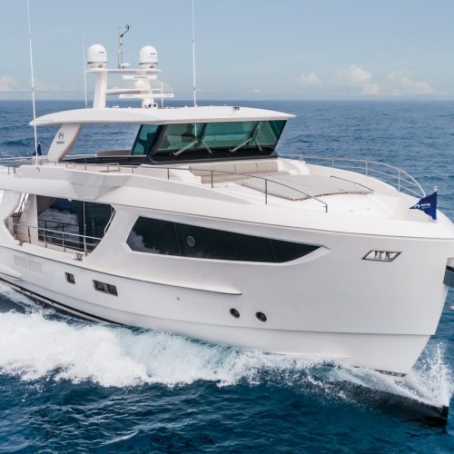 Contemporary style lines, versatility of space, and well planned interior and exterior entertaining areas are at the heart of this latest design. The smaller sister to the successful FD85 motoryacht, the brand new Horizon FD80 maximizes interior volume with unique floor-to-ceiling glass sections that invite plenty of natural light and spectacular views into the salon, dining area, and on-deck master stateroom.