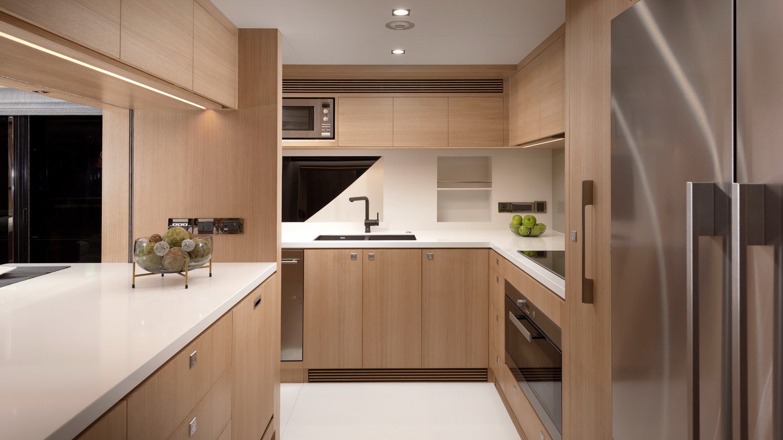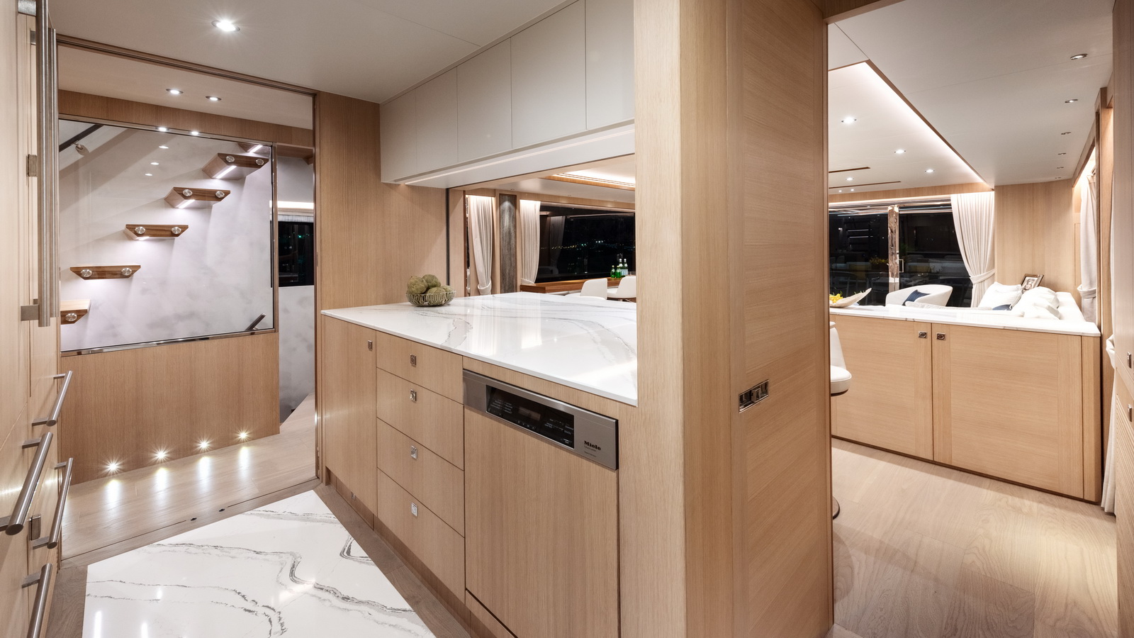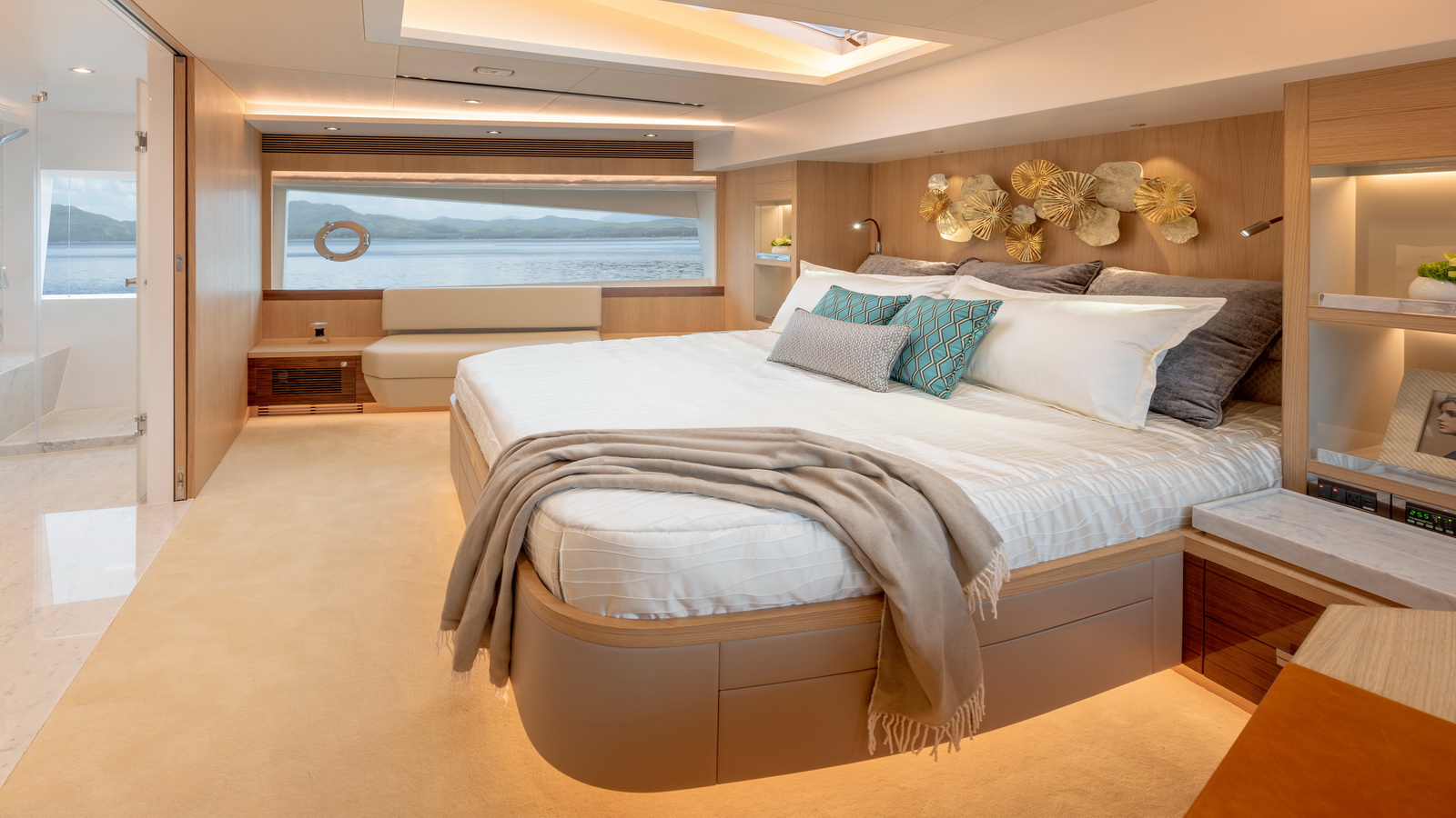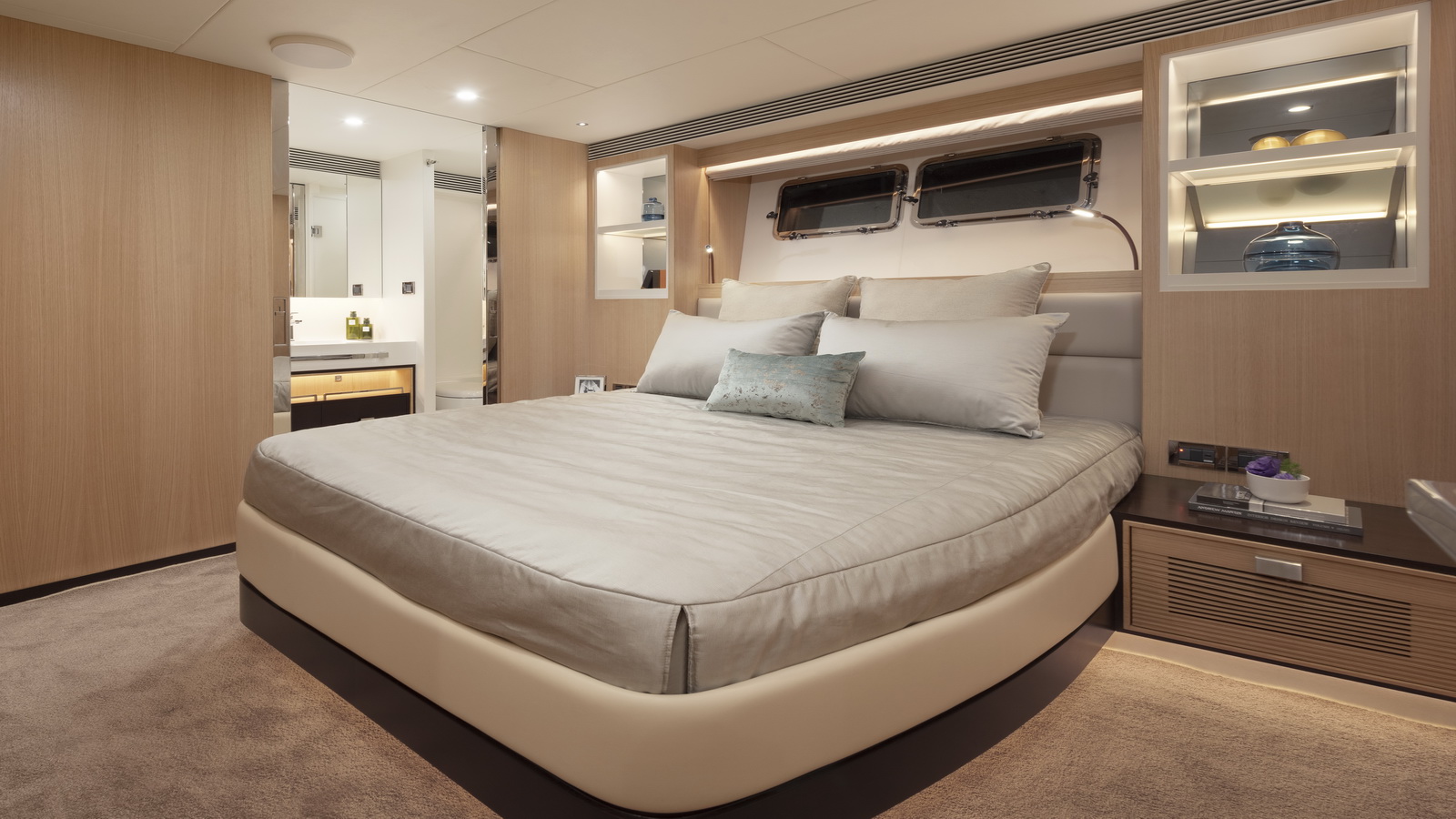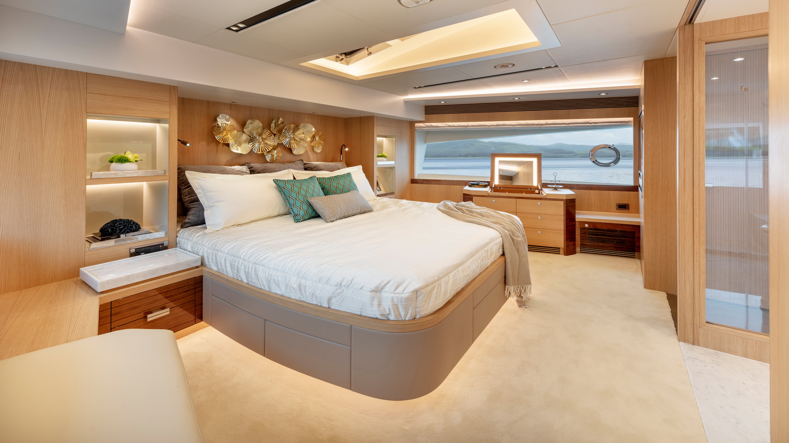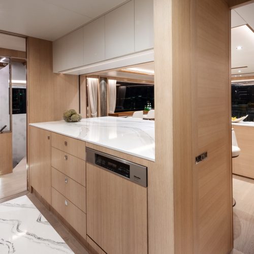 Below deck, three additional staterooms including two VIPs echo the feeling of spaciousness while a window in the garage extends natural light into the beach club on this level. Available in a Skyline or Open Bridge version, the FD80 offers functional outdoor spaces that rival those found on 90ft-plus motor yachts.