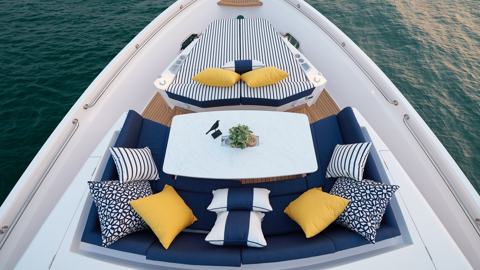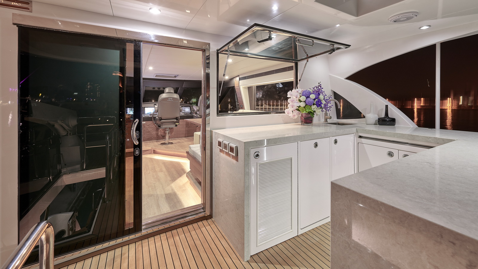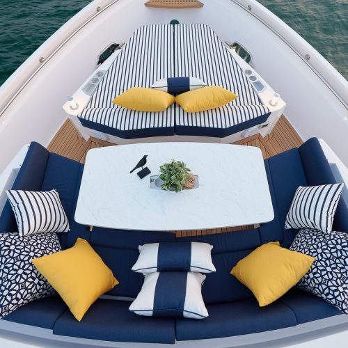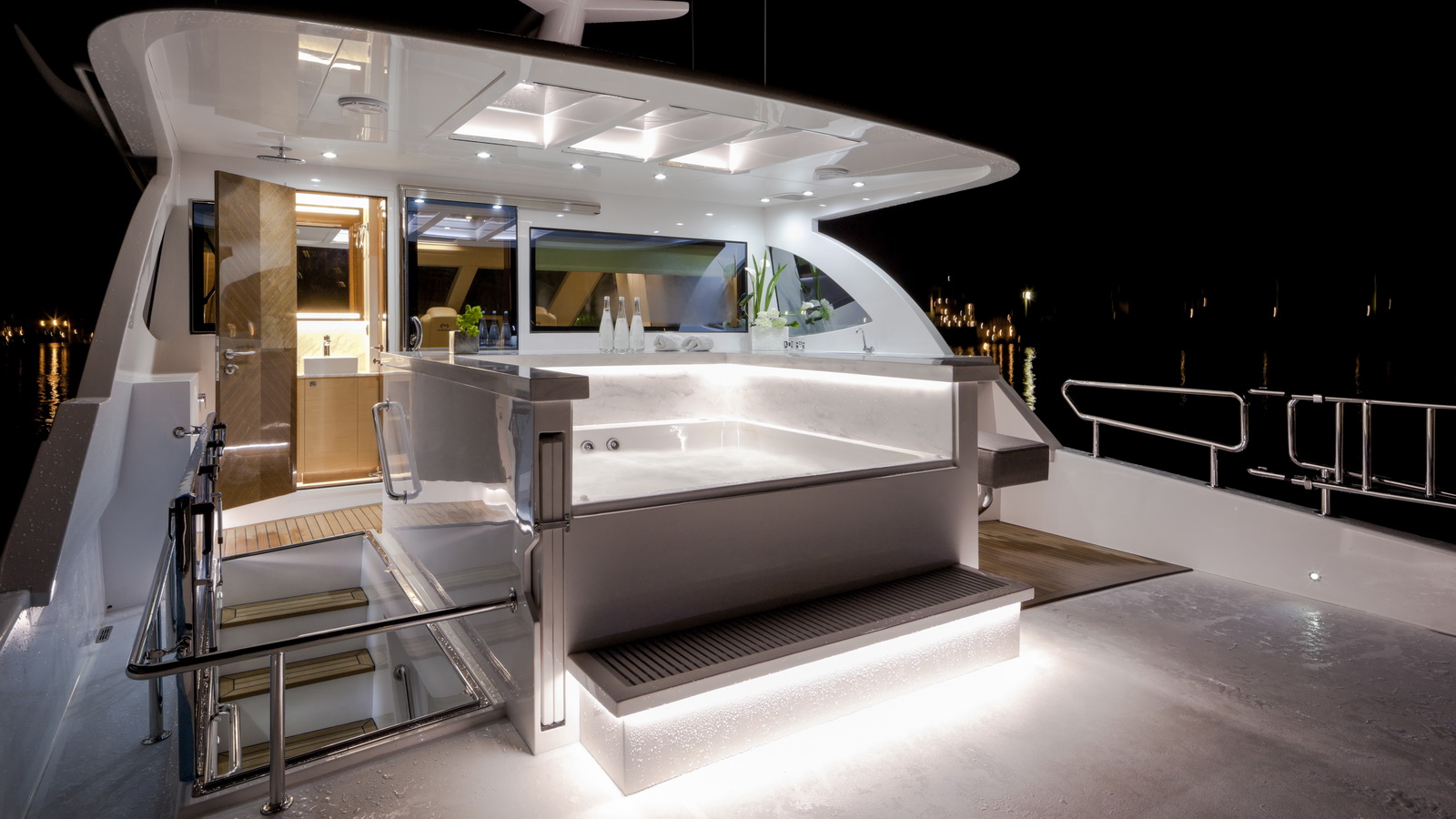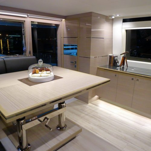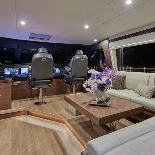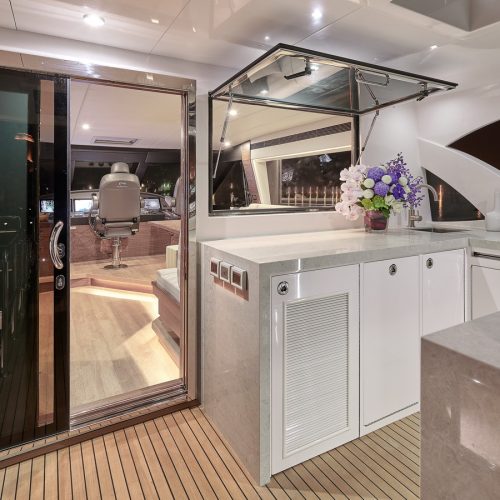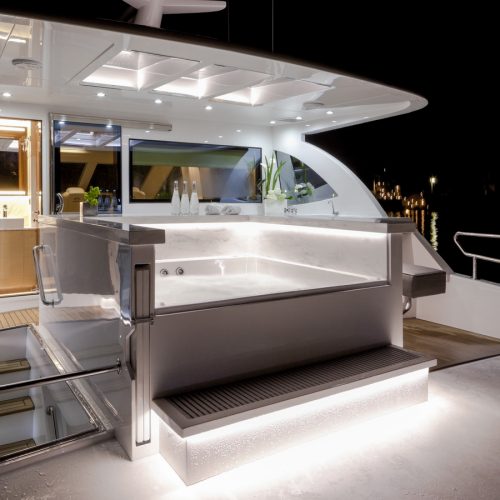 Entertaining with family and friends becomes a true pleasure with a creative foredeck seating area, exterior bar on the boat deck, and an incredible aft deck for luxurious, shaded relaxation.